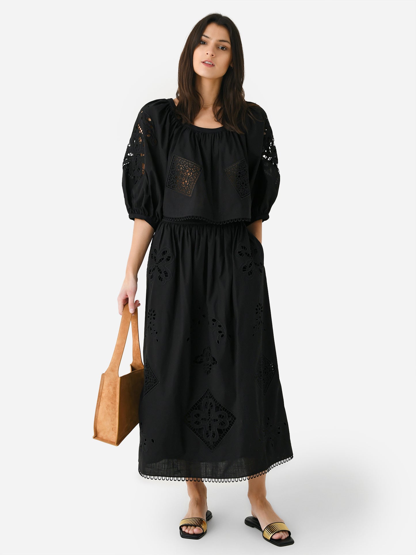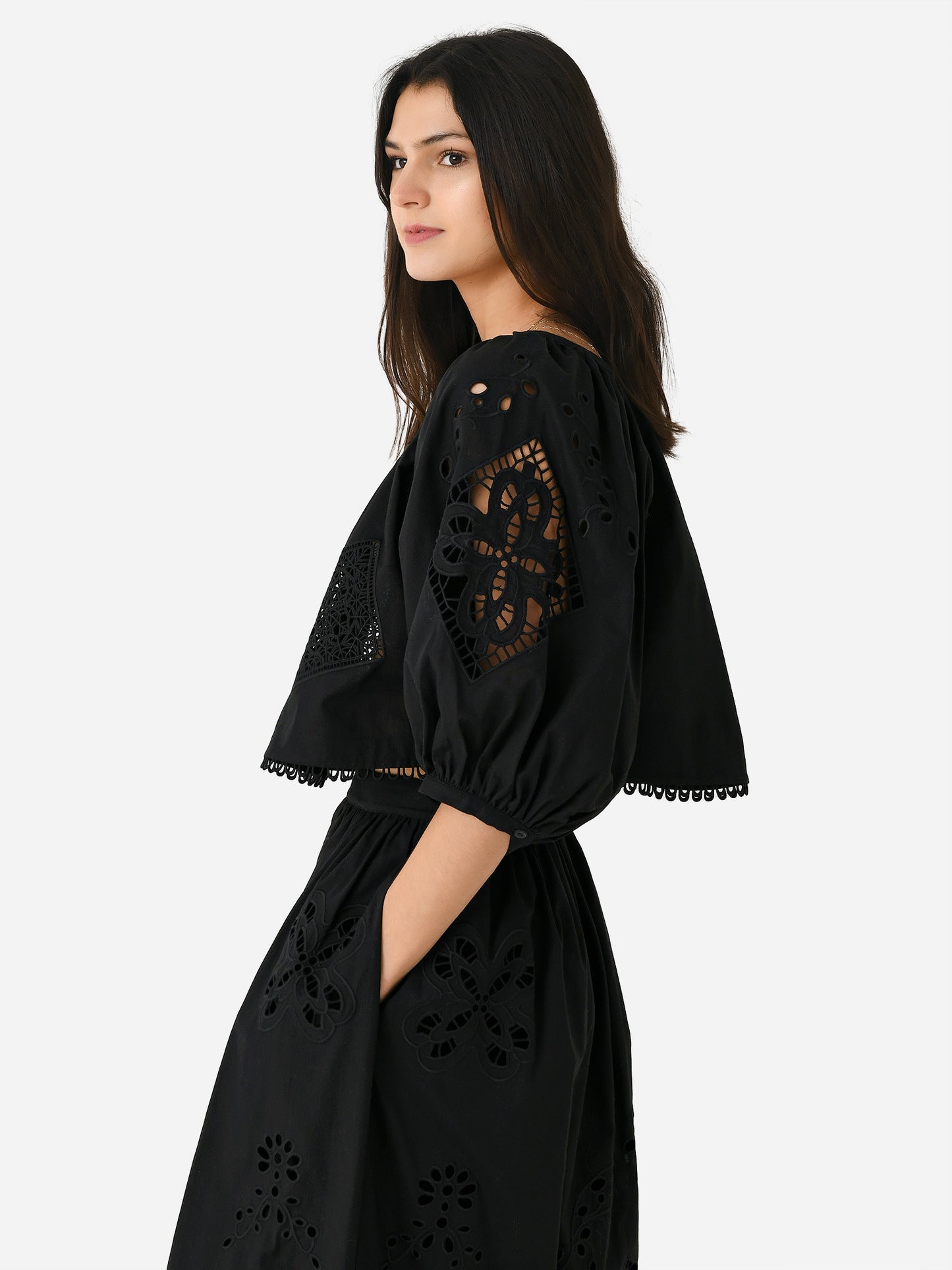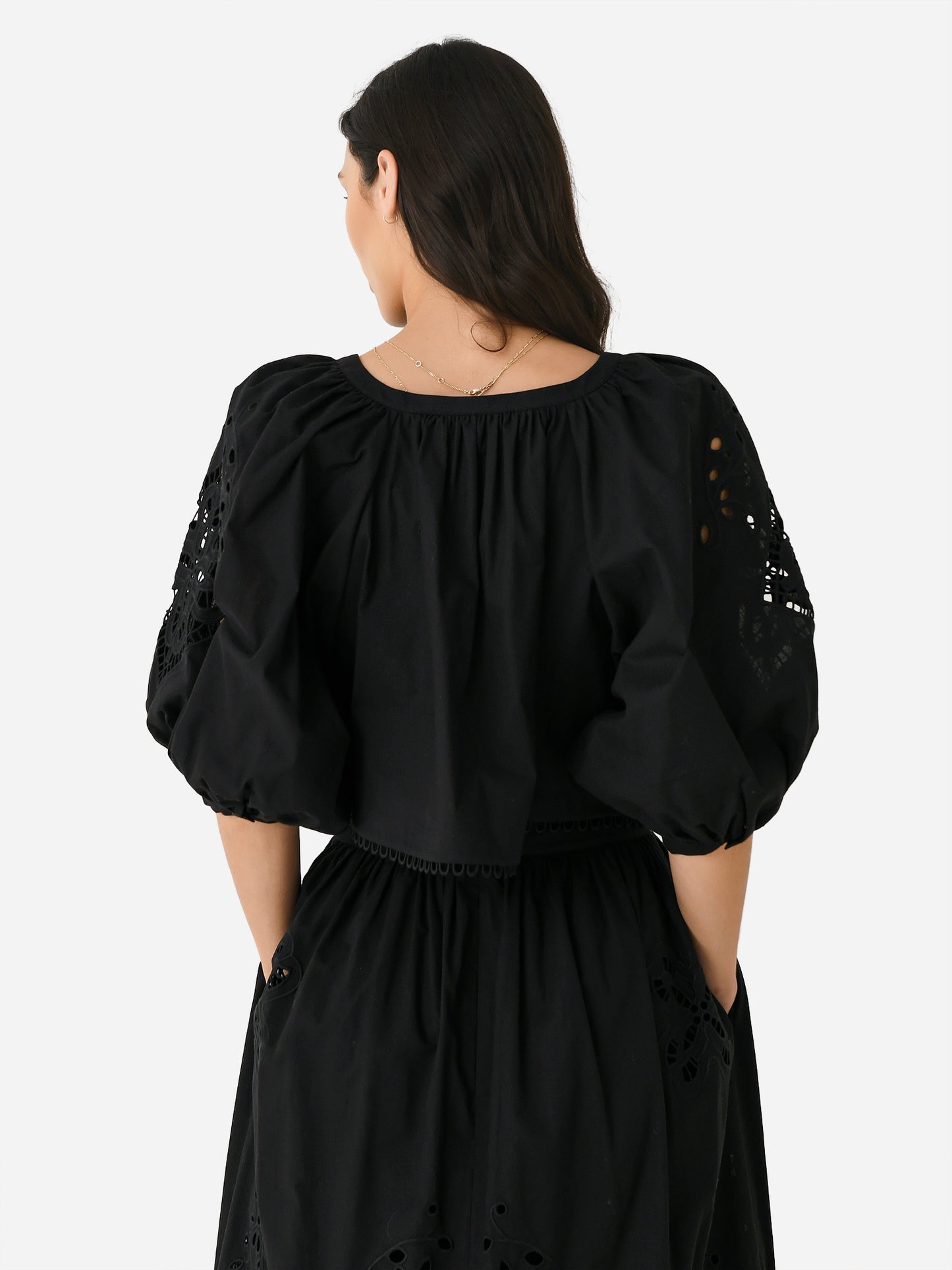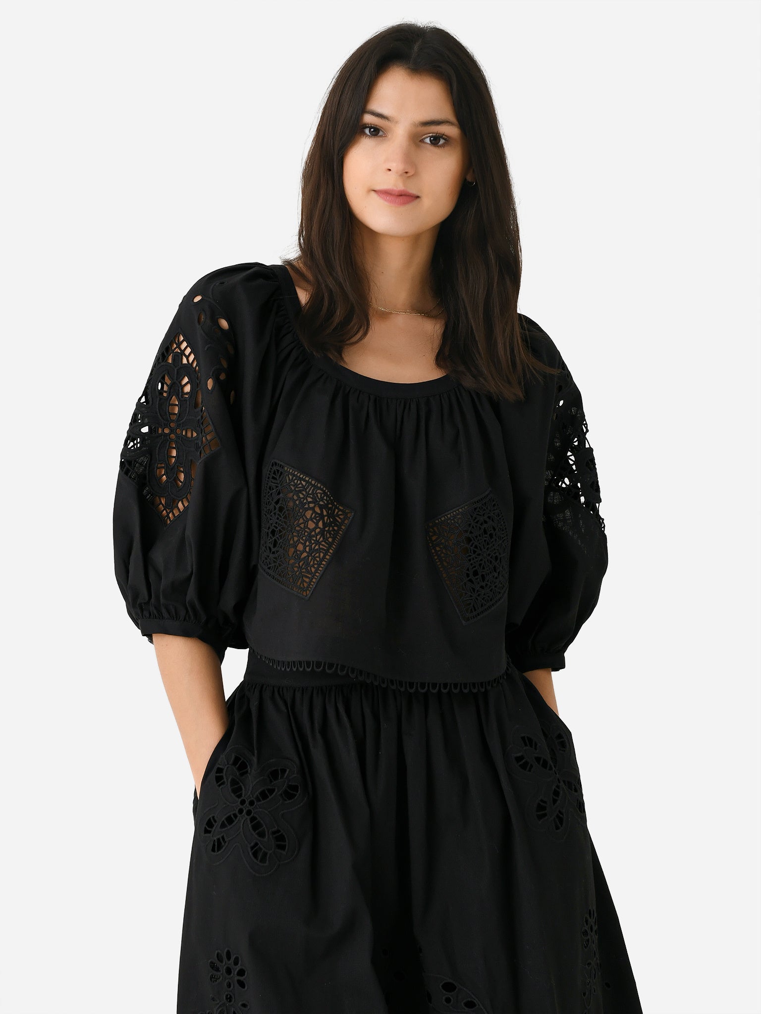 An eyelet lace blouse with puff sleeves and a cropped silhouette.