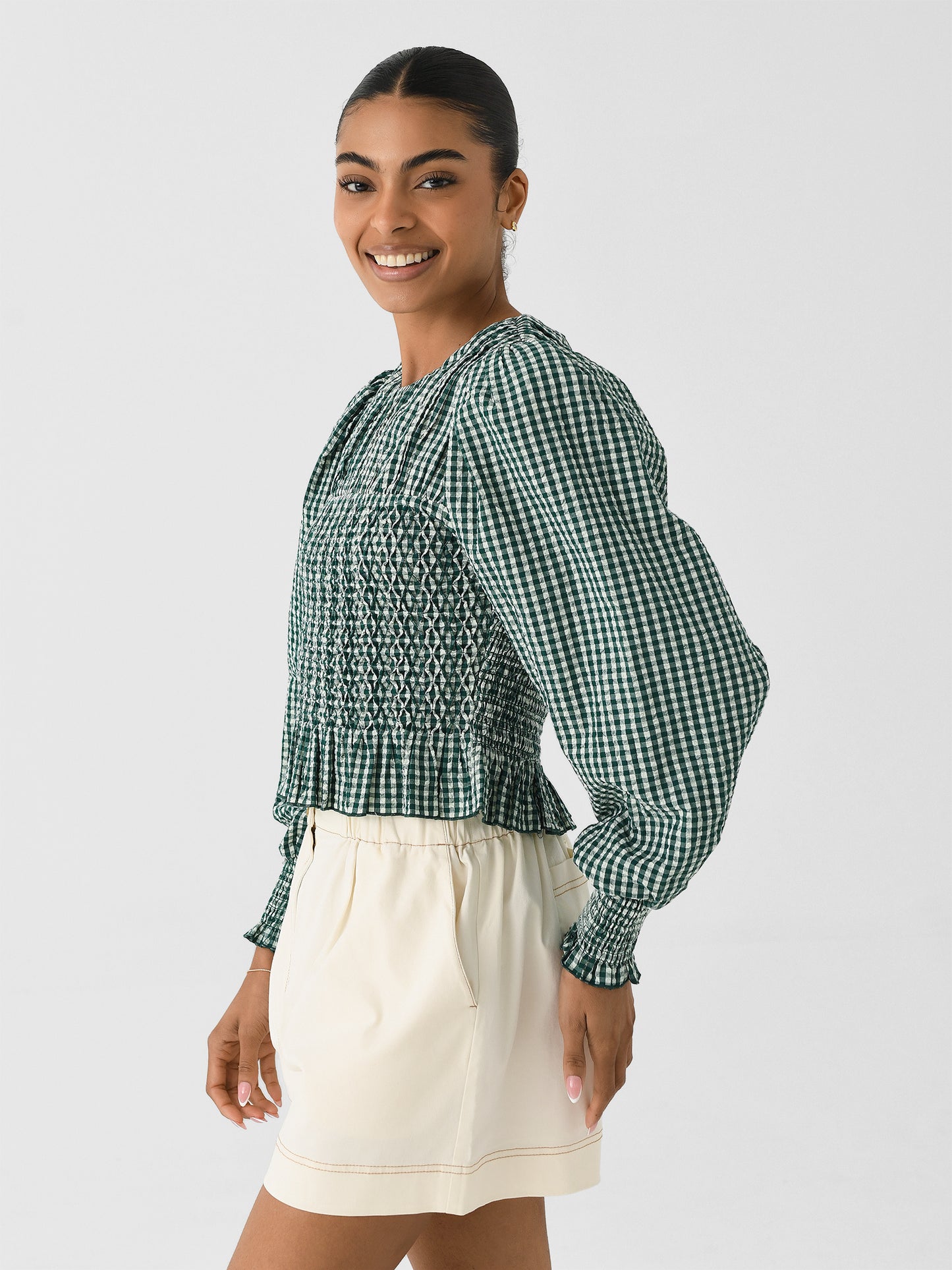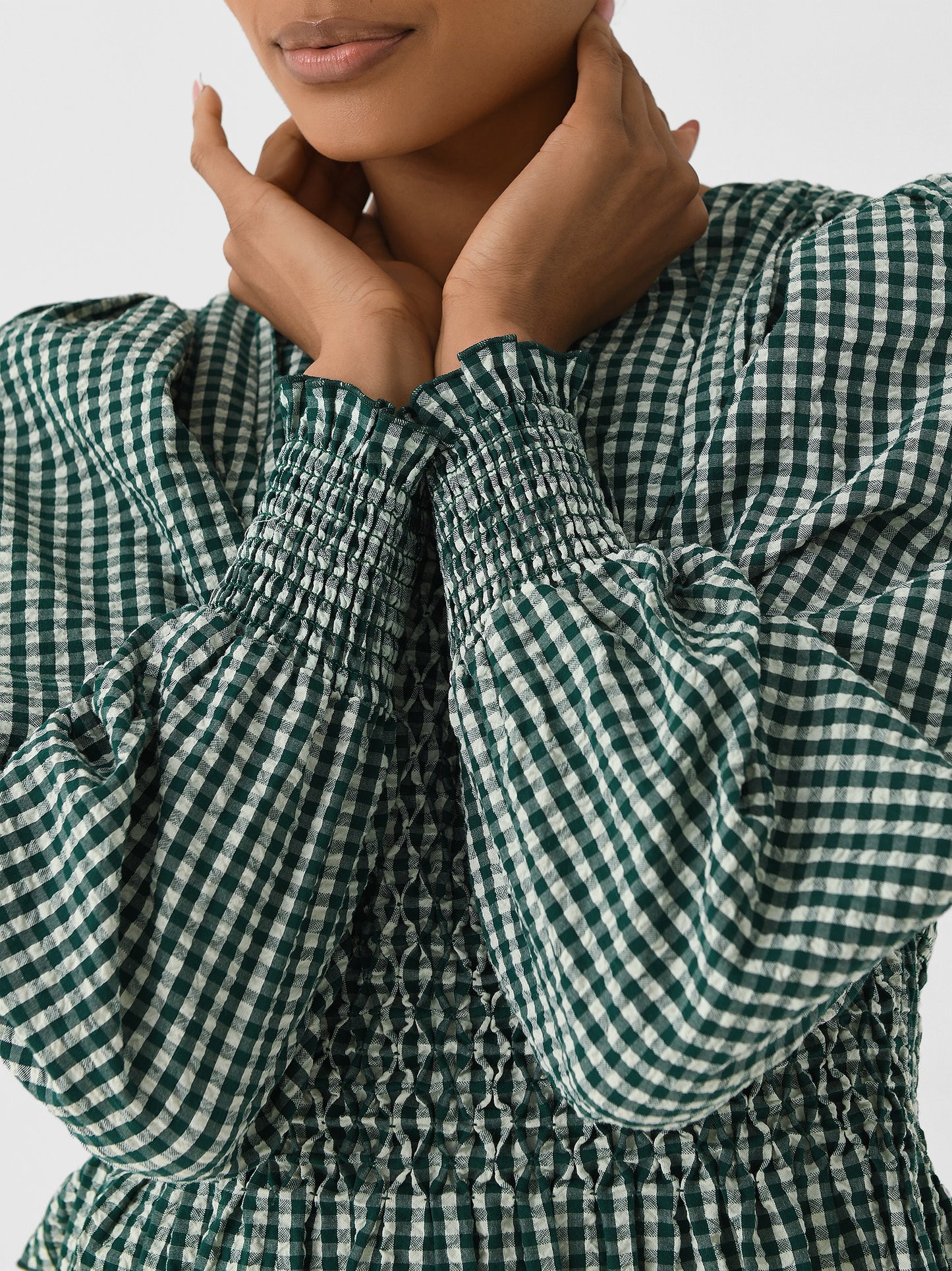 A gingham-printed blouse made from lightweight cotton seersucker fabric with puff sleeves, a smocked bodice, and a ruffled hem.