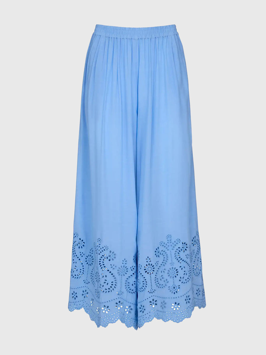 This breezy pant is a summer essential. The flowy, wide-leg silhouette and elasticated waistband offer relaxed comfort, while the crisp eyelet lace fabric and delicate scalloped hem lend a feminine touch. Whether you're unwinding by the water or sipping cocktails on the patio, this pant adds effortless elegance to any sun-soaked moment.