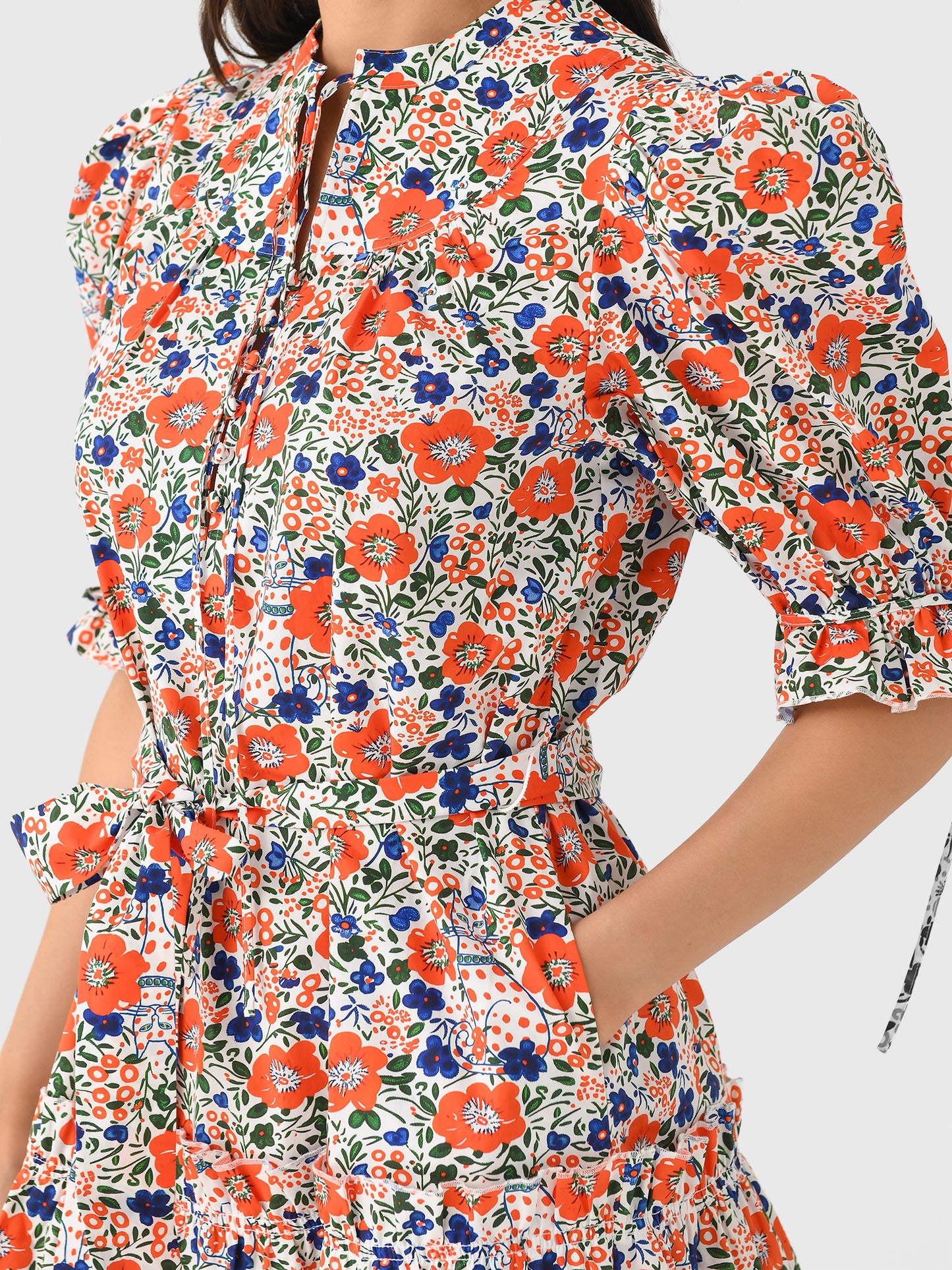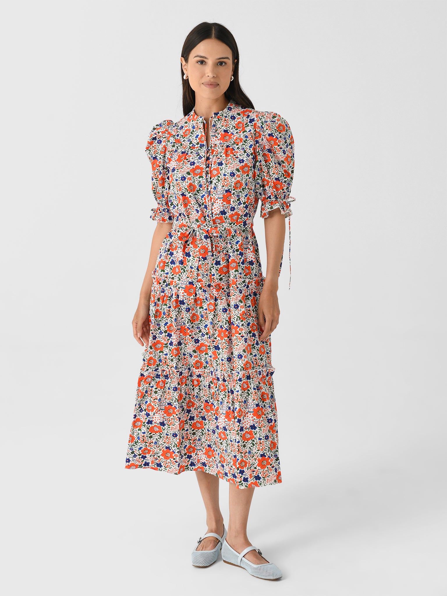 A sophisticated midi dress with puff sleeves, ruffled seams, and a whimsical floral print.