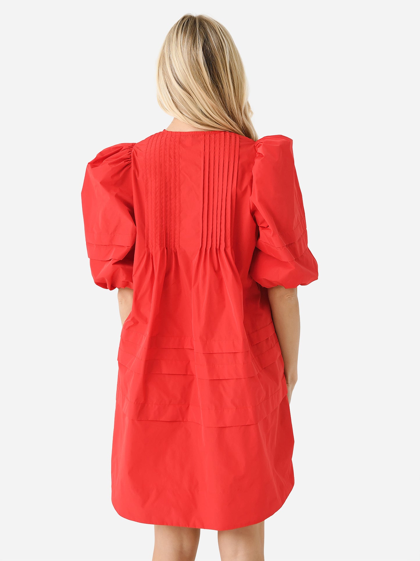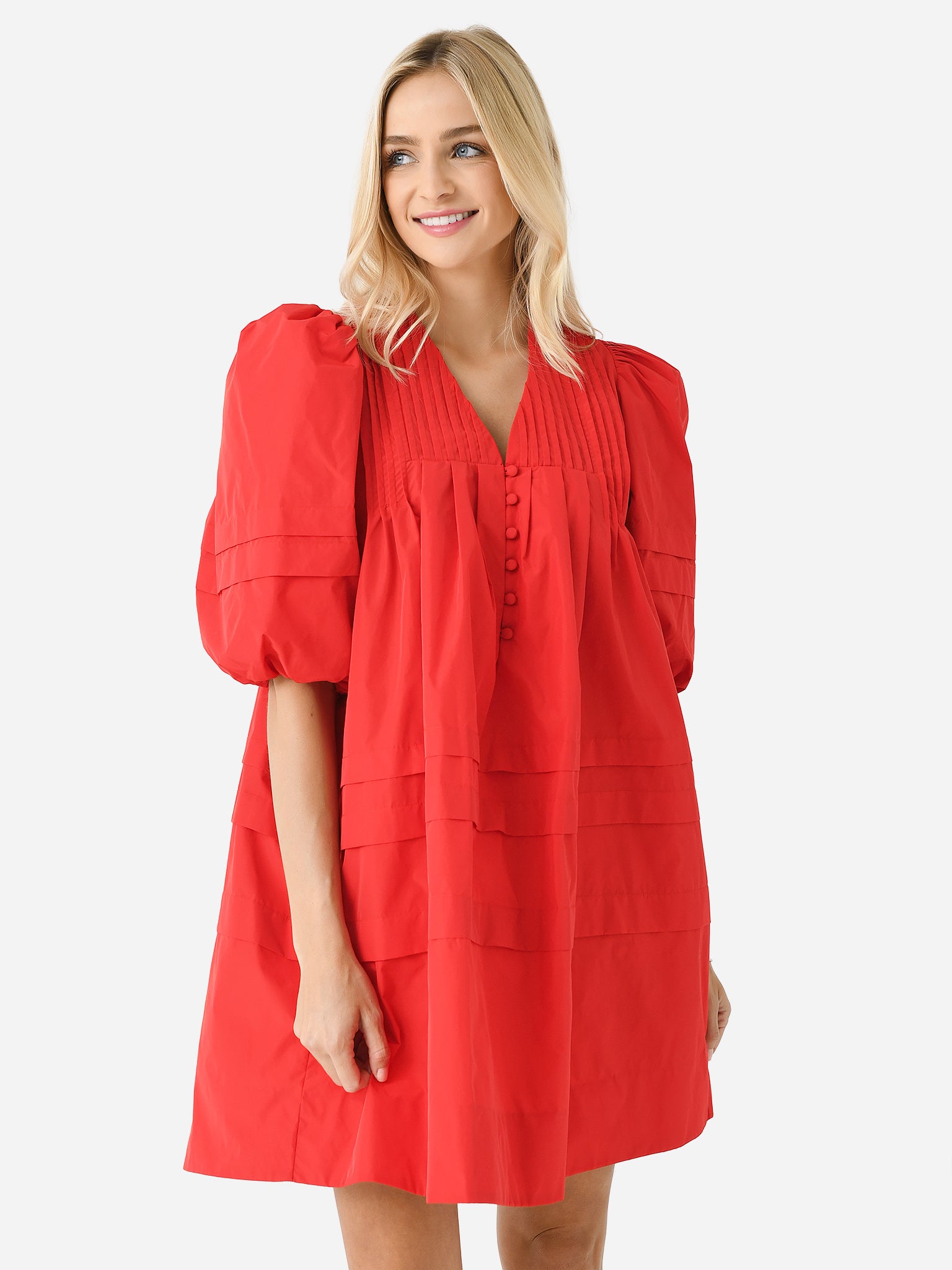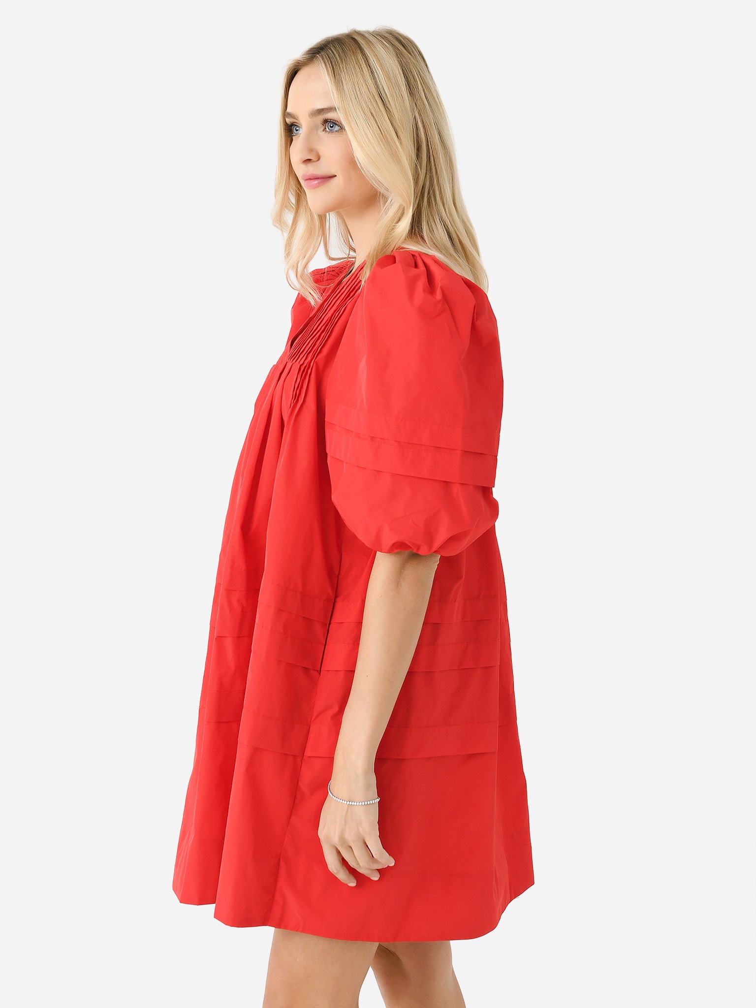 A feminine mini dress with pintucked detailing, tiered panels, and an oversized silhouette in a vibrant red color.