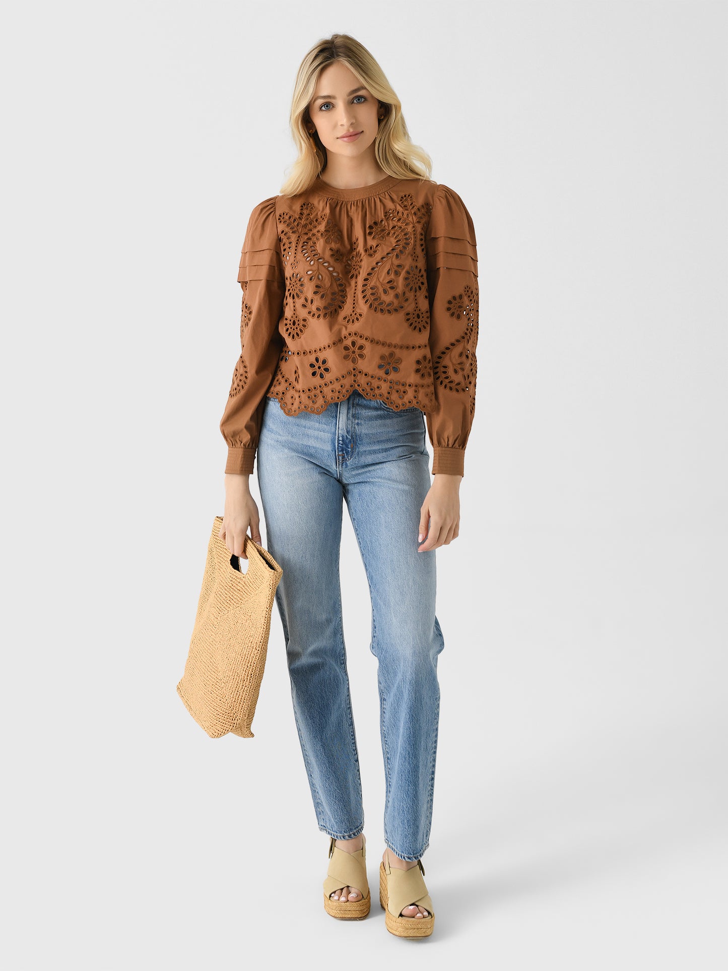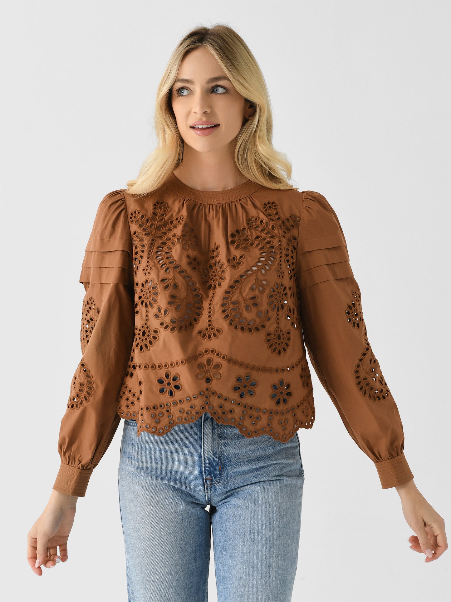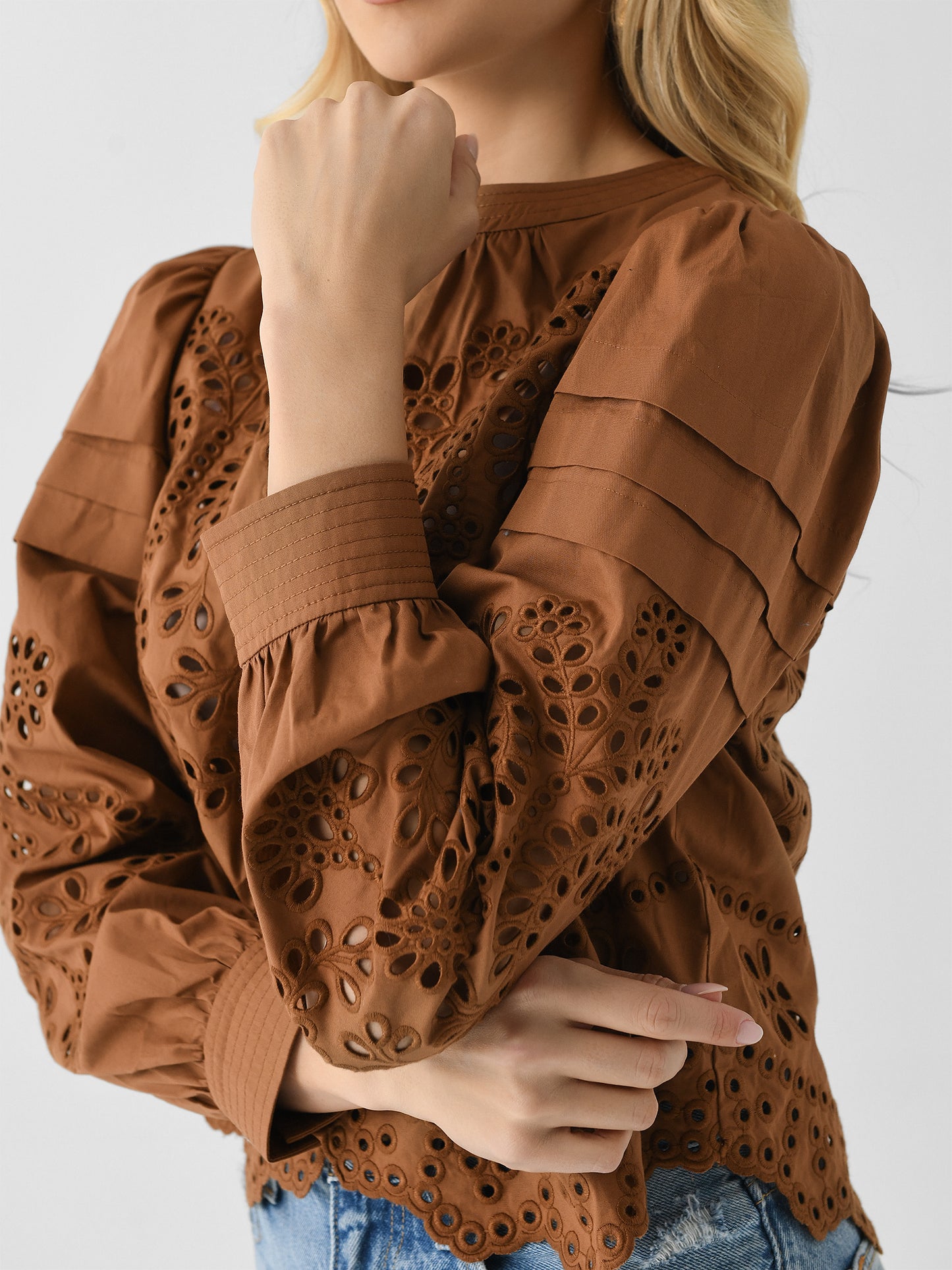 This elegant blouse is crafted from eyelet embroidered cotton and features full sleeves with button cuffs.