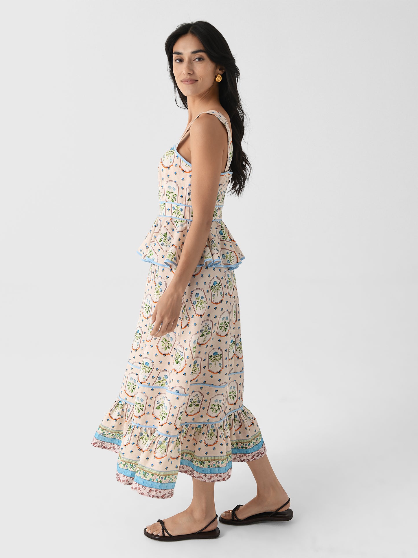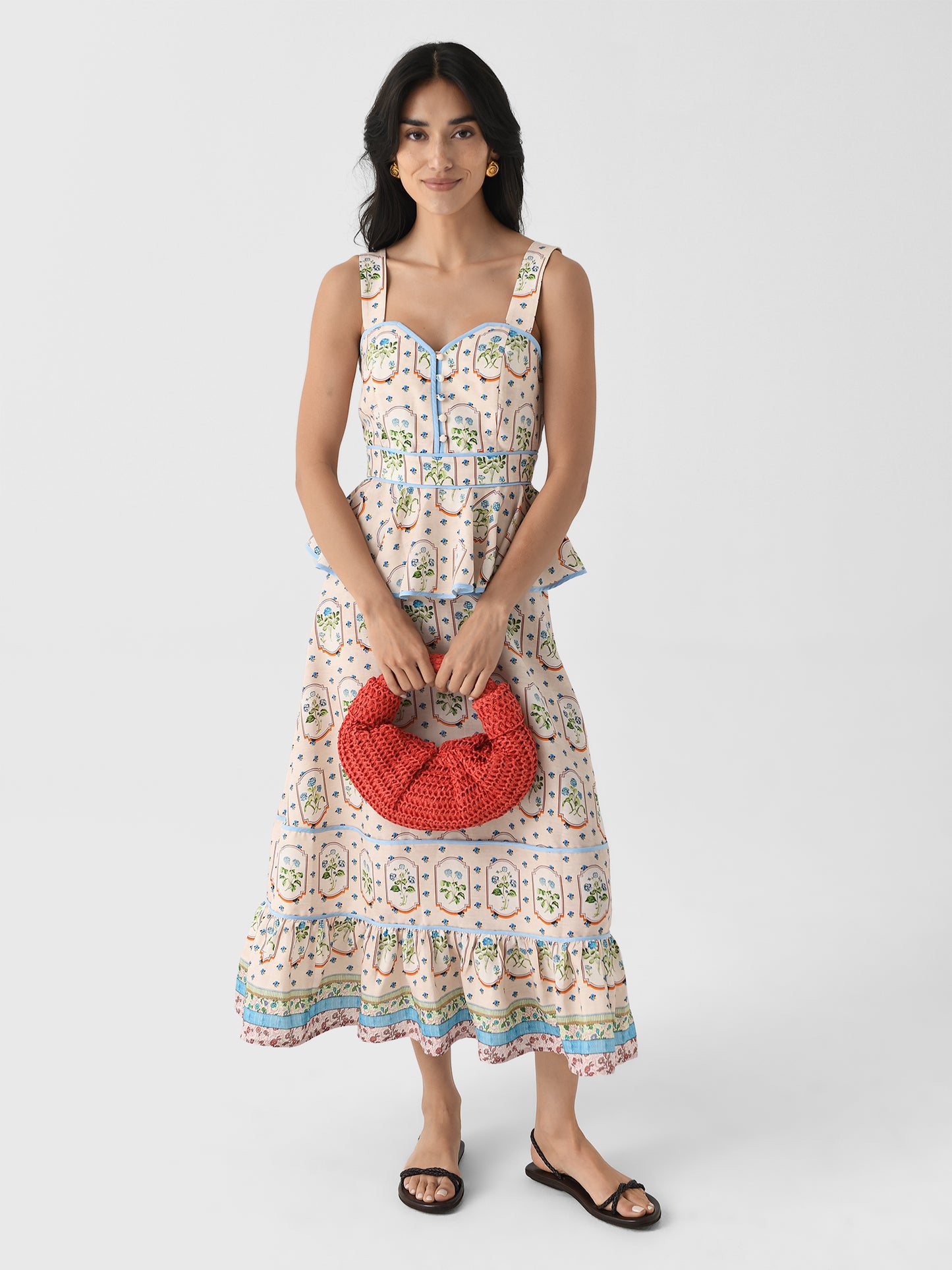 This dress is a delightful blend of vintage charm and modern femininity. The soft pastel colors and botanical print create a unique and eye-catching look, while the fitted bodice and peplum waist offer a flattering silhouette.