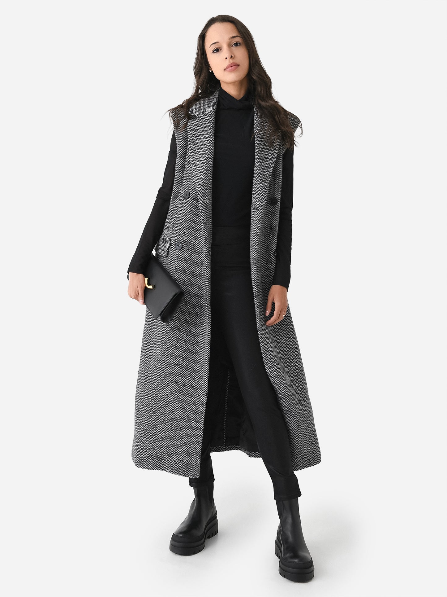 Long vest with a herringbone stitched pattern and a double-breasted closure.