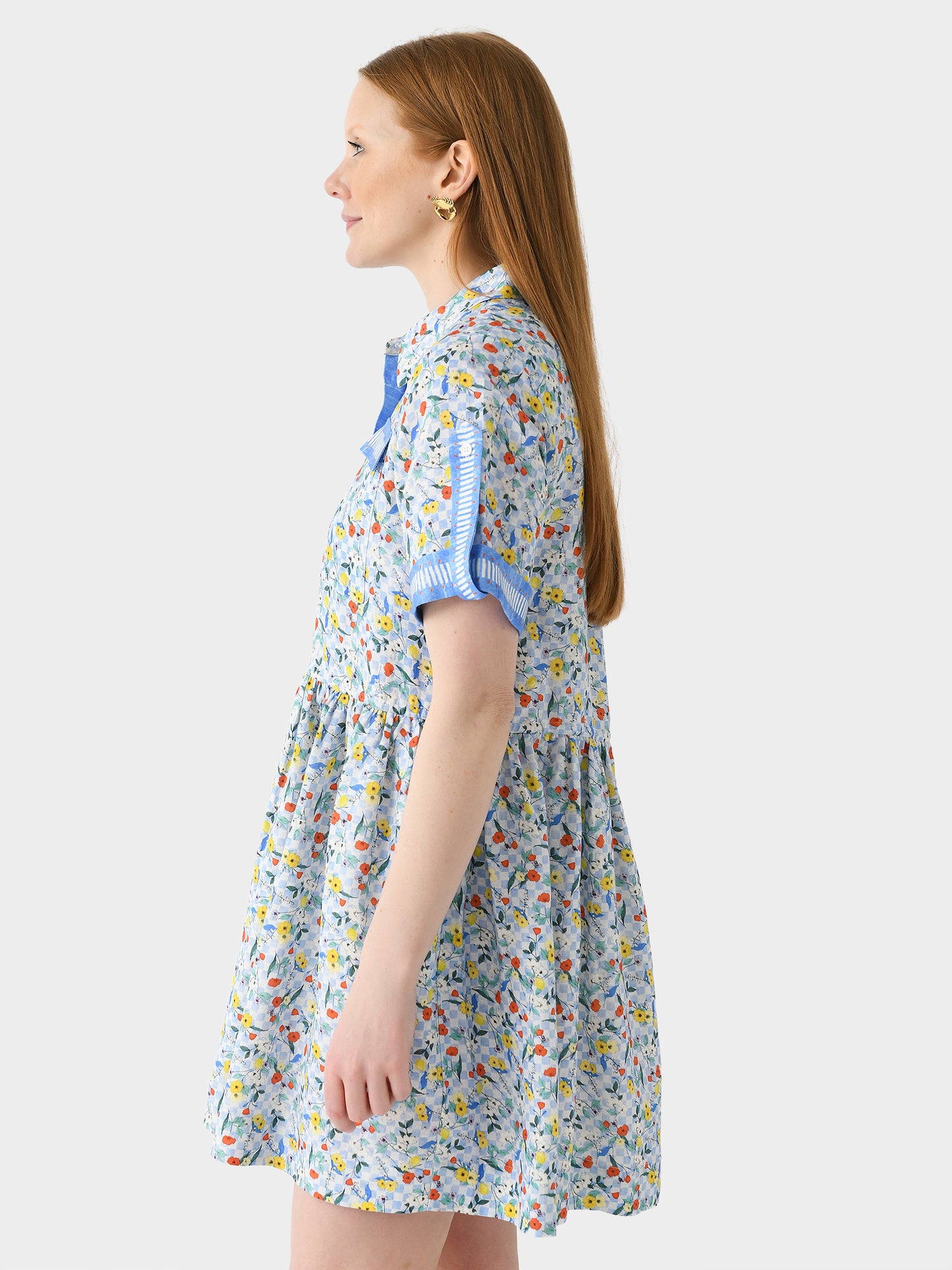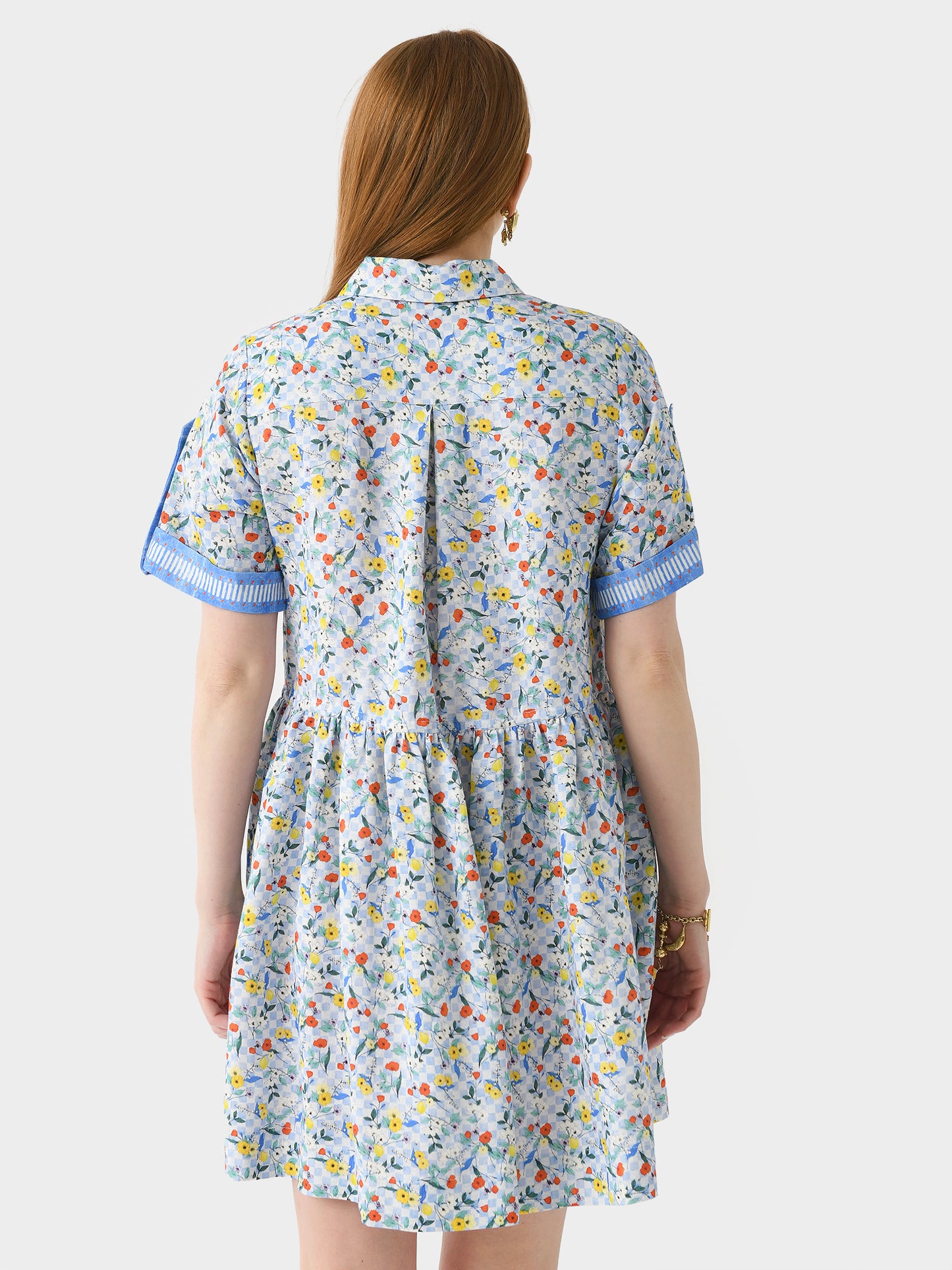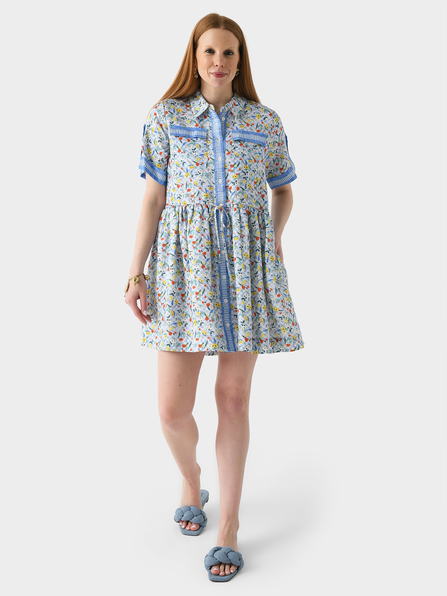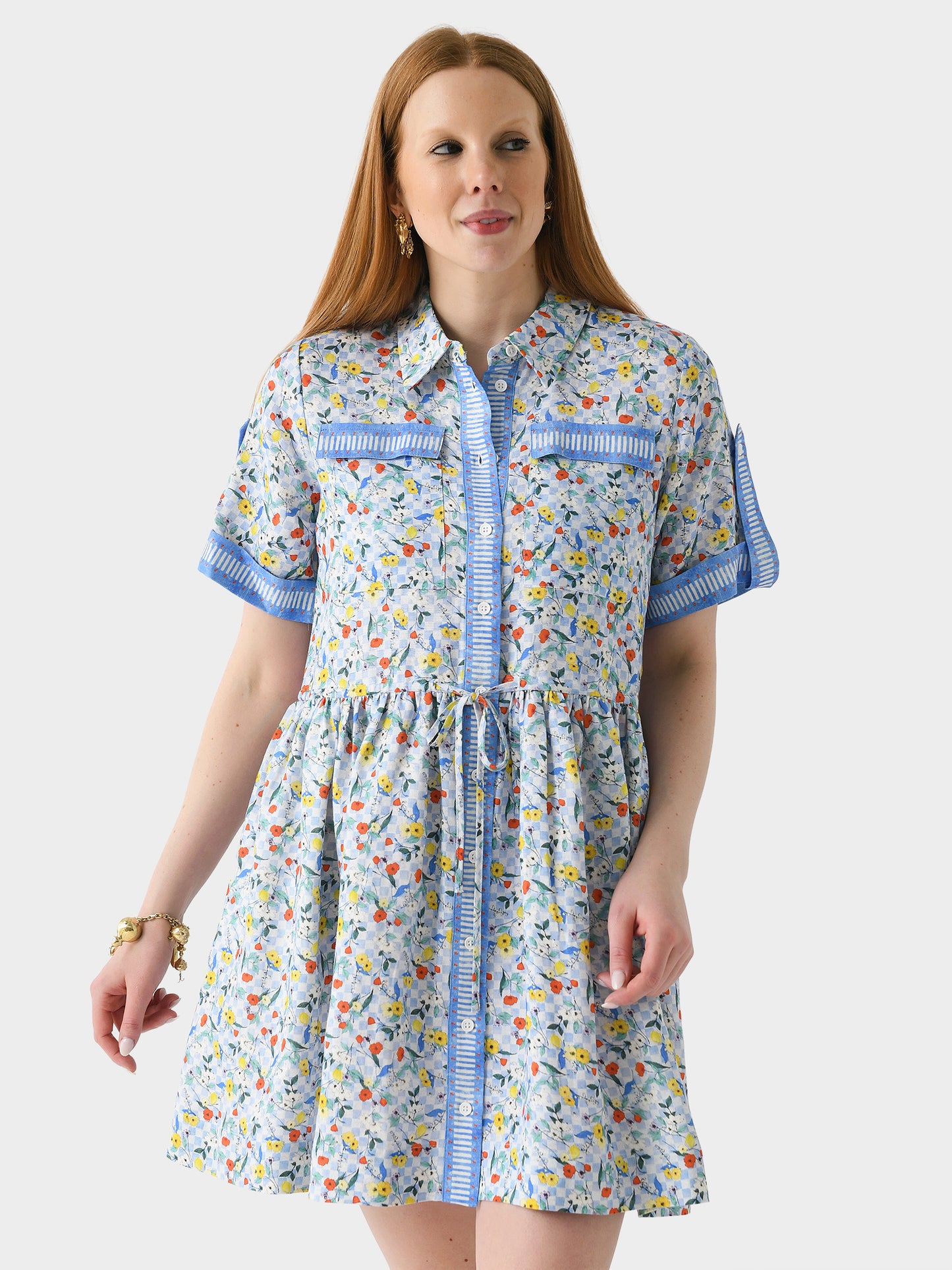 A mini shirtdress with a drawstring waist, contrast trims, and a mixed floral print.
