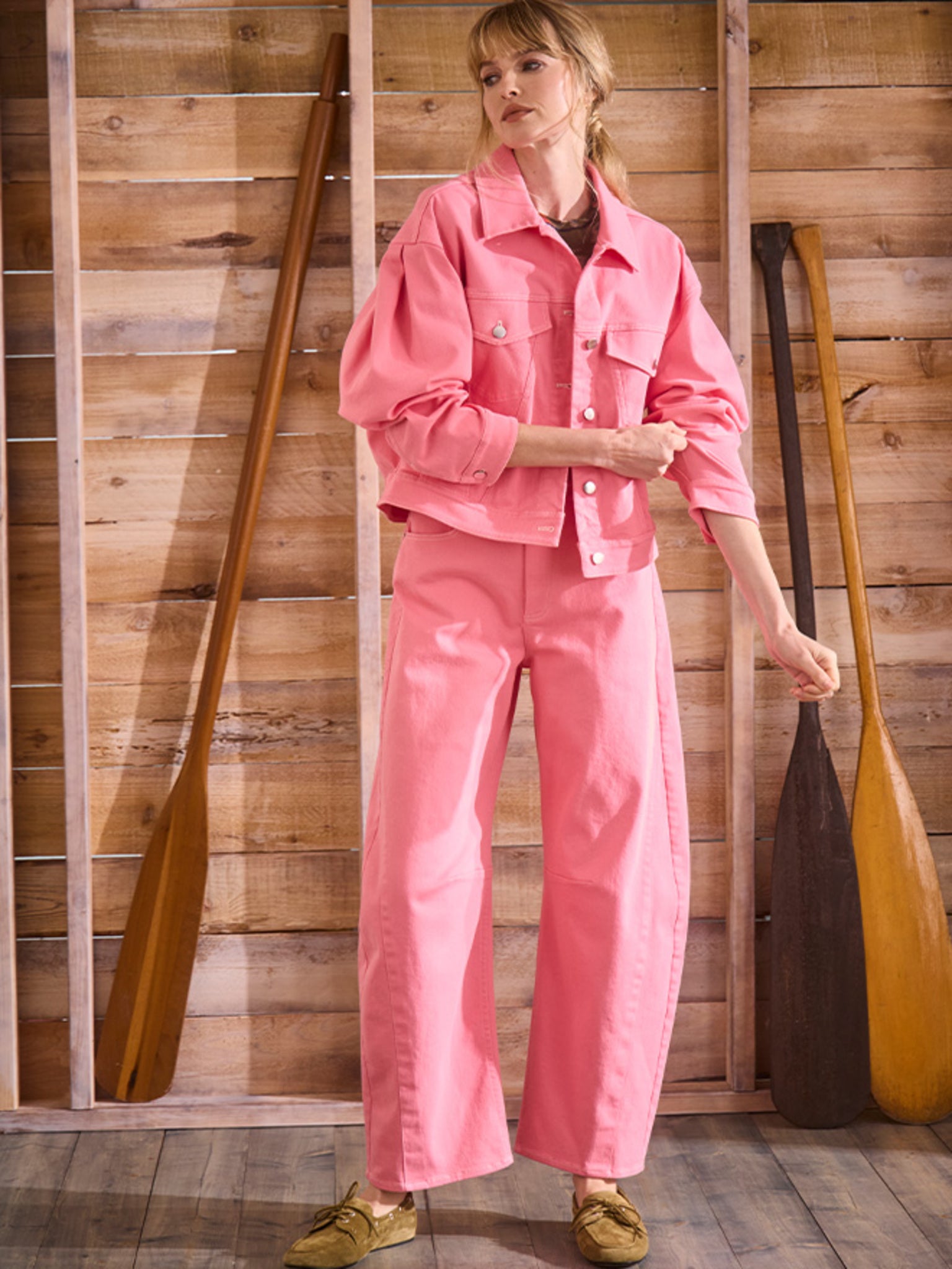 A modern take on the essential denim jacket, this piece combines classic utility with feminine flair. The vivid pink color makes a confident statement, while the traditional collar, chest pockets, and button closure keep the look grounded. Oversized, gathered puff sleeves define the silhouette, adding structure and volume for a chic, contemporary finish.