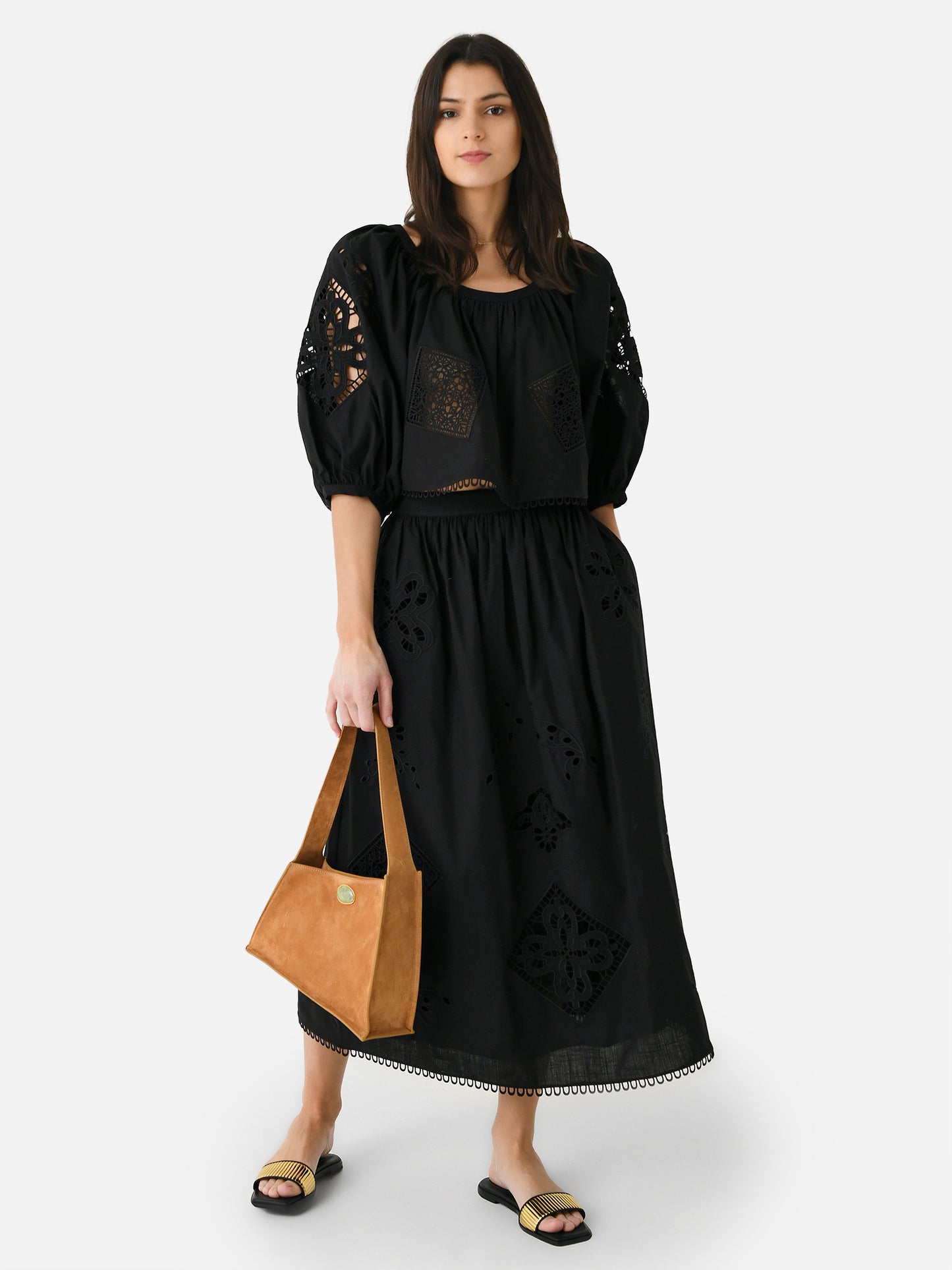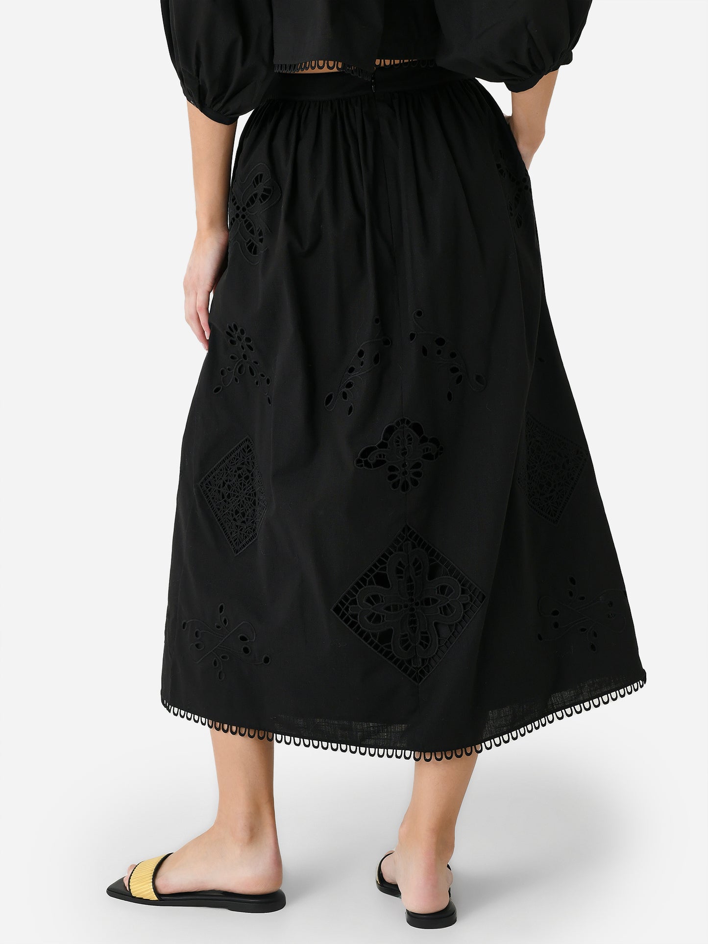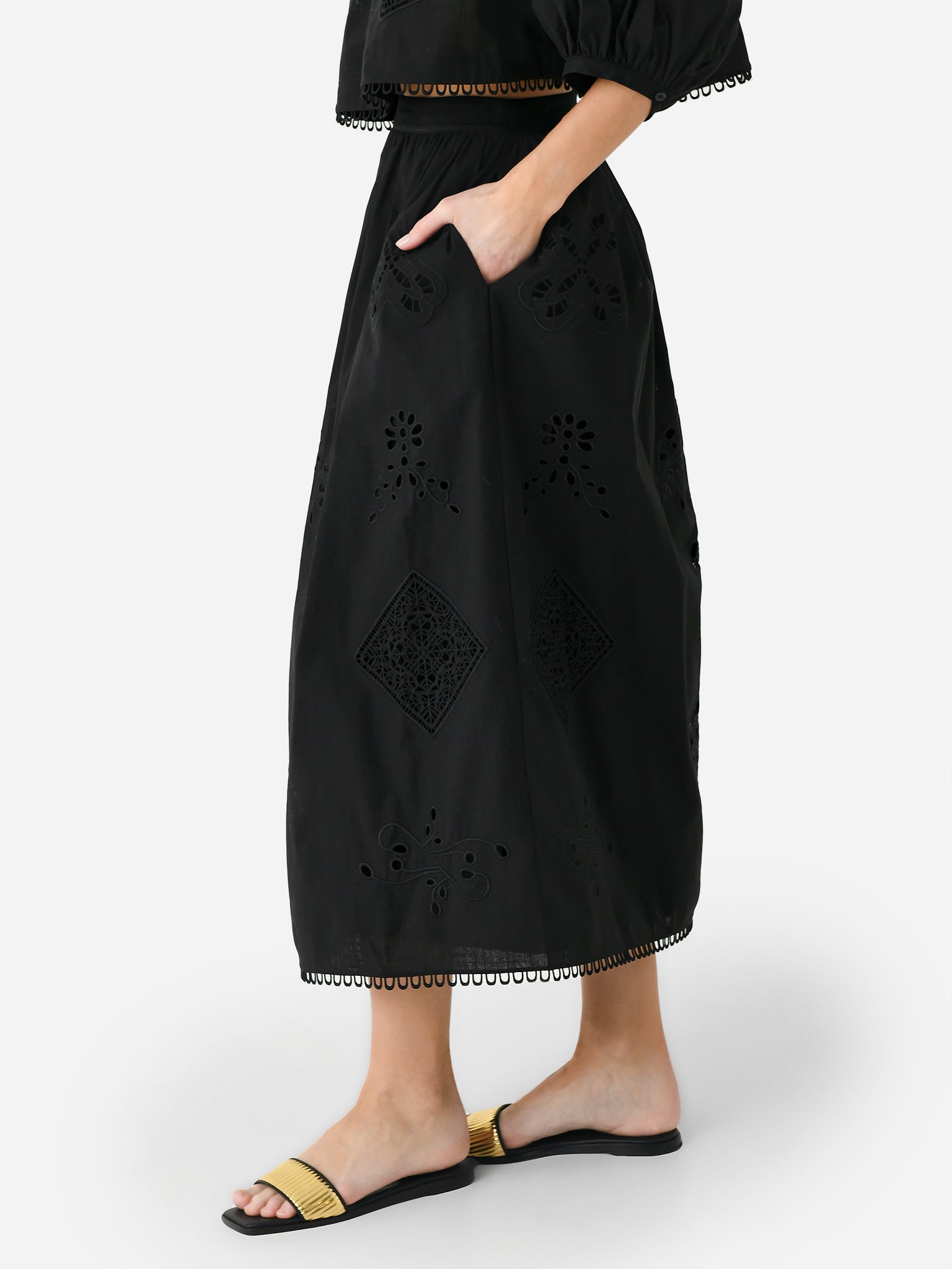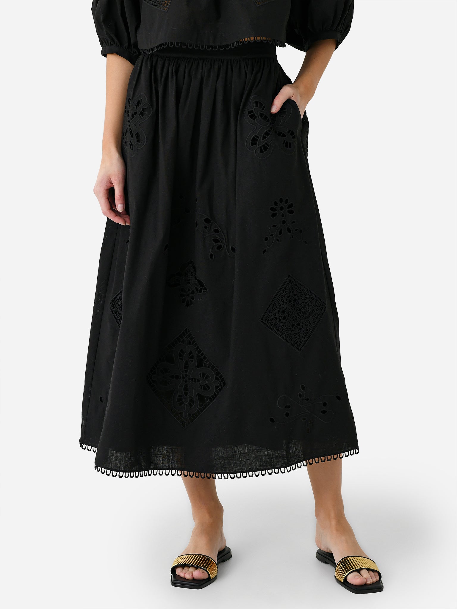 A long skirt made from a lightweight eyelet lace fabric.