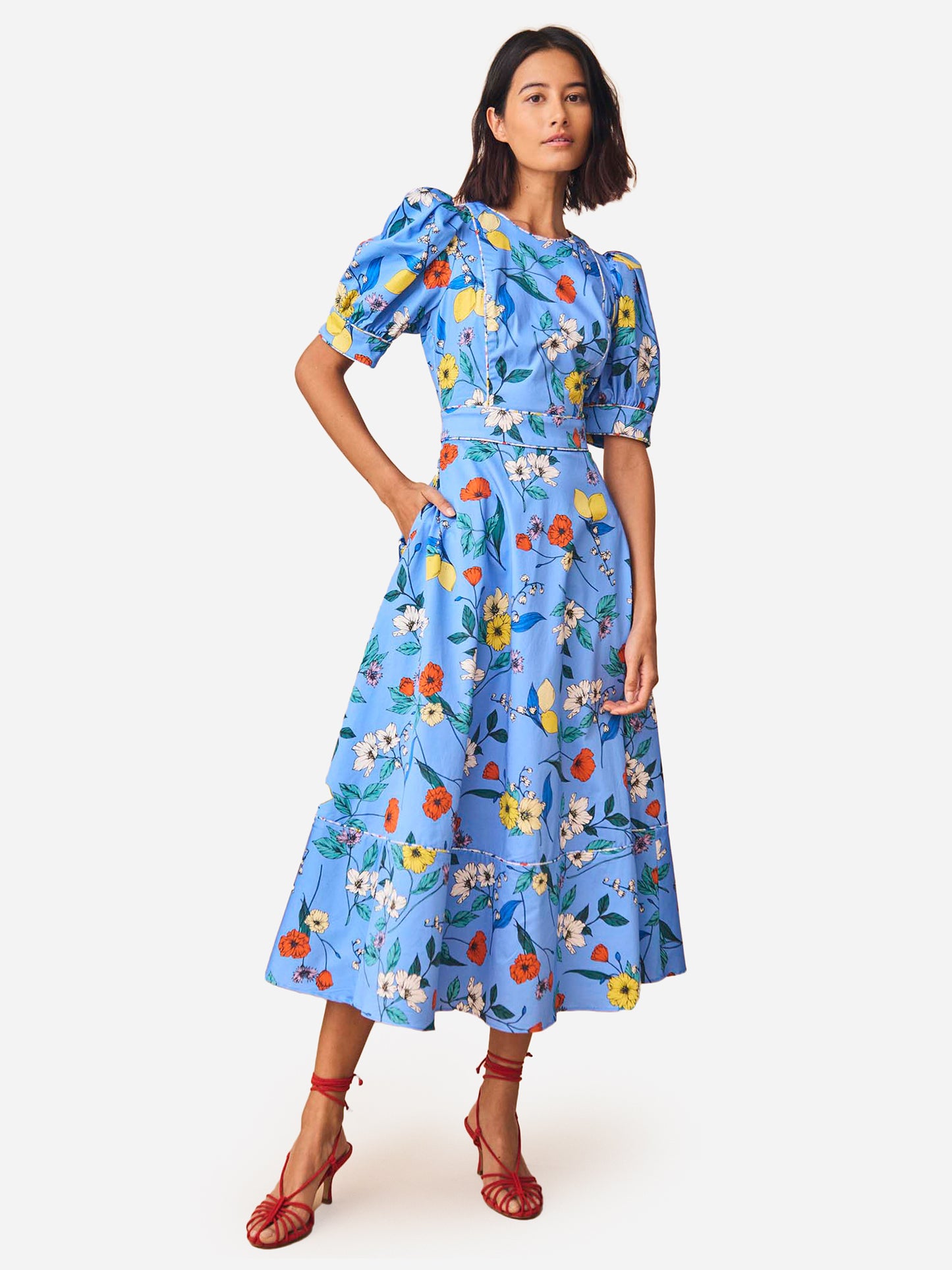A cotton-stretch midi dress with a fitted bodice, cinched waist, and colorful floral print with contrast piping.