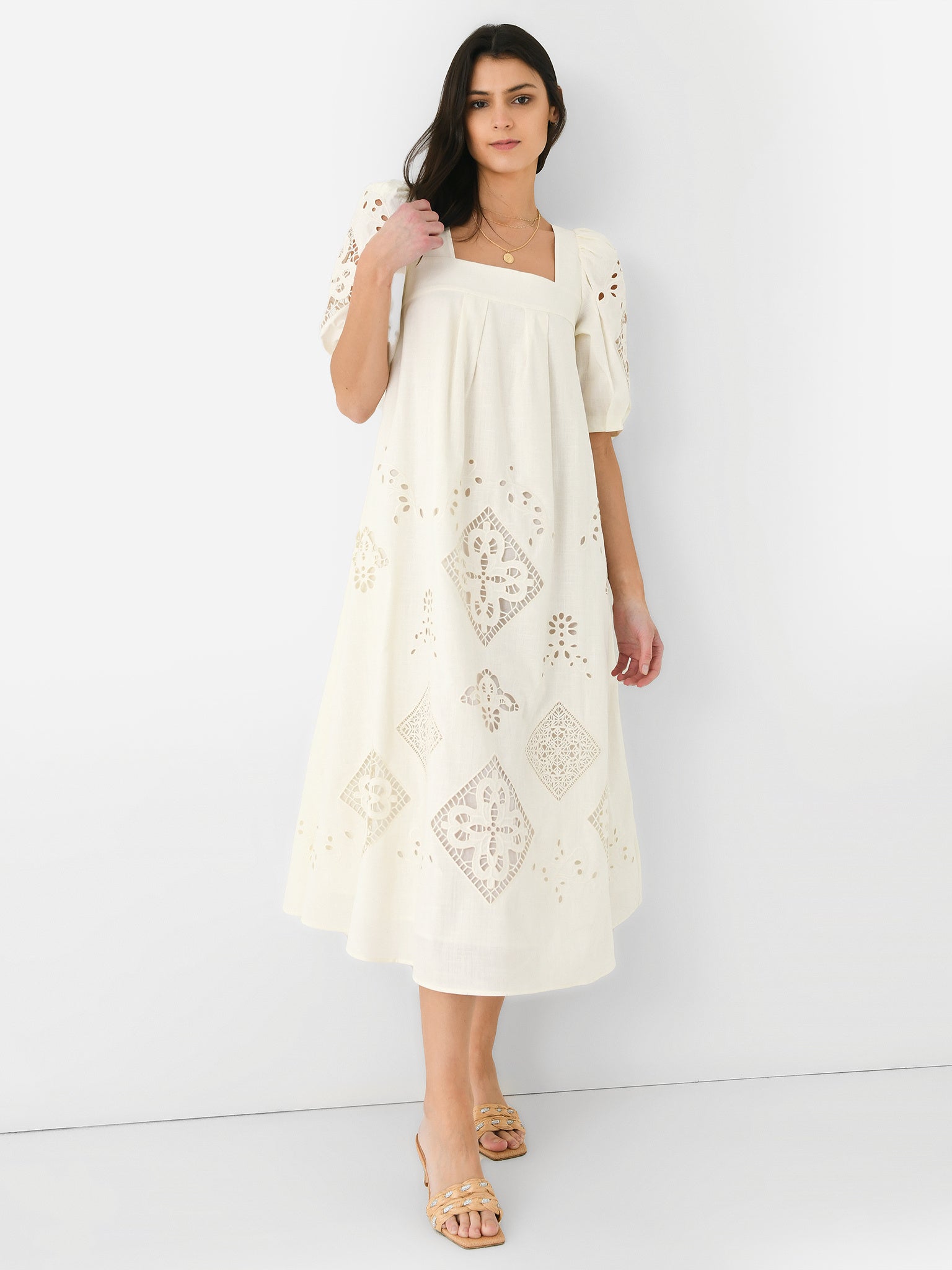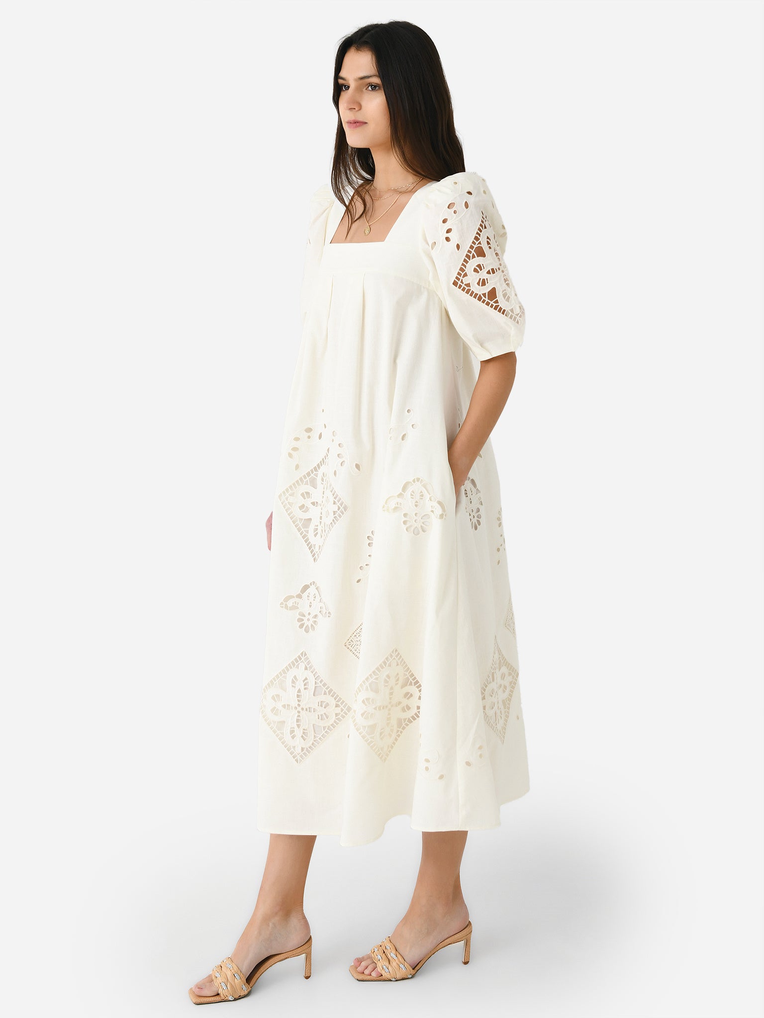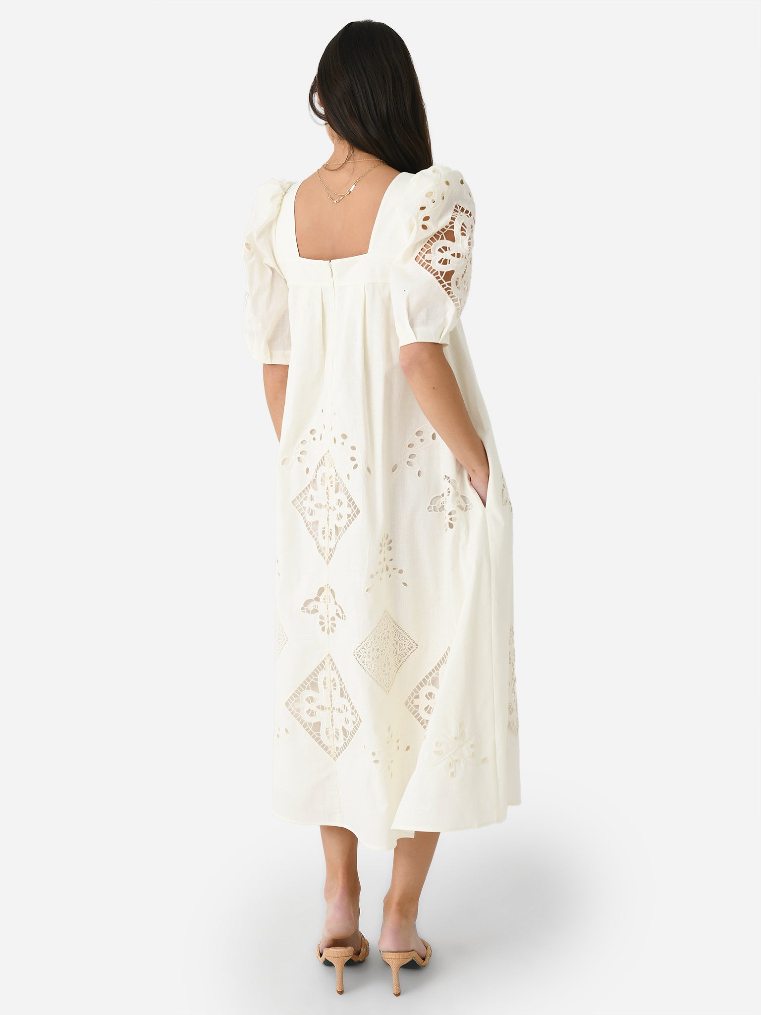 A long, a-line dress with puff sleeves and an embroidered lace construction.