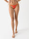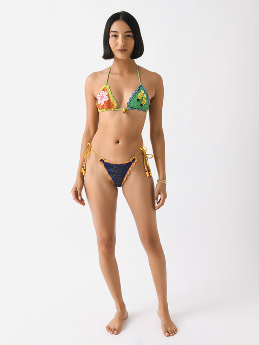 A 90s-inspired bikini bottom handmade from crocheted cotton with beaded side ties and scalloped edges.