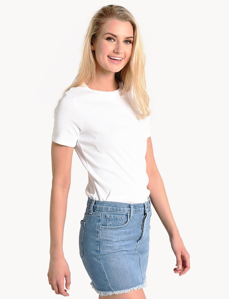 - Styled with J Brand Jean Skirt Style # JB002042 and Veja Style # EA2001M. Model is wearing size small top and 26 jean.