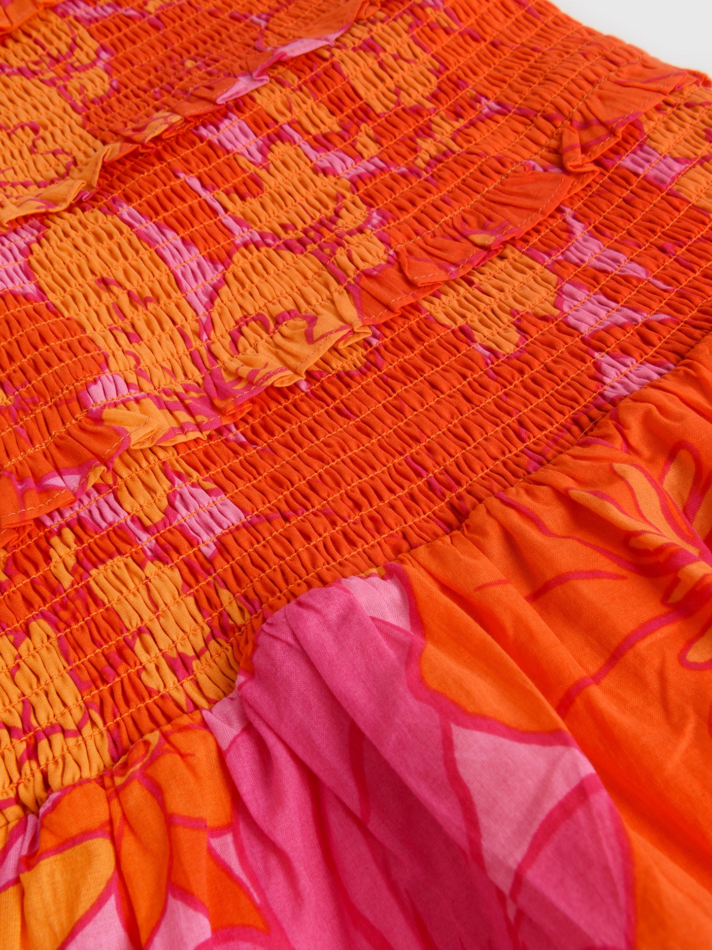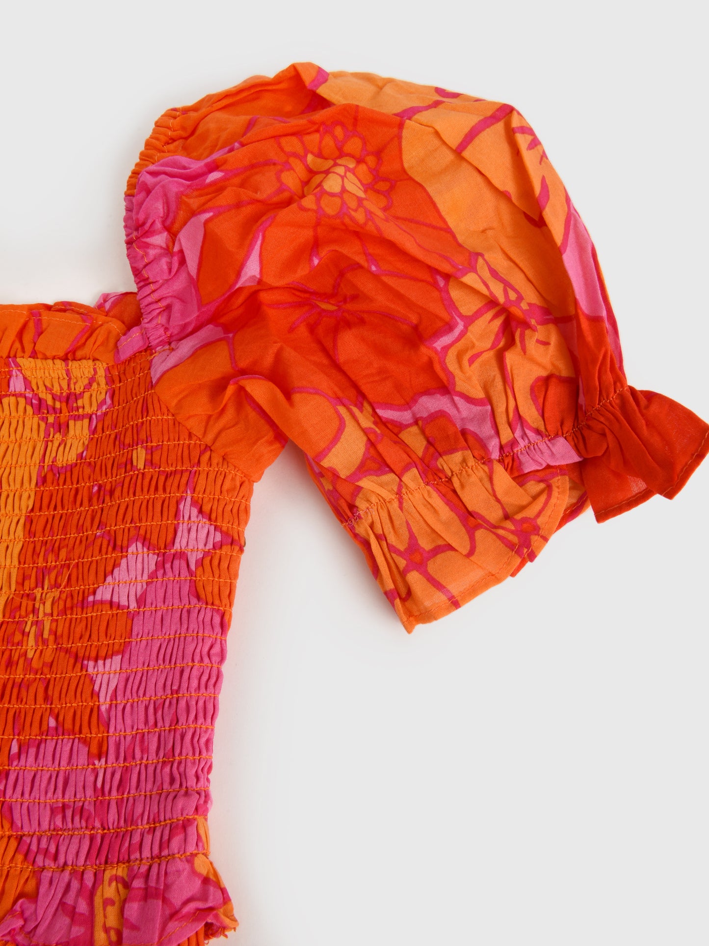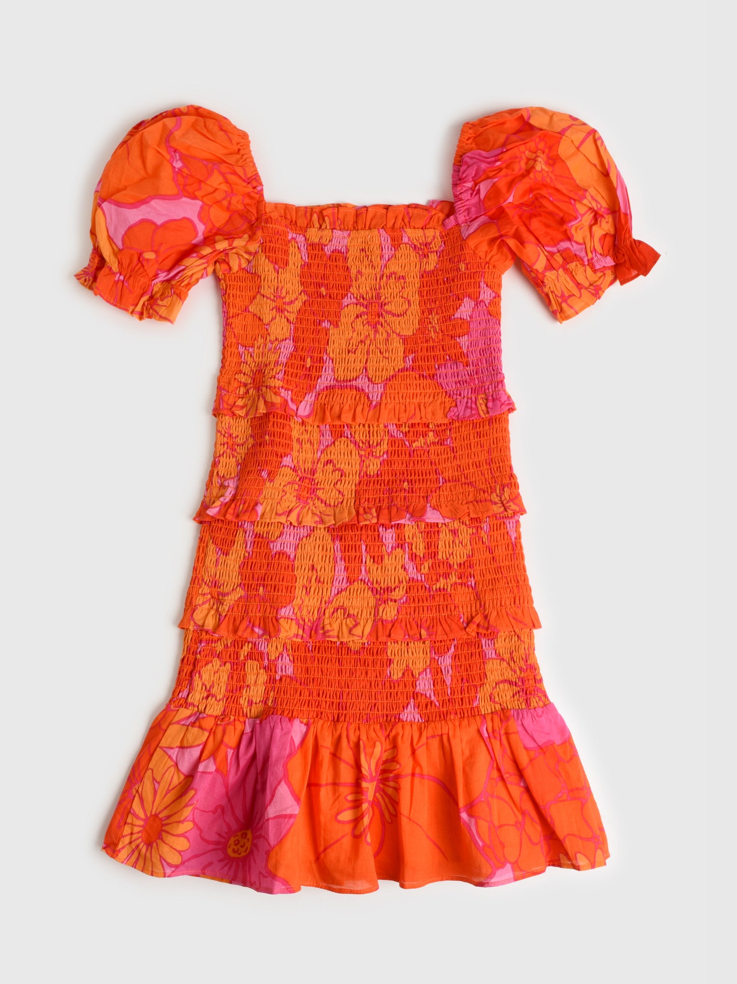 A lightweight dress with a comfortable smocked design, puff sleeves and a retro-inspired floral print.