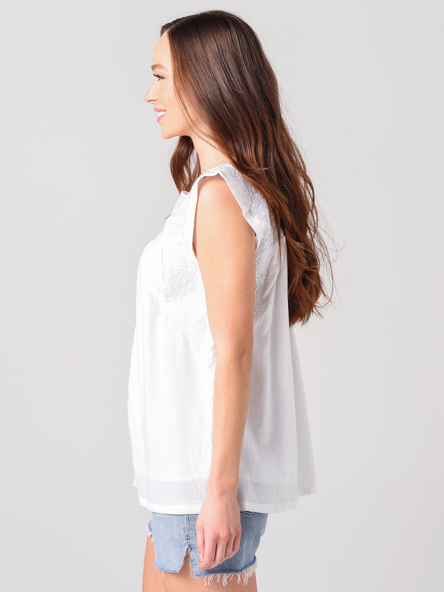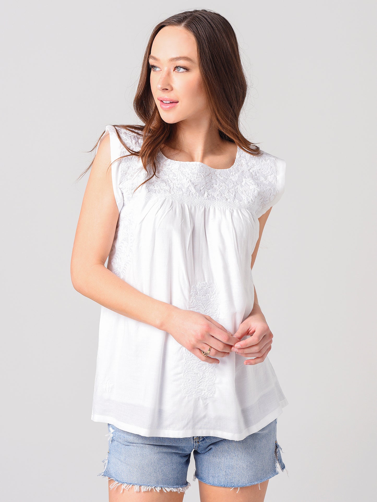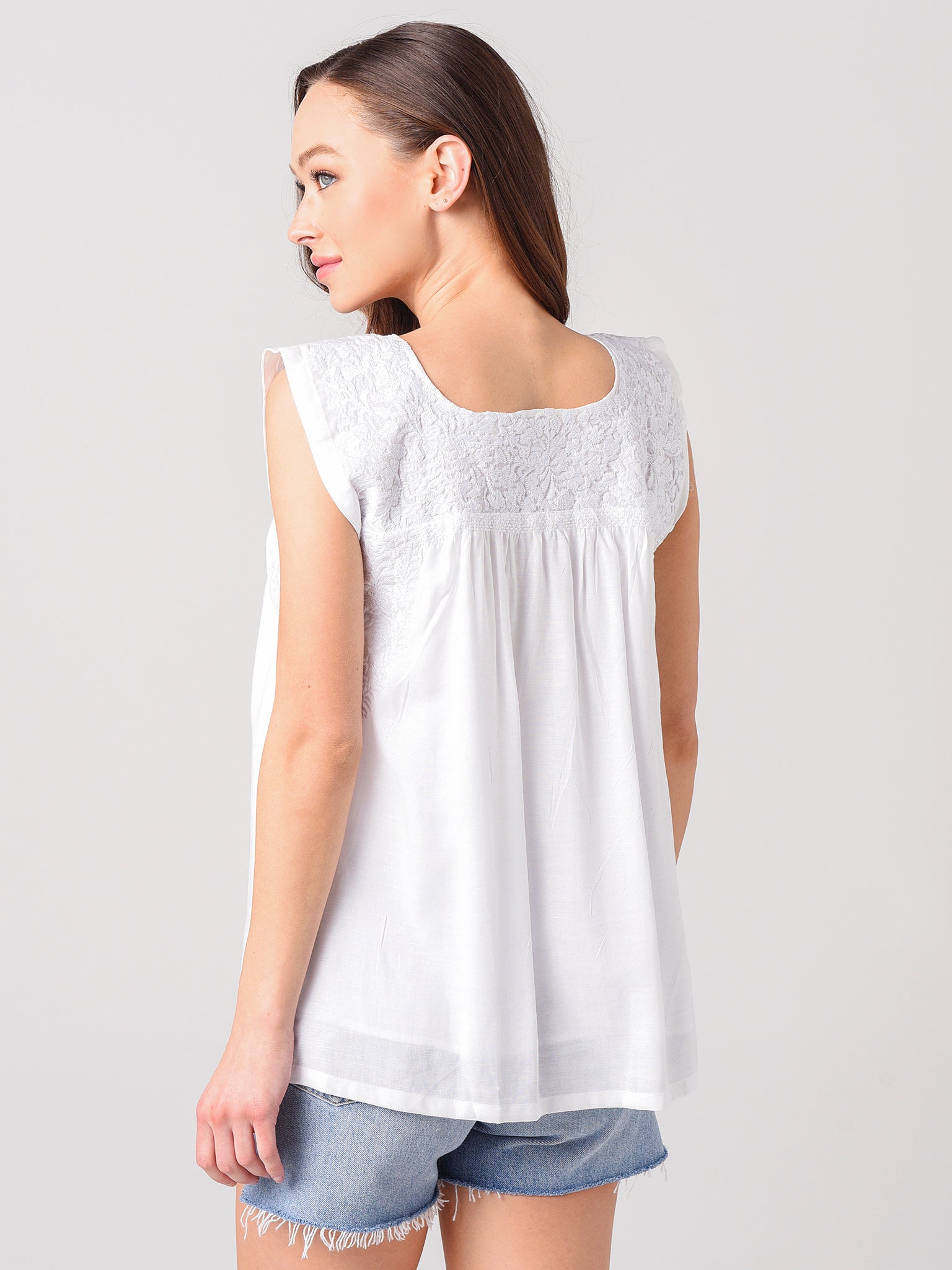 - Embroidery at neckline, front hem and back yoke