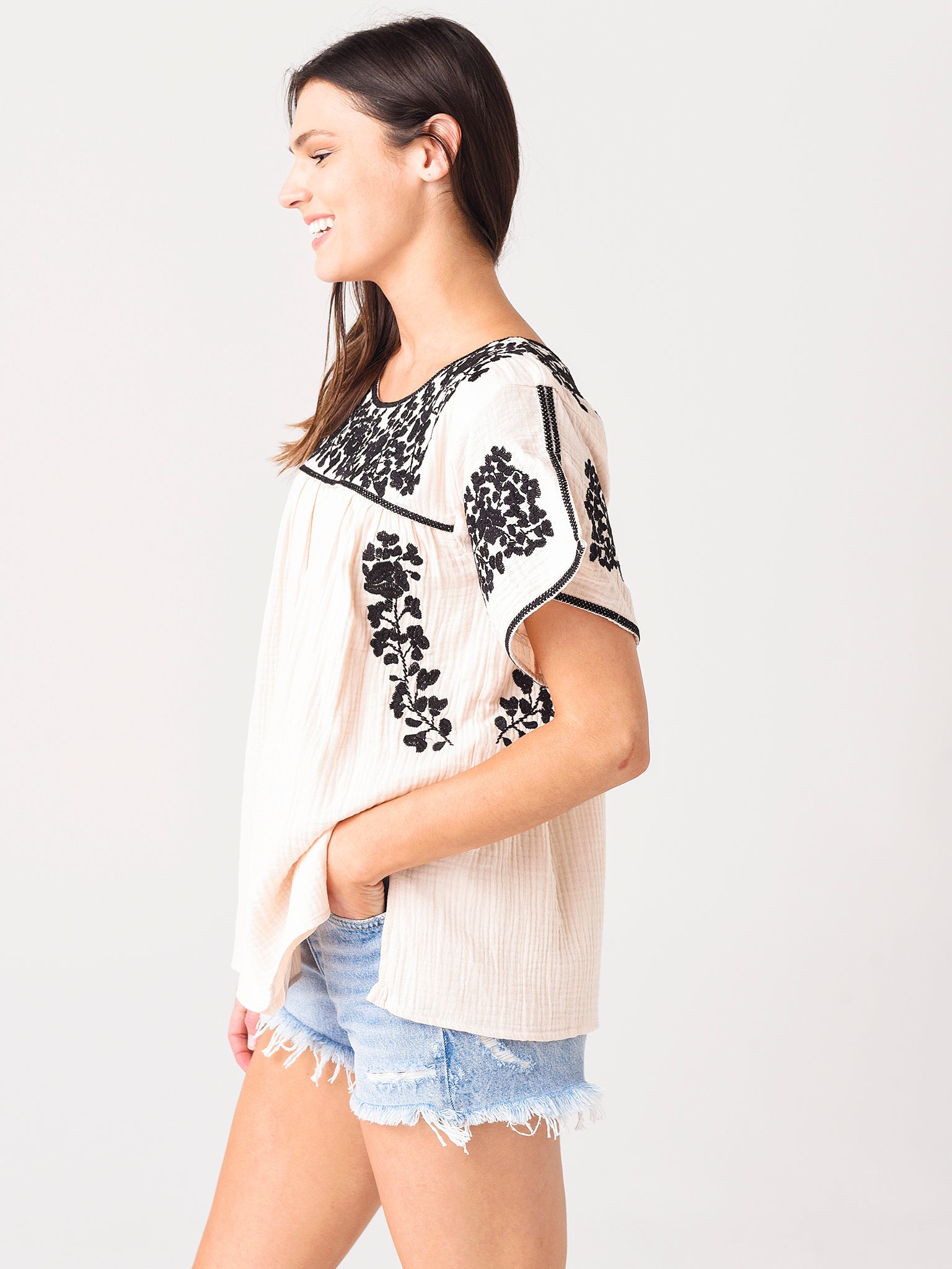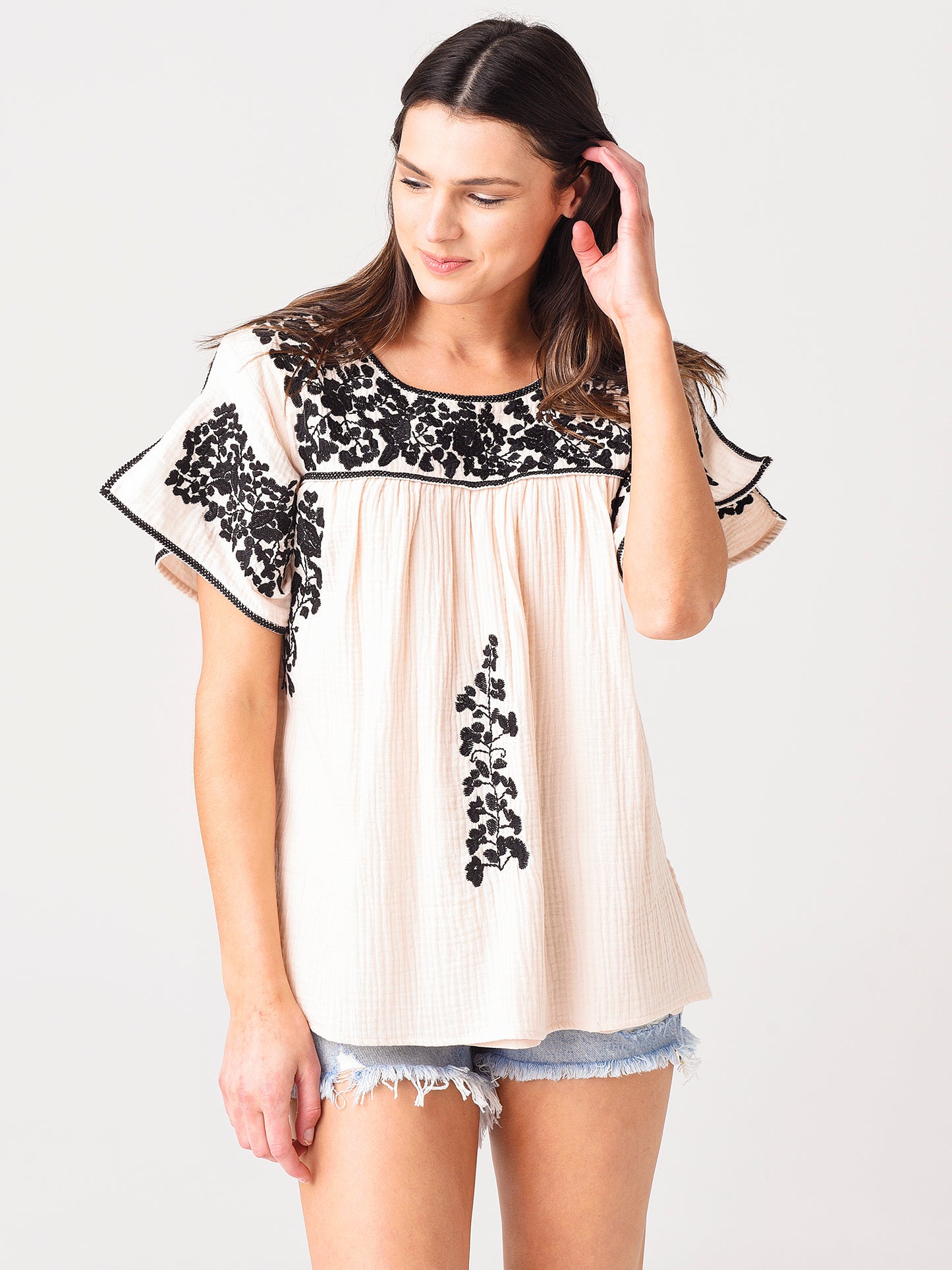 The J. Marie Women's Lynn Top delivers an air of sophistication with gorgeous black embroidery for perfect neutral vibes.