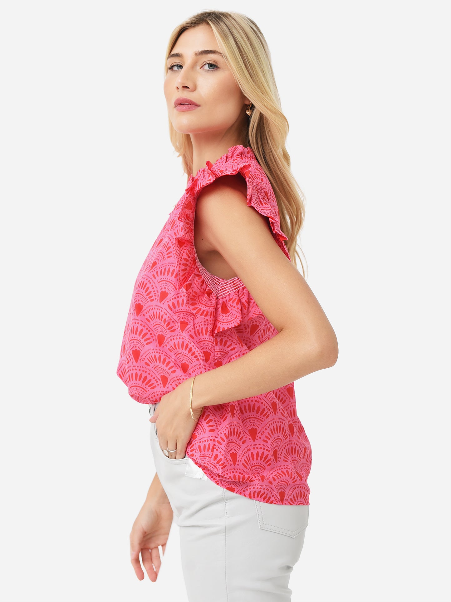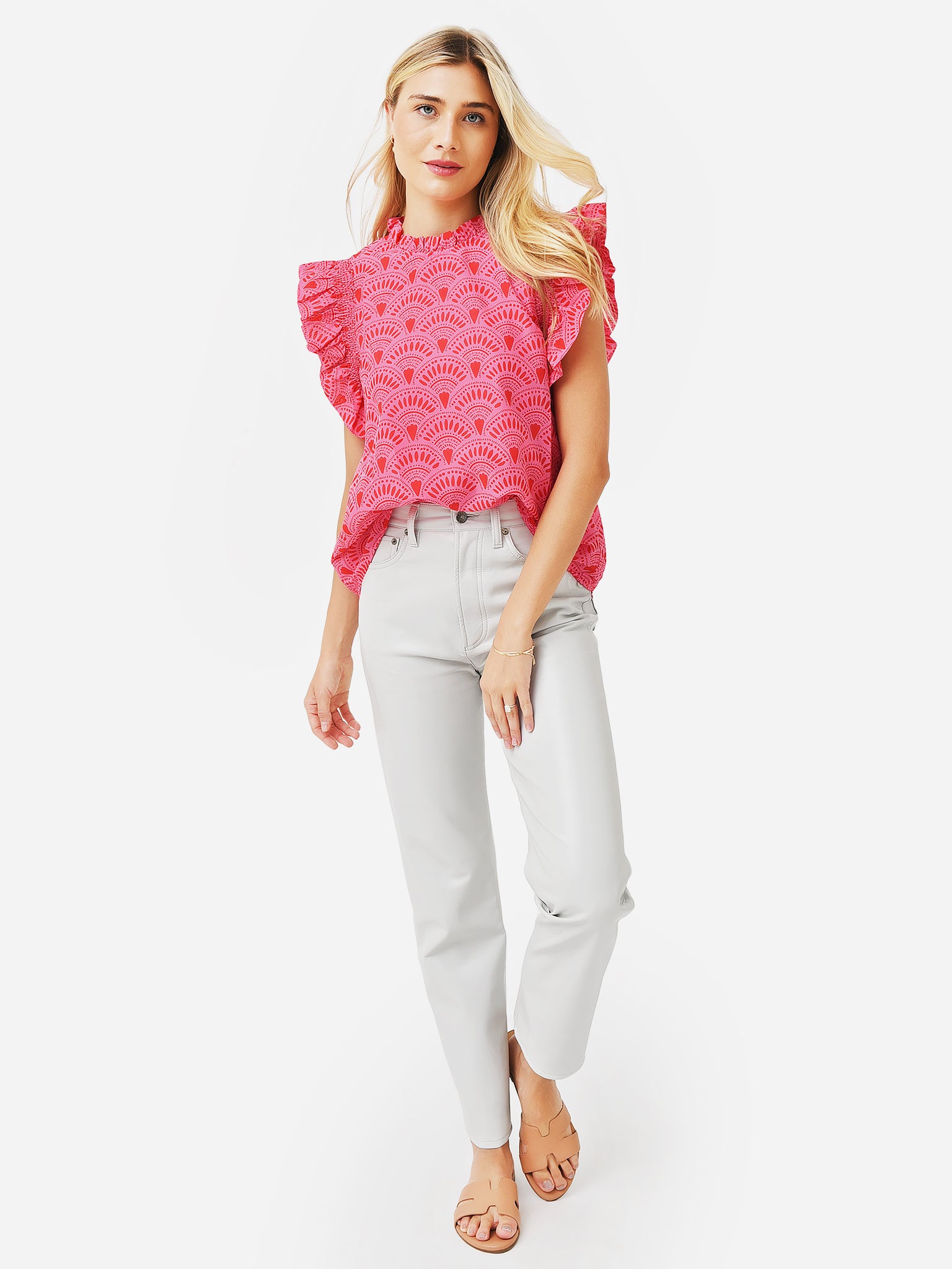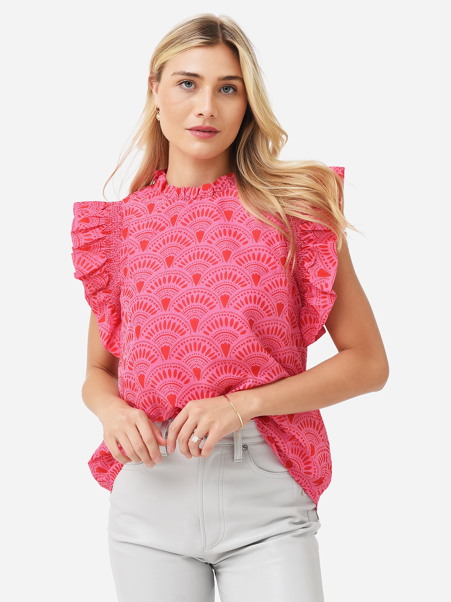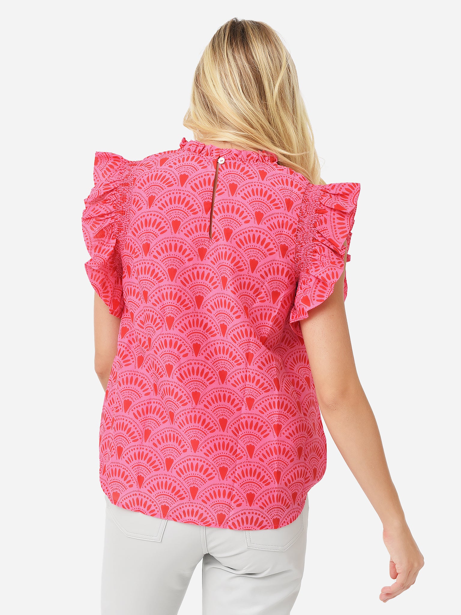 Vibrant printed top with ruffle sleeves.