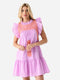 Lavender ruffle-trimmed dress with orange embroidered details.
