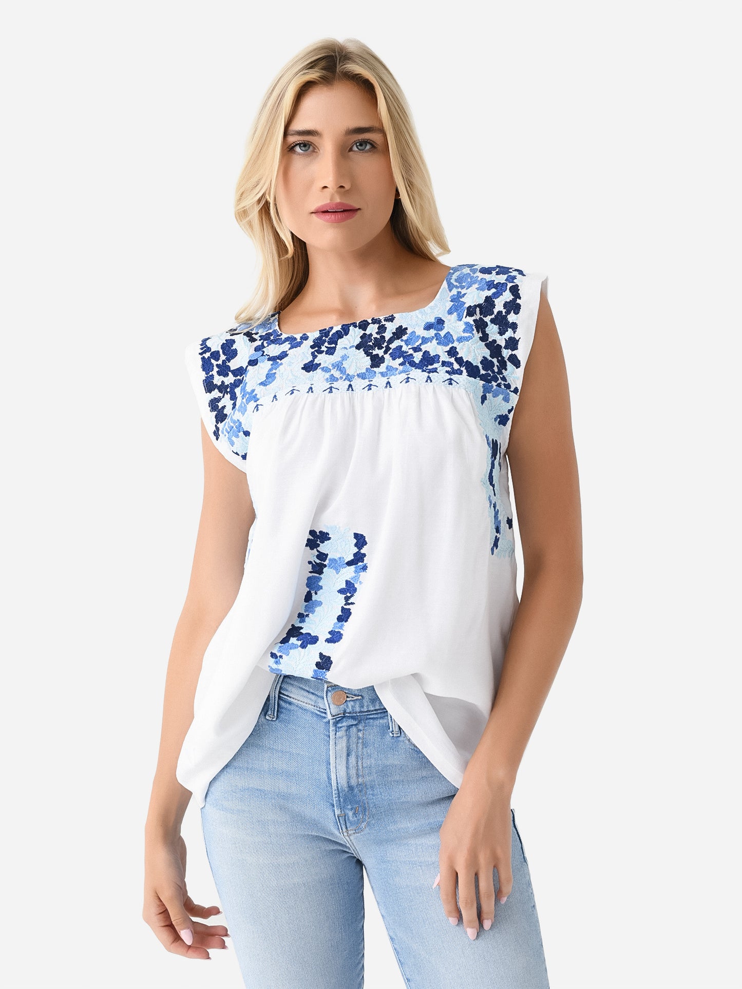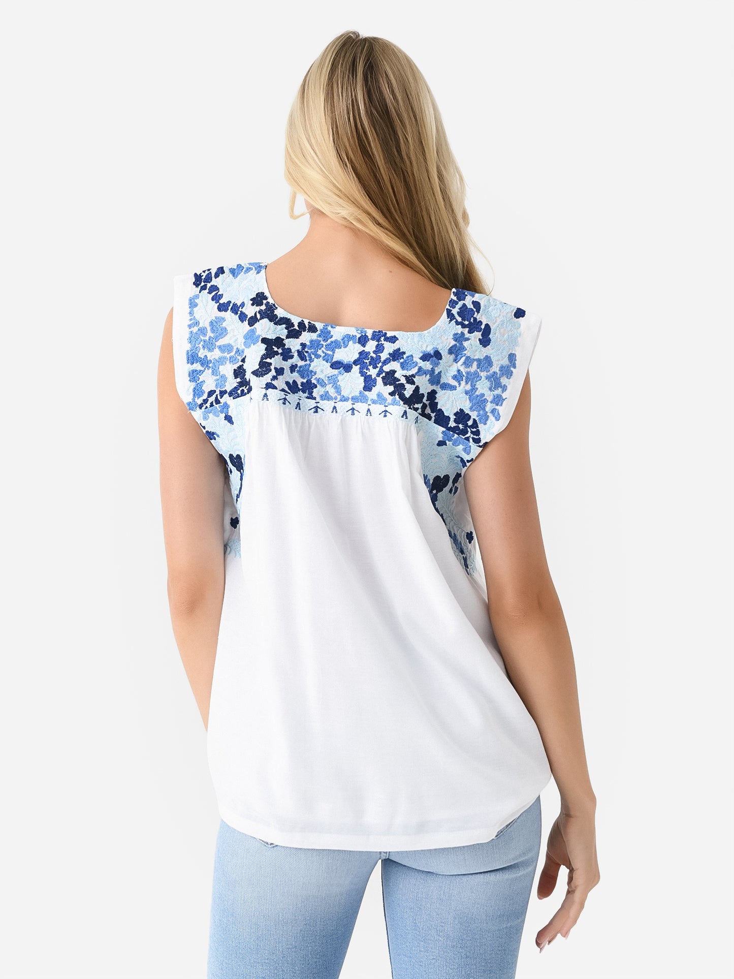 Sleeveless tunic top with delicate two-tone embroidered details.