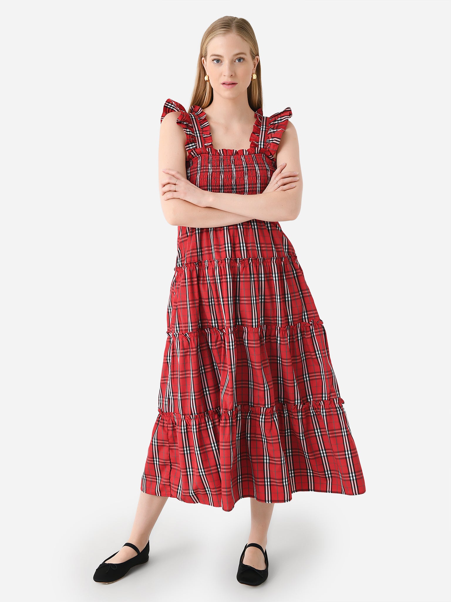 A gingham-printed mid-length dress with a smocked bodice, large ruffle straps, and a ruffle-tiered skirt.
