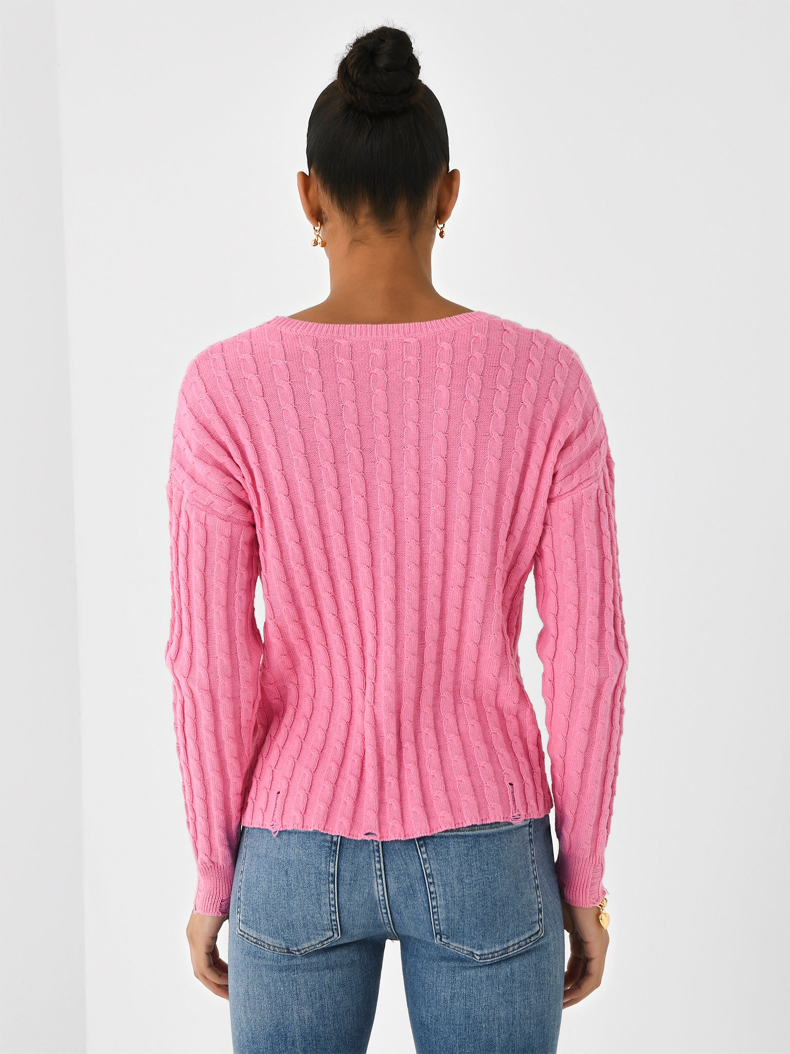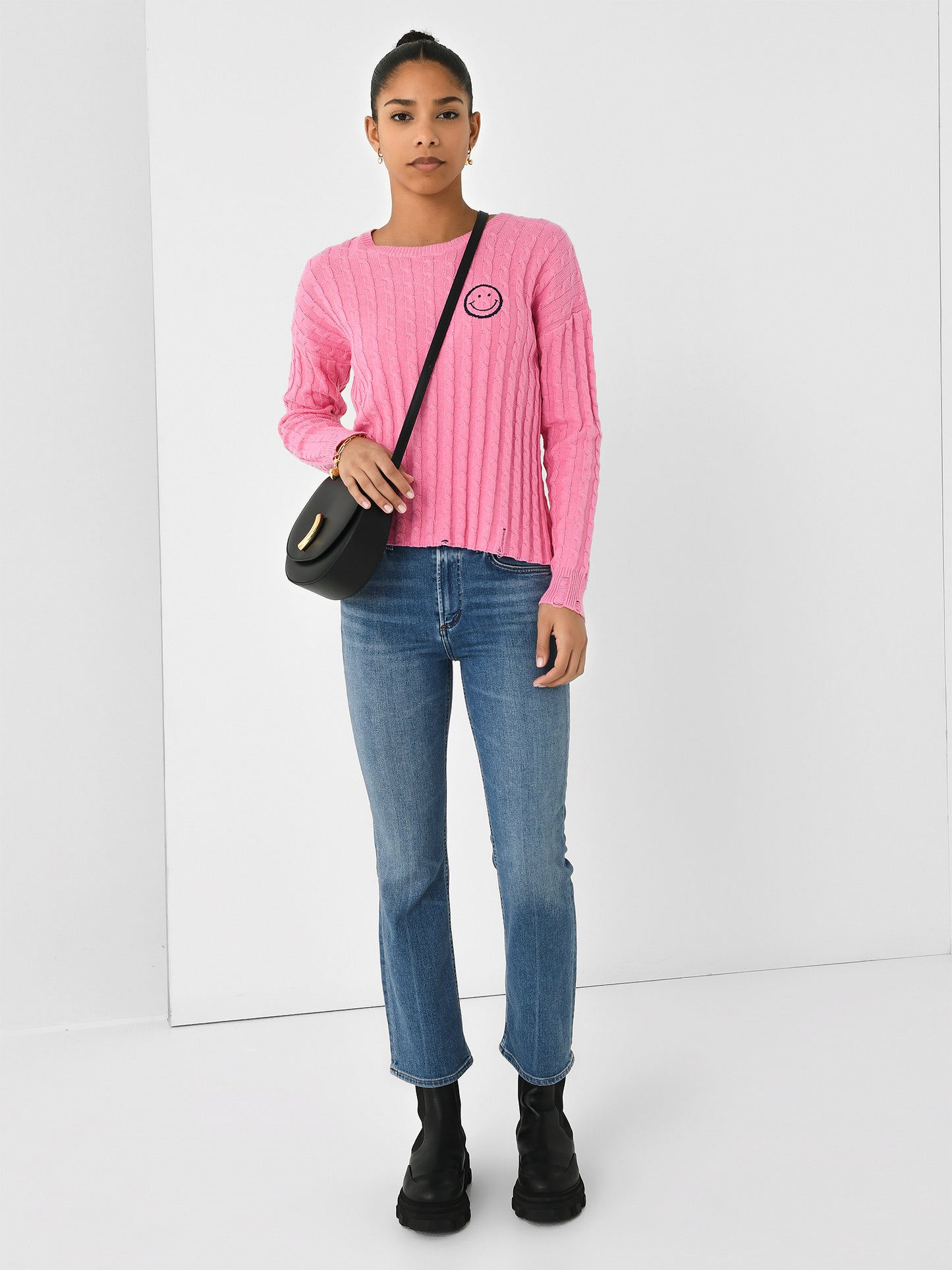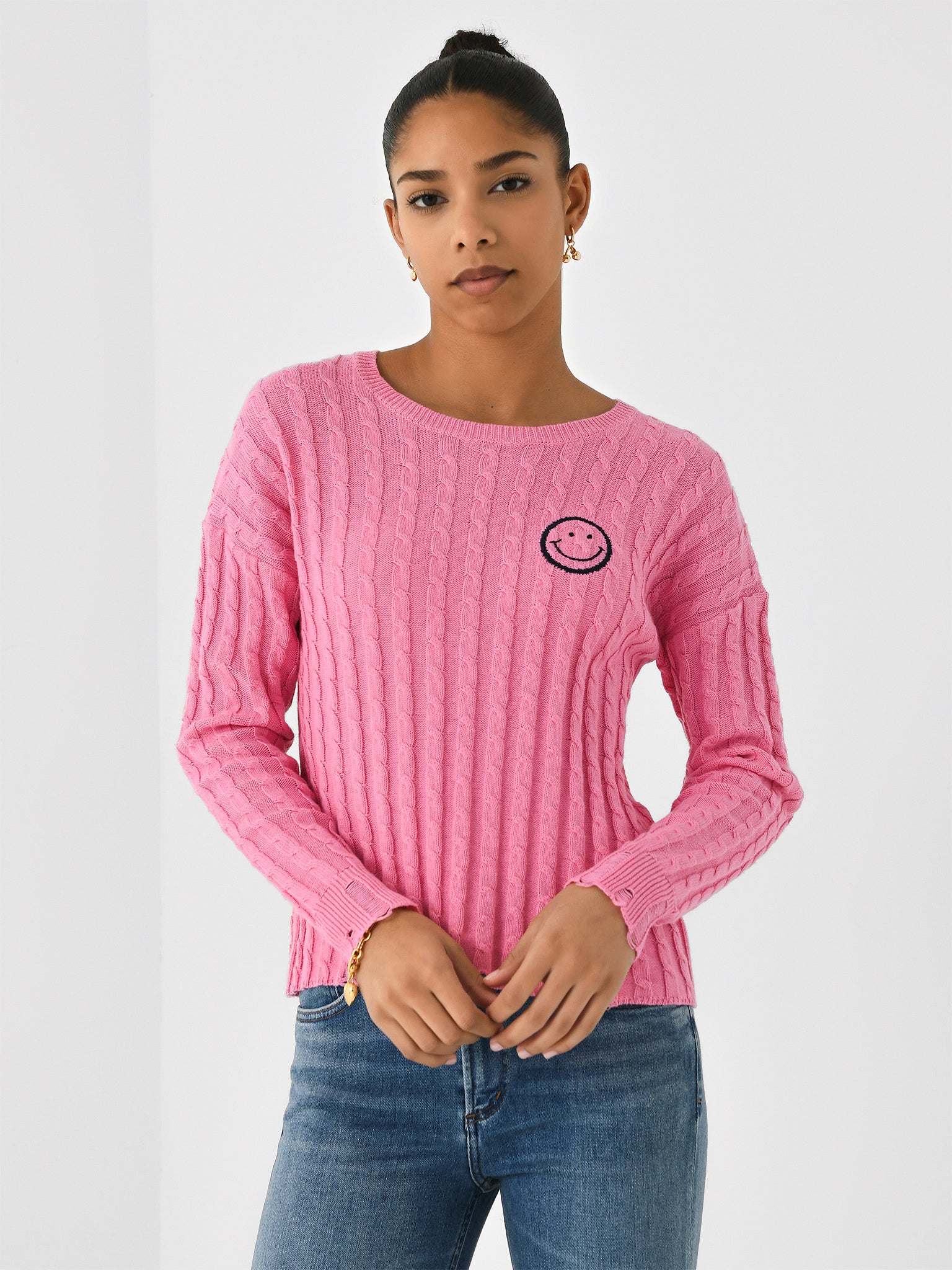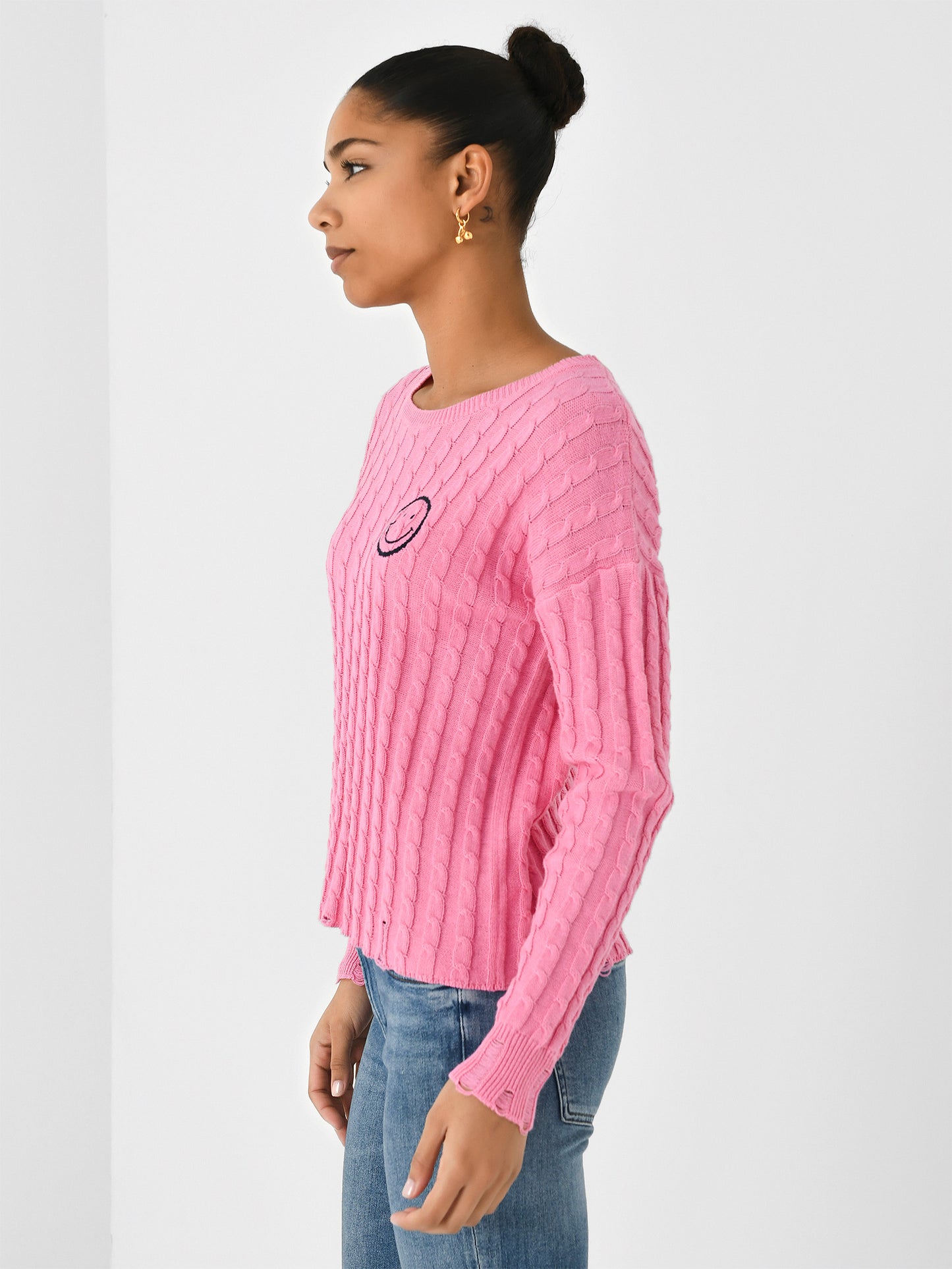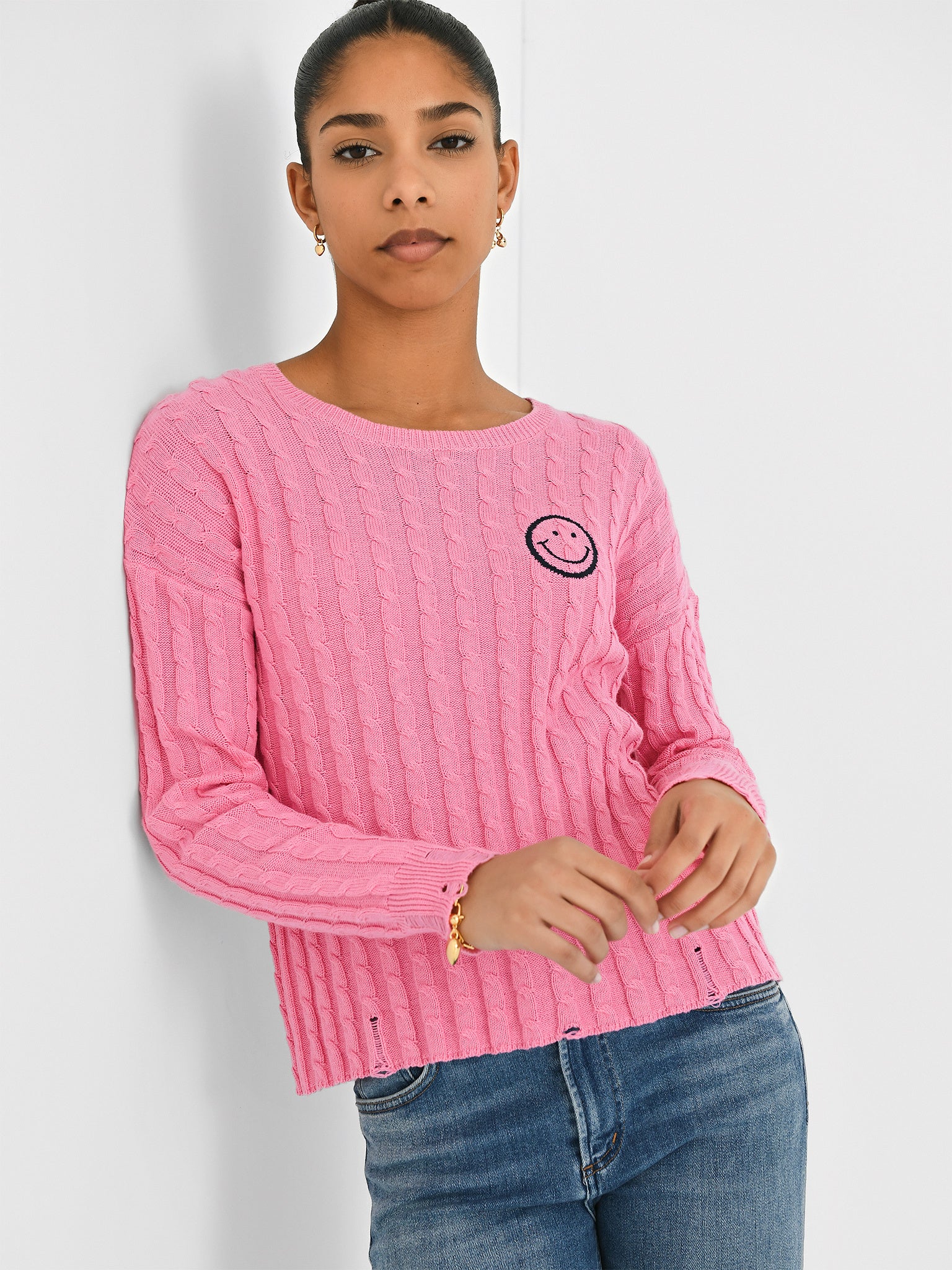 A cable knit cotton sweater with a contrast smiley graphic and distressed details.
