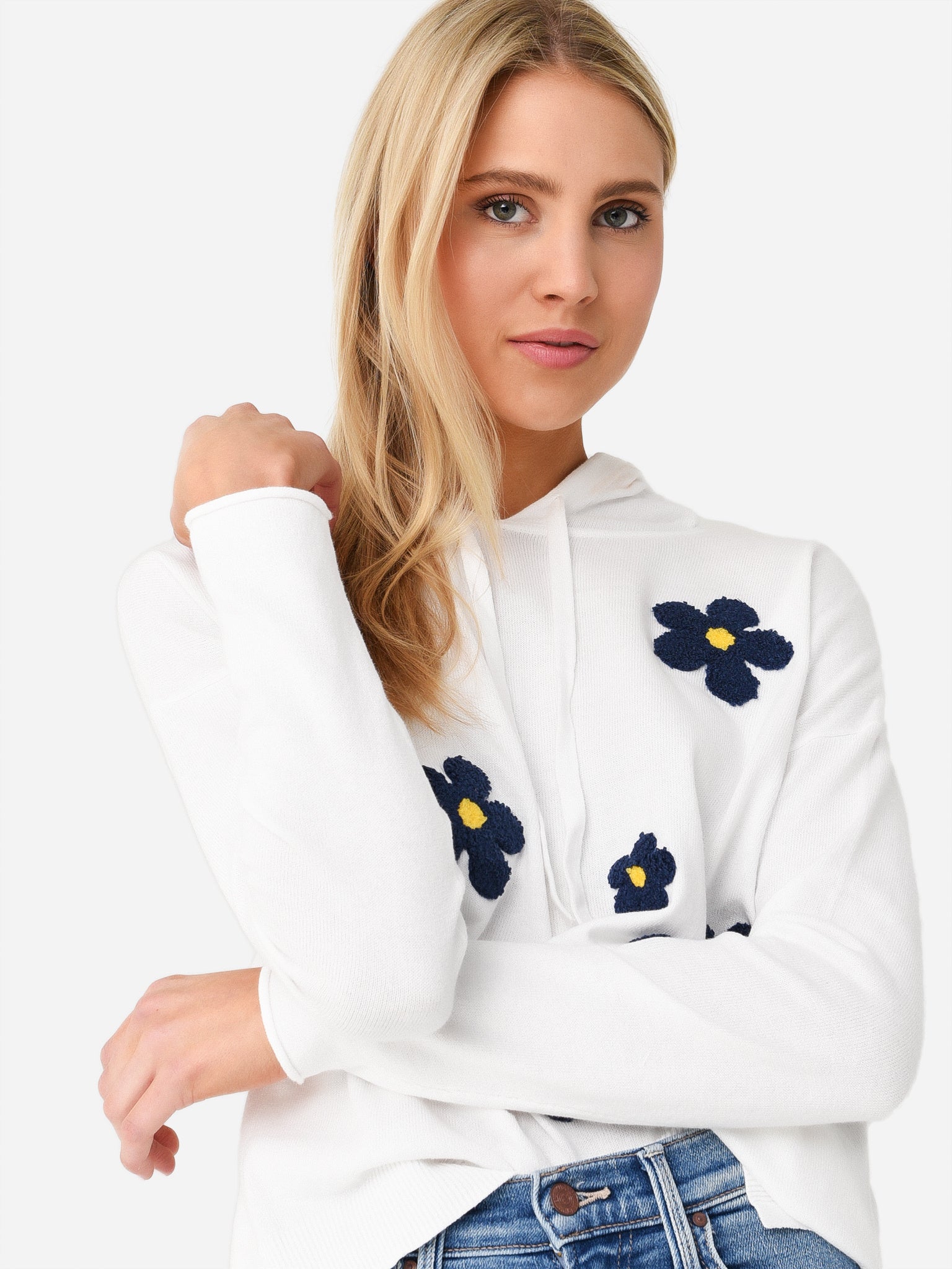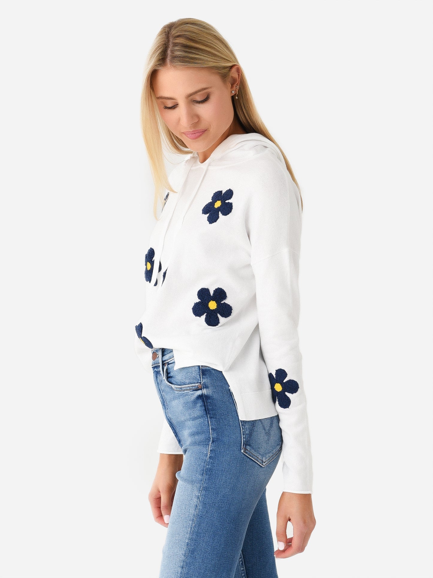 Hooded sweater with flower appliqués and a relaxed silhouette.