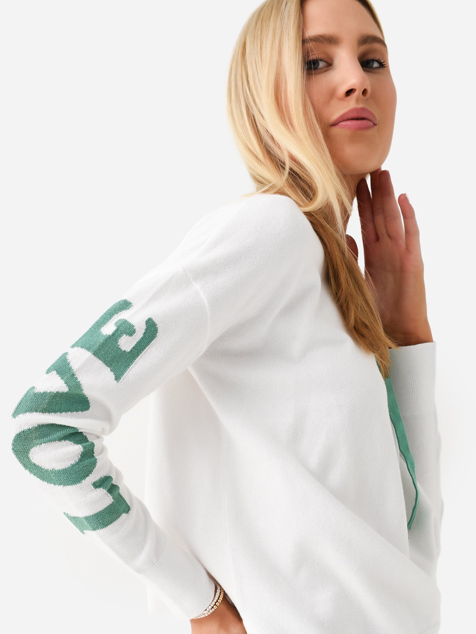 - Model is wearing size Small sweater.
