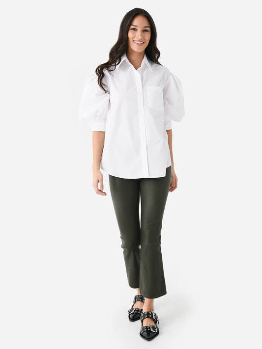 This crisp top offers the structure of a traditional button-down with an elevated feminine puff sleeve and pleated details.
