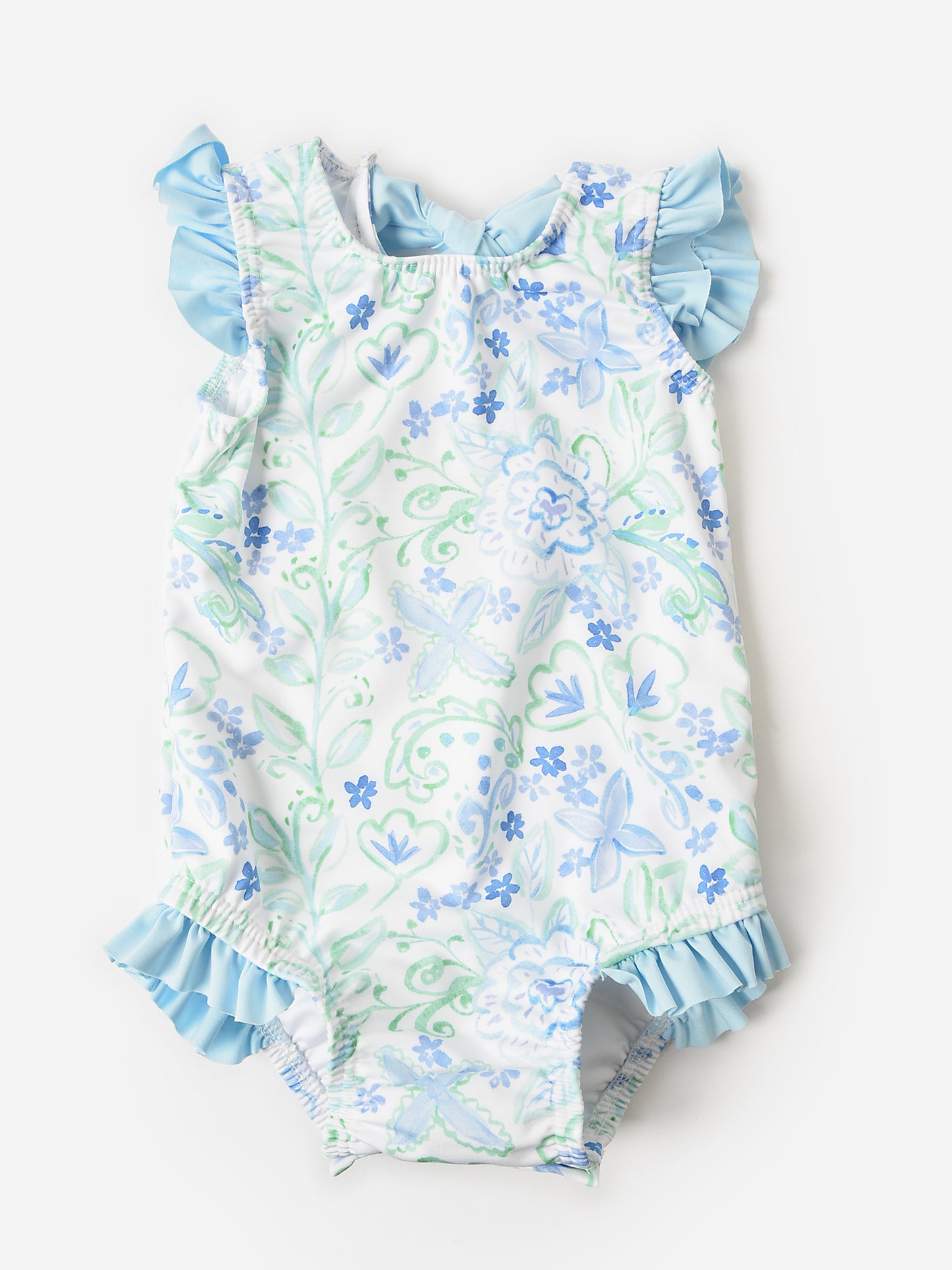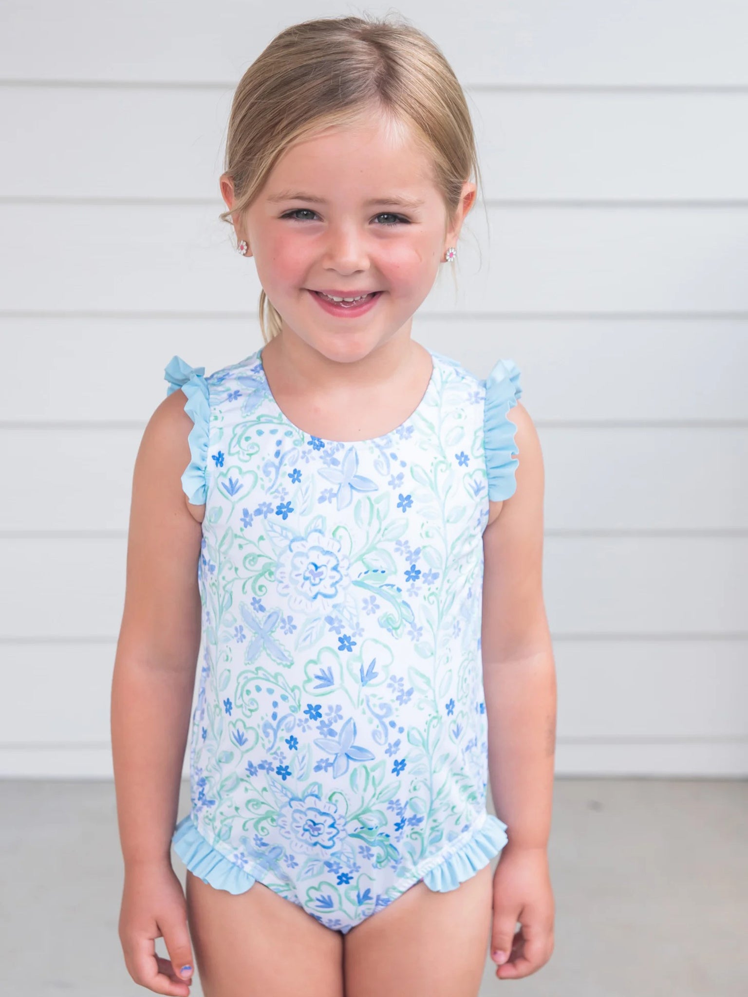 A floral-printed one-piece swimsuit with dainty ruffle trims.