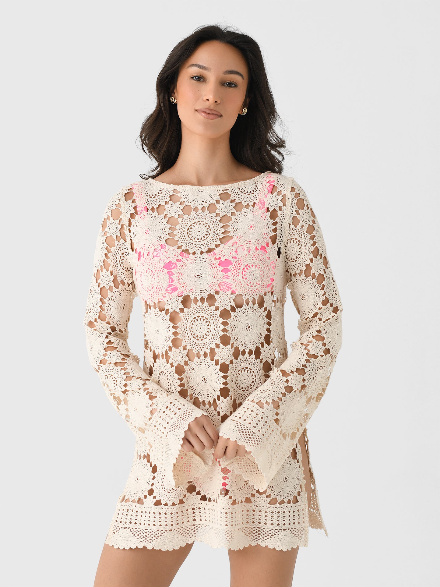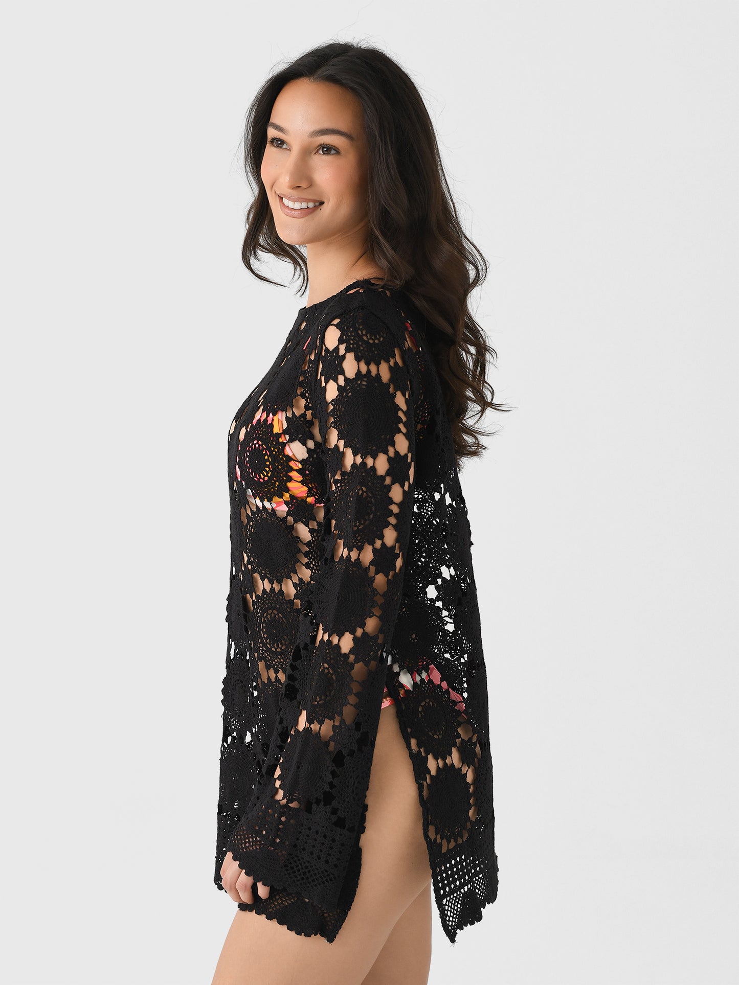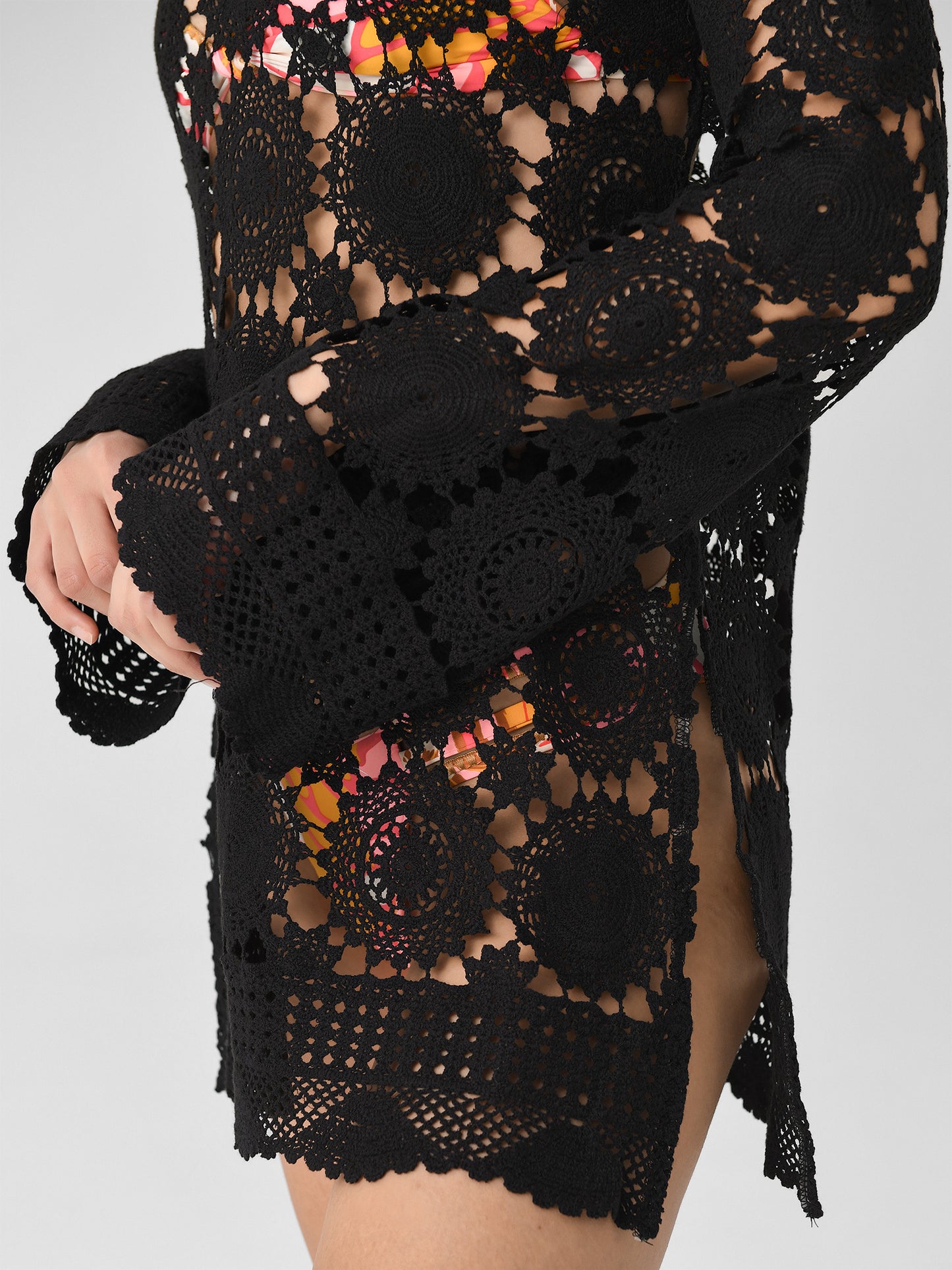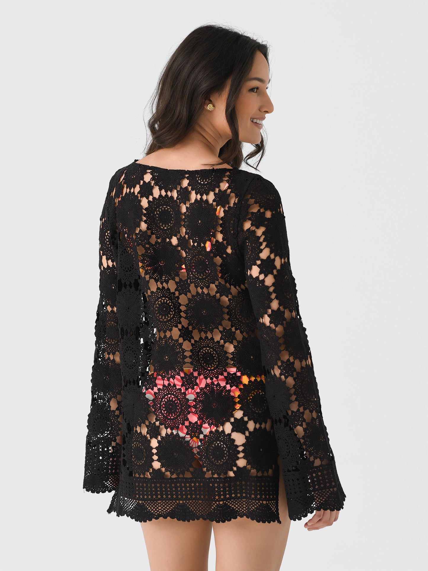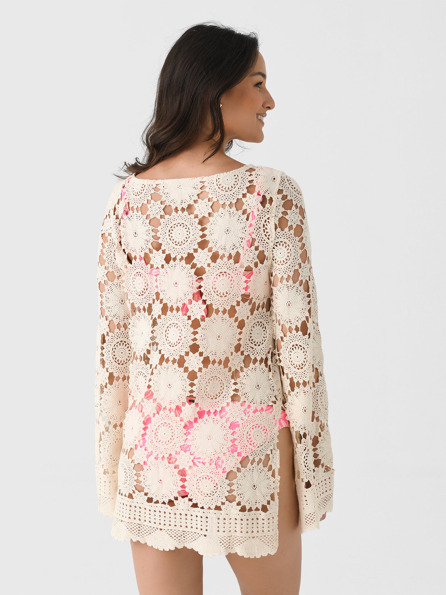 A lightweight cover-up made from crochet cotton fabric and finished with bell sleeves and a split hem.