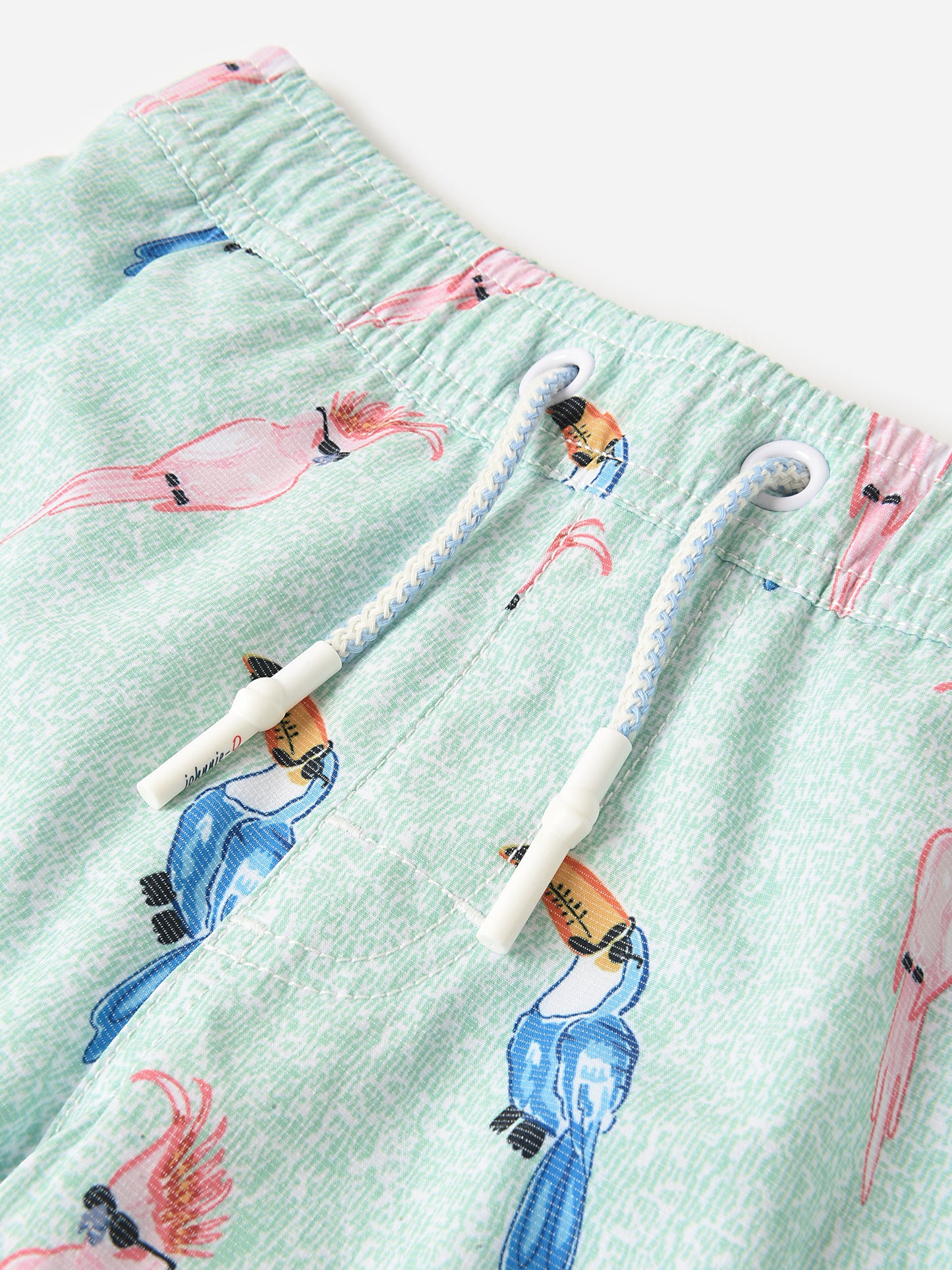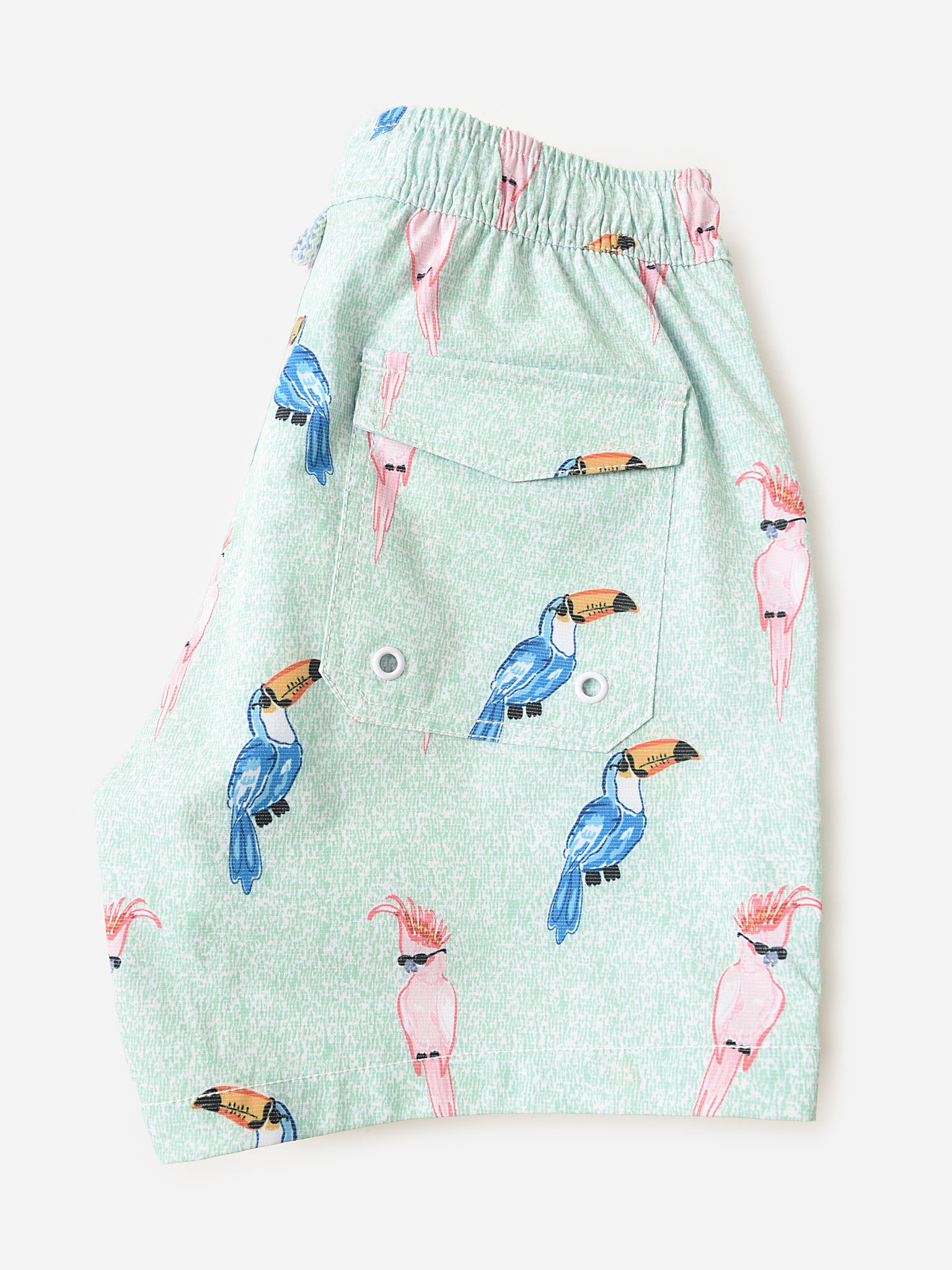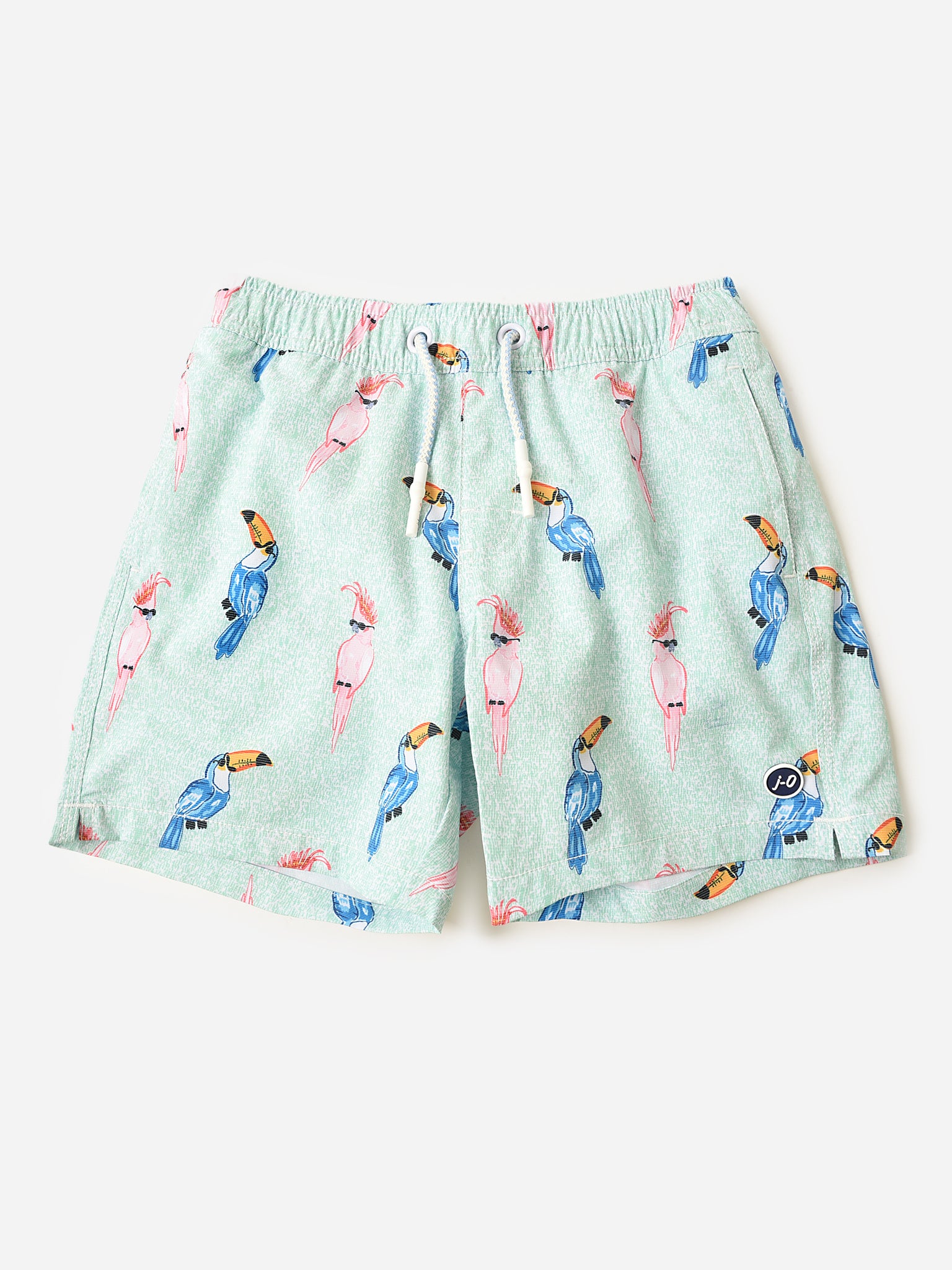 A classic swim trunk with a full mesh lining and a colorful bird print.