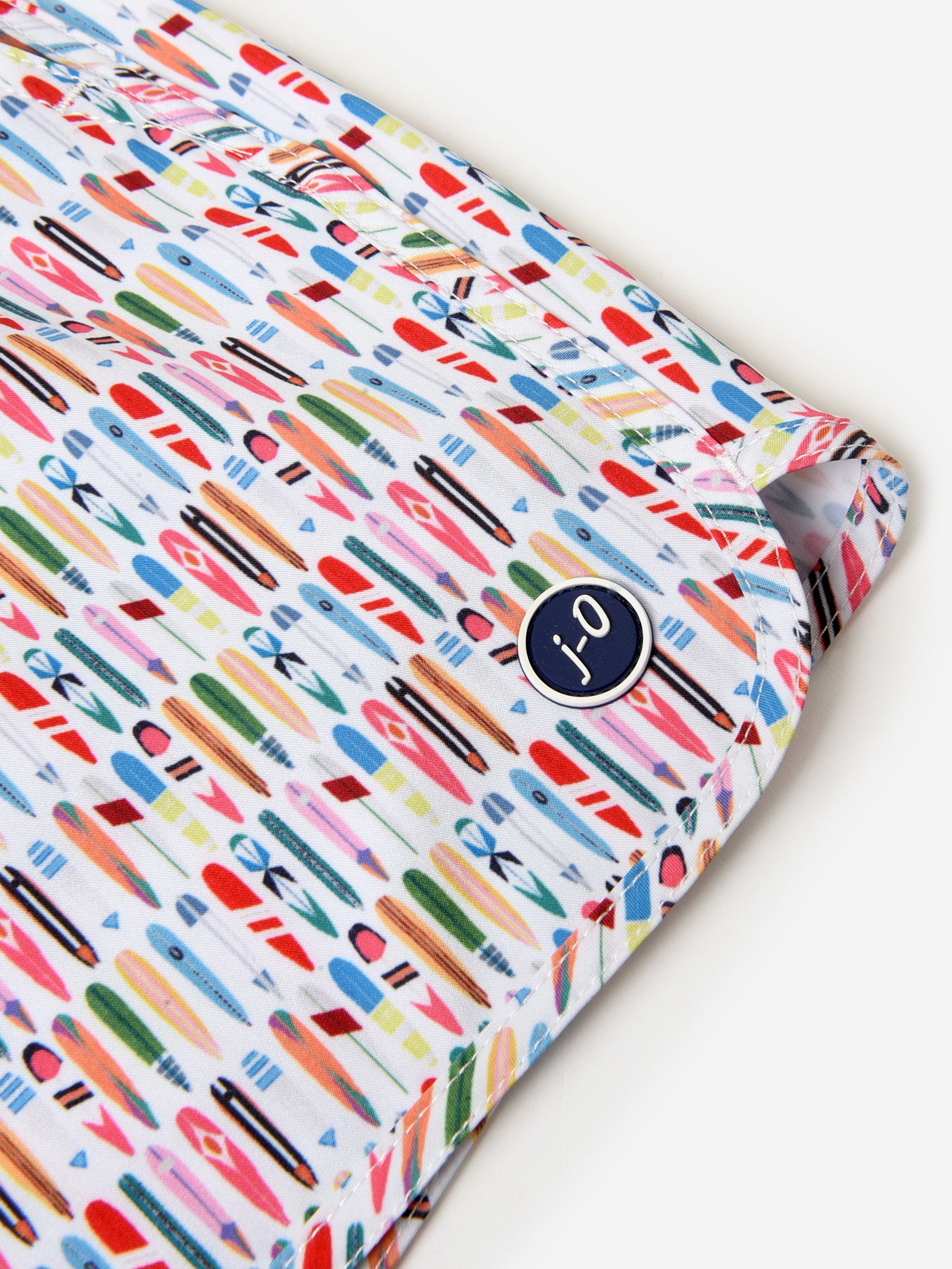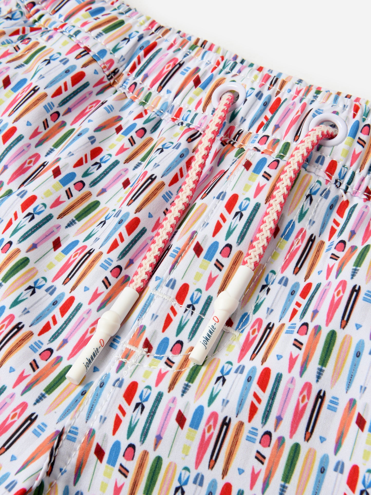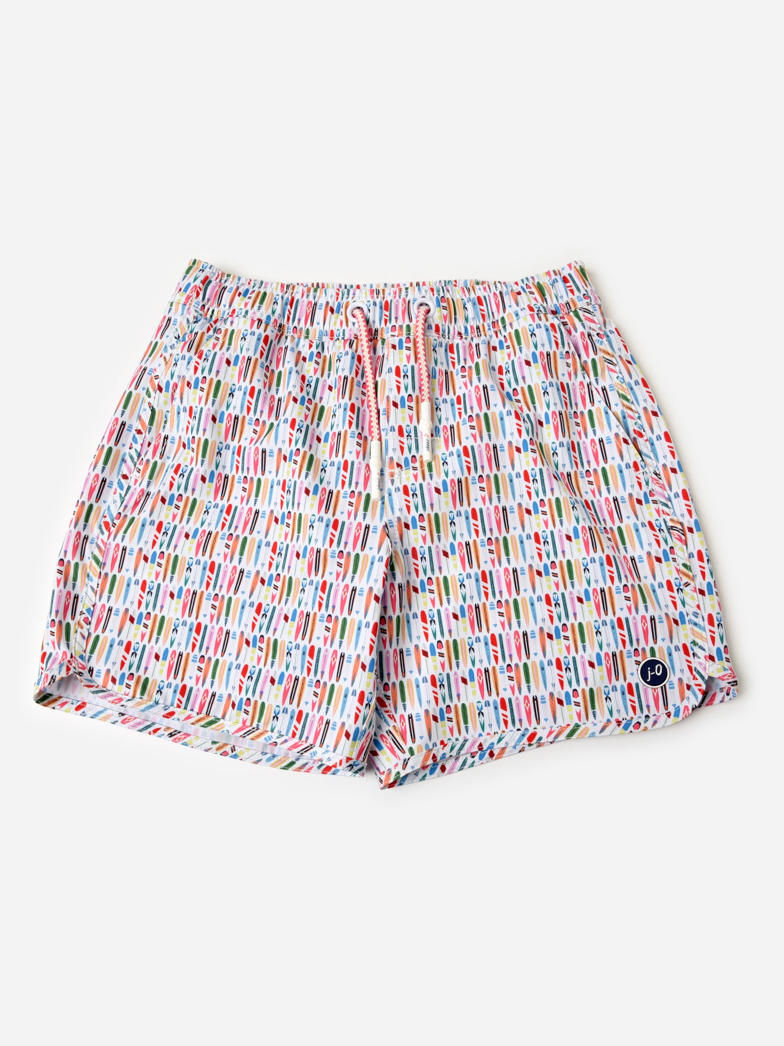 A lightweight swim trunk with a mesh lining and custom surfboard print.
