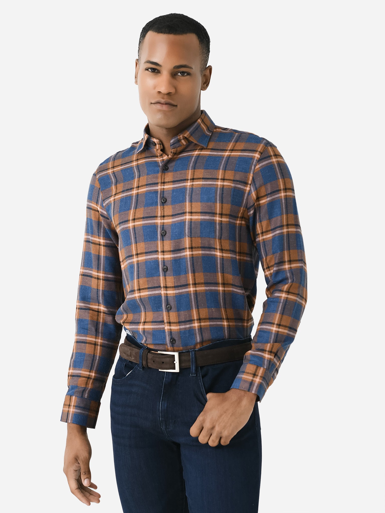 A soft woven button-down shirt made from premium cotton with a two-tone plaid print.