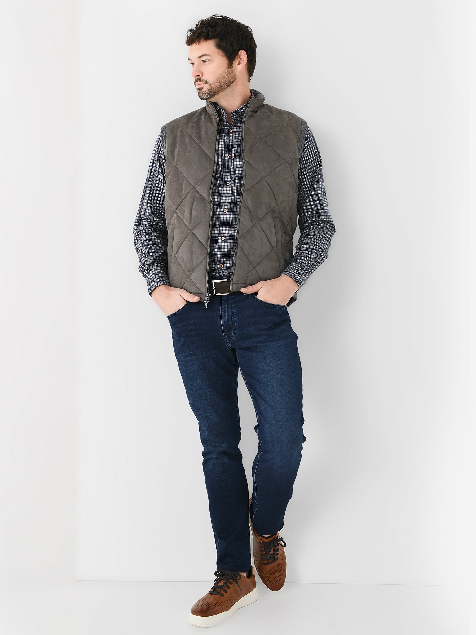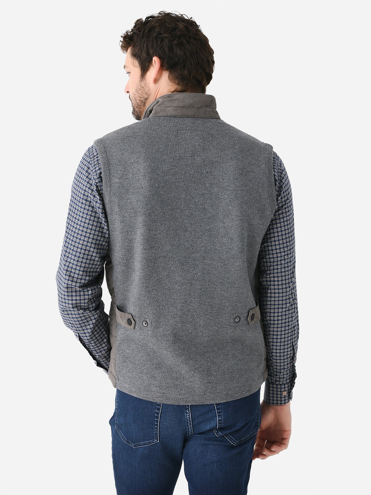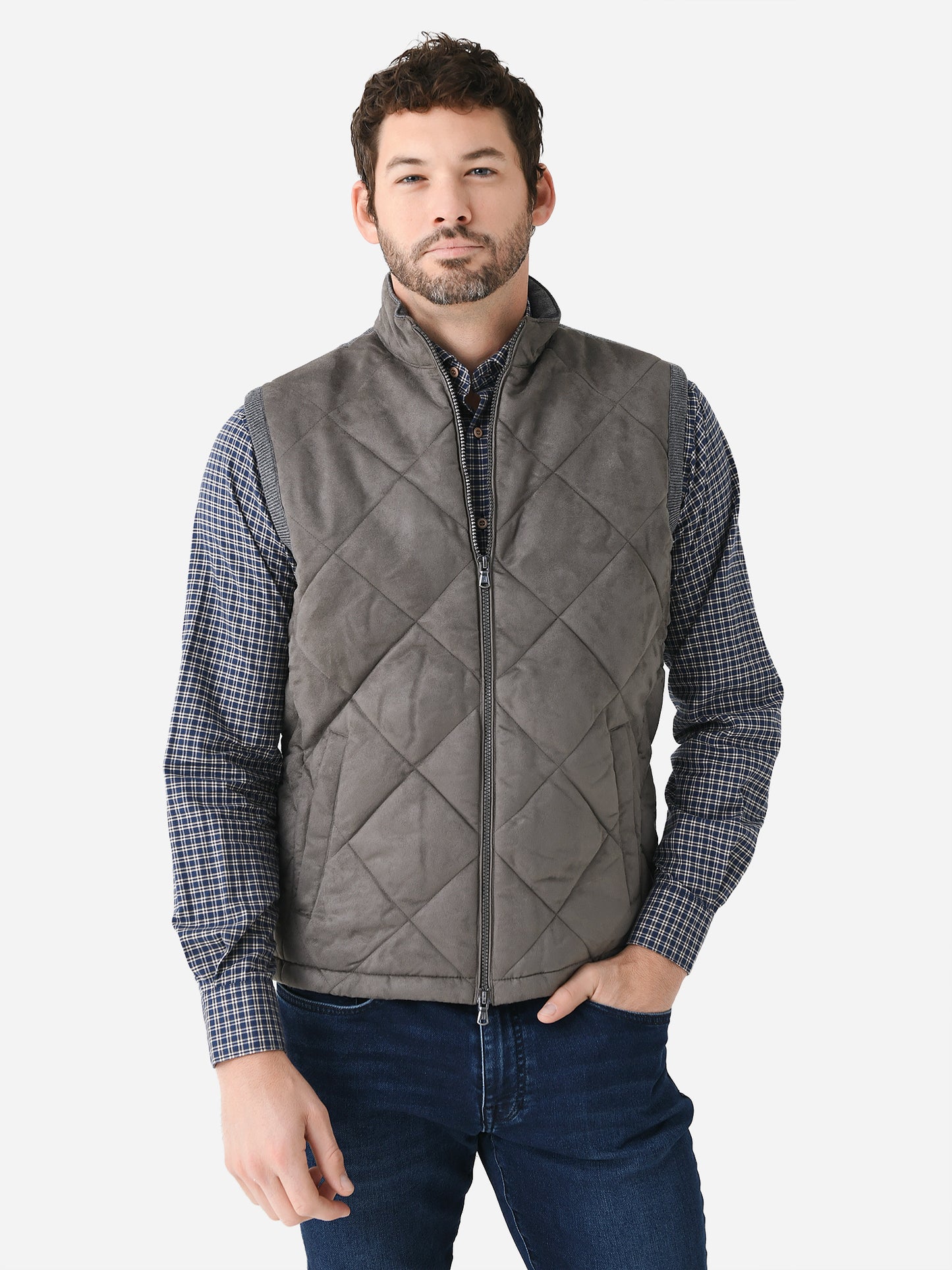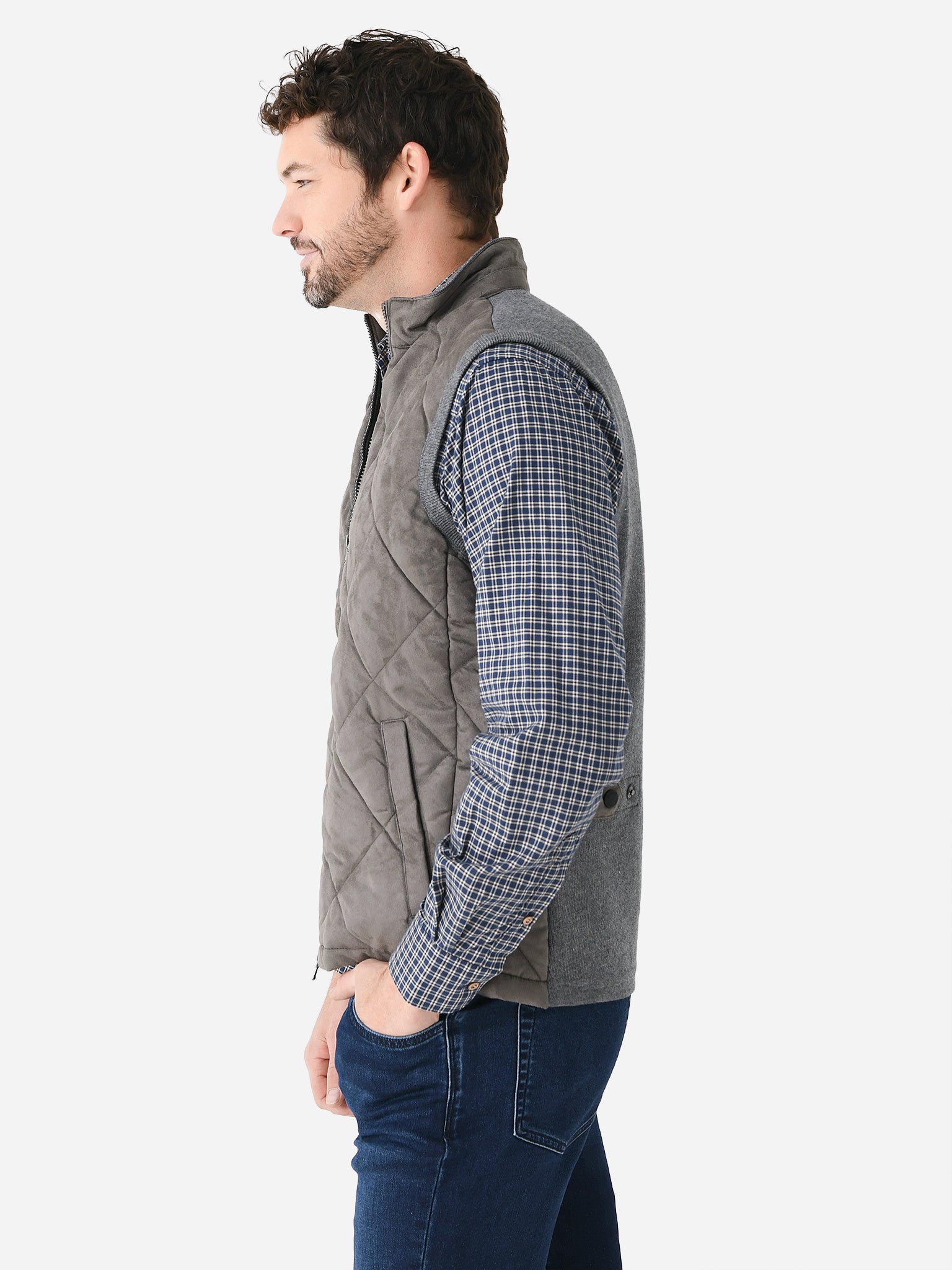 A soft faux suede quilted vest with a water-resistant sweater-like wool back.
