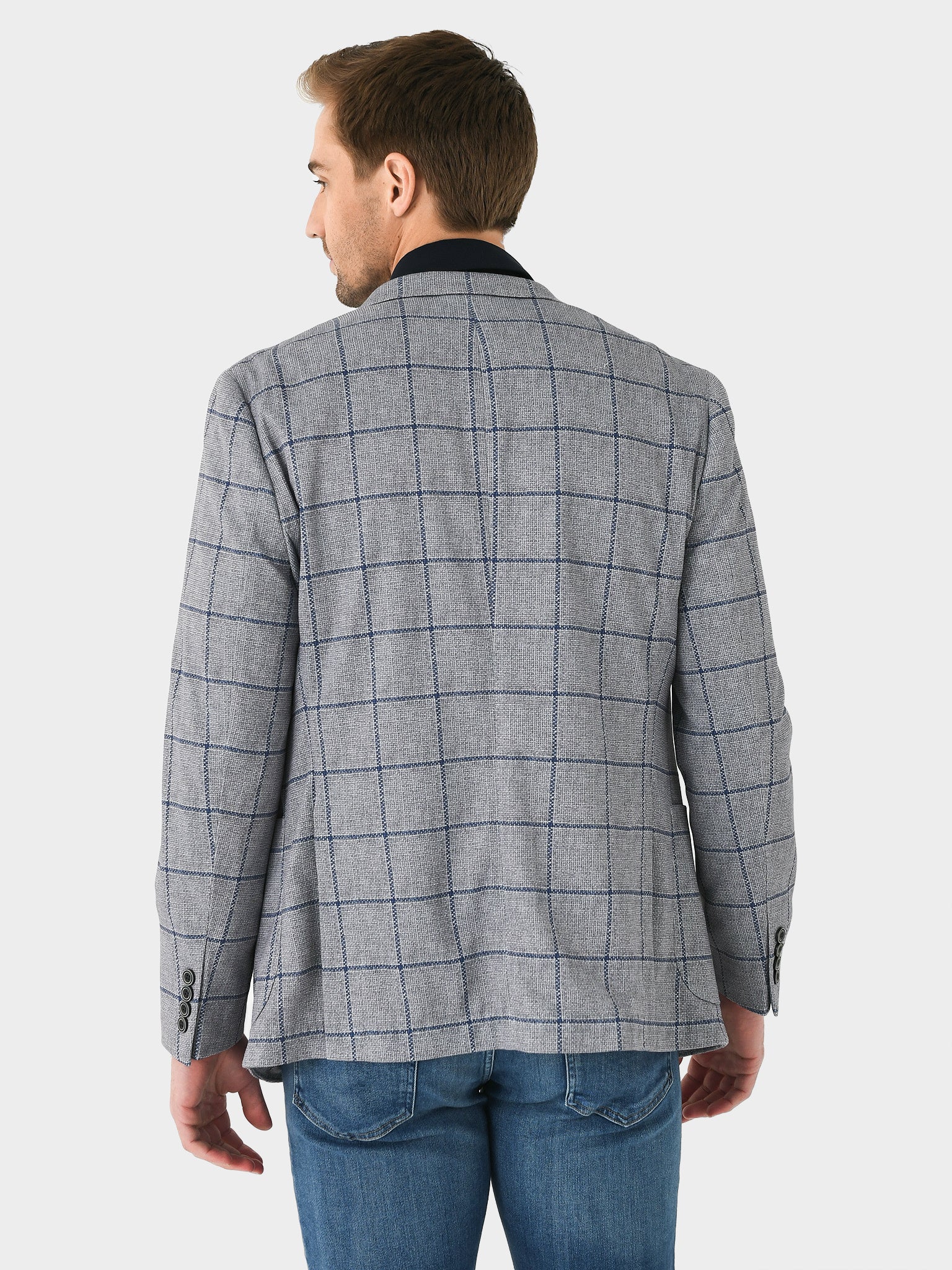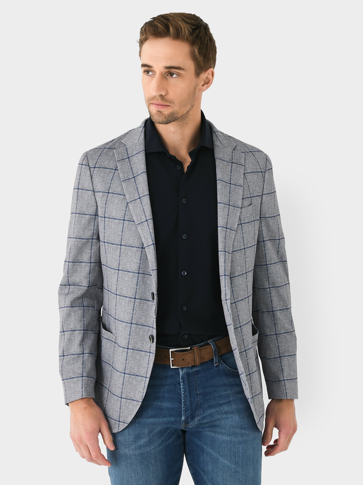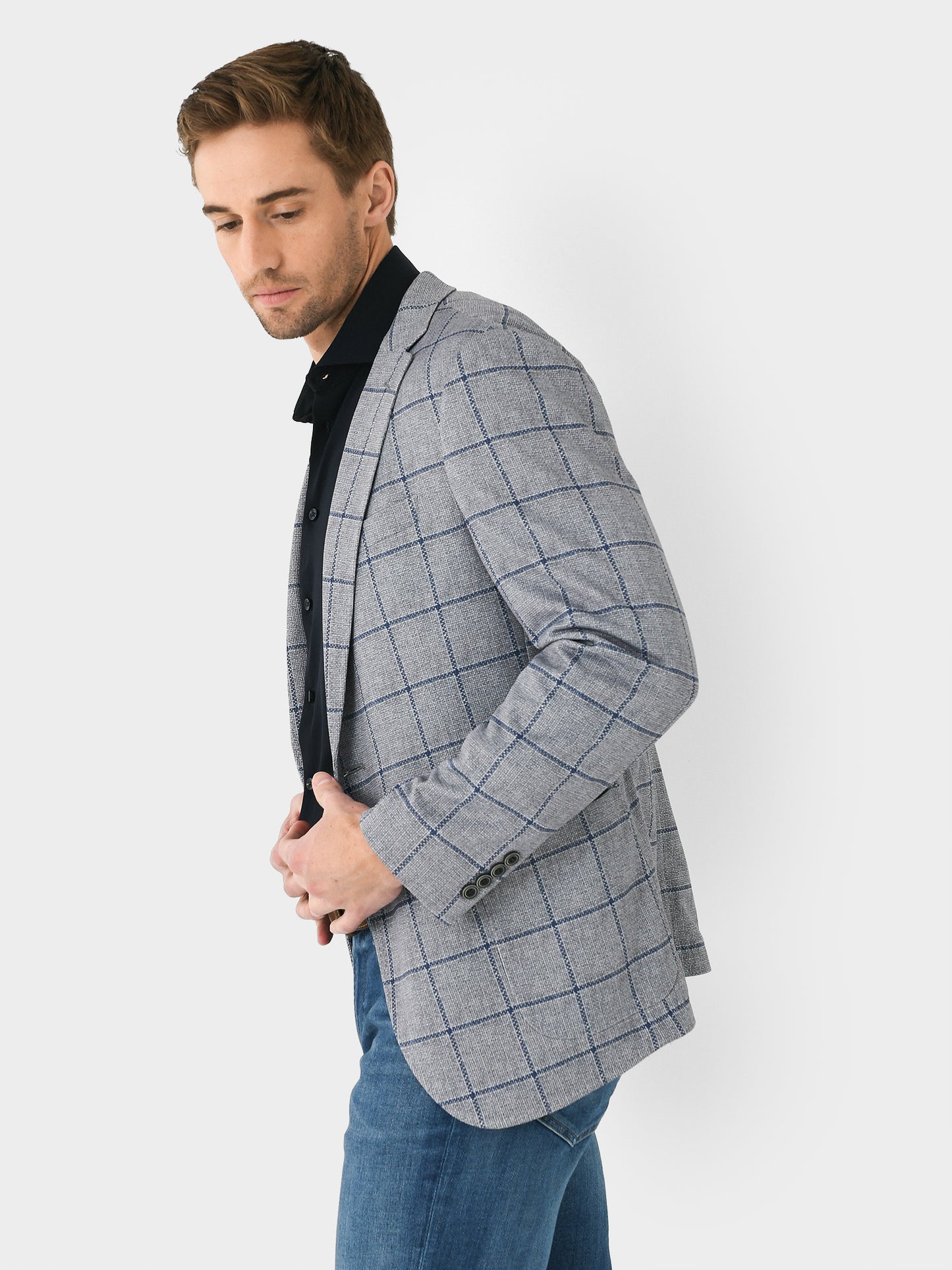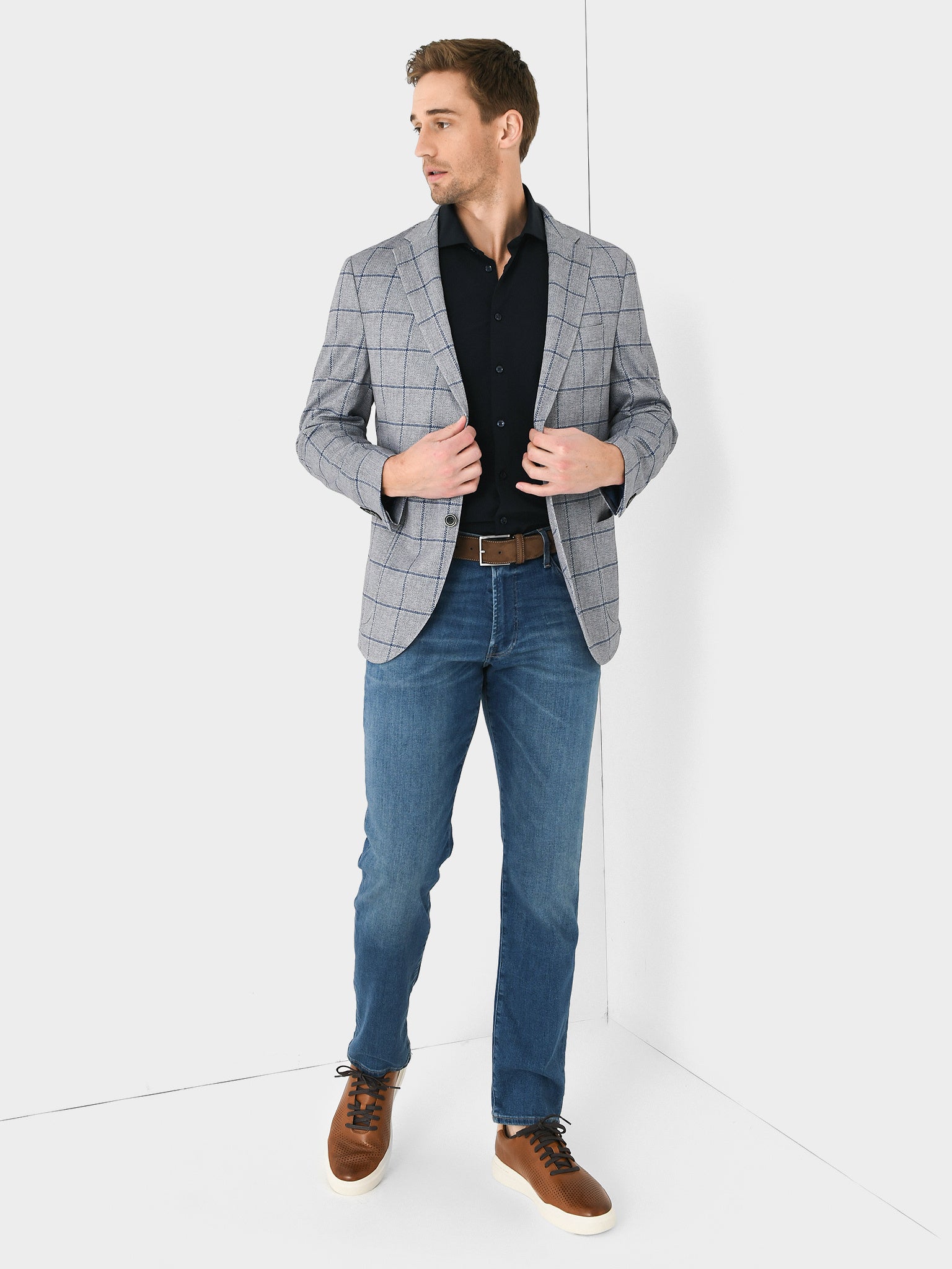 A classic, plaid sports coat made from lightweight woven fabric with a flattering tailored design.