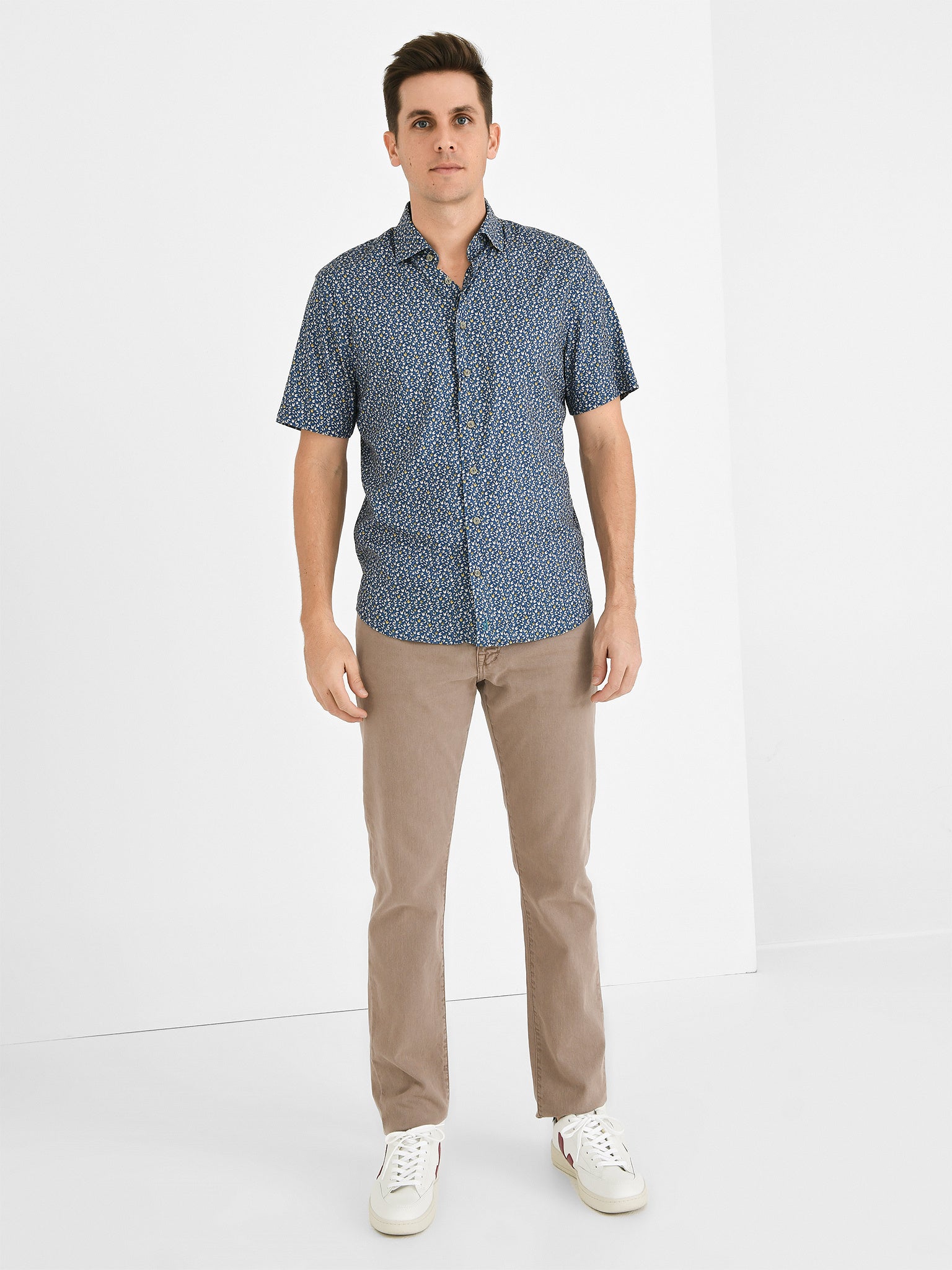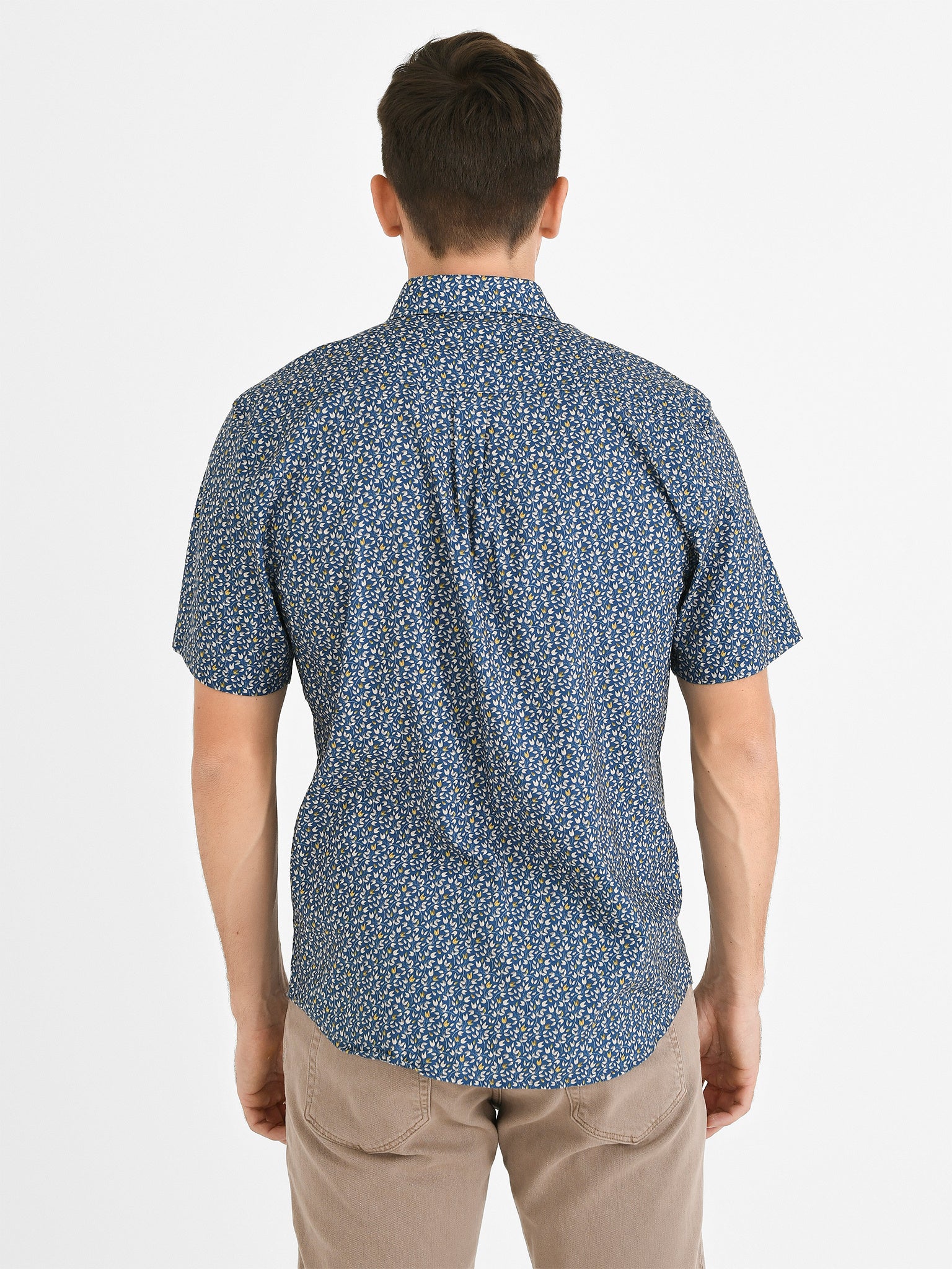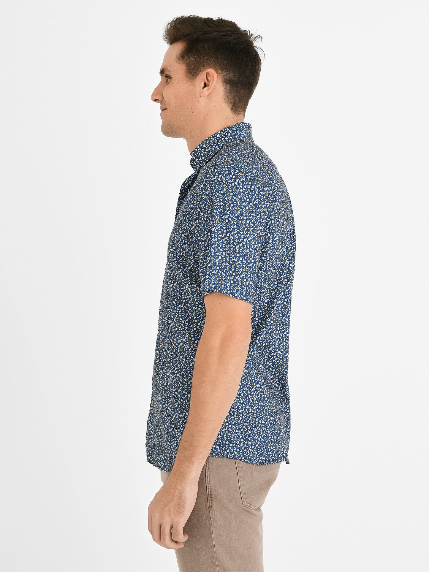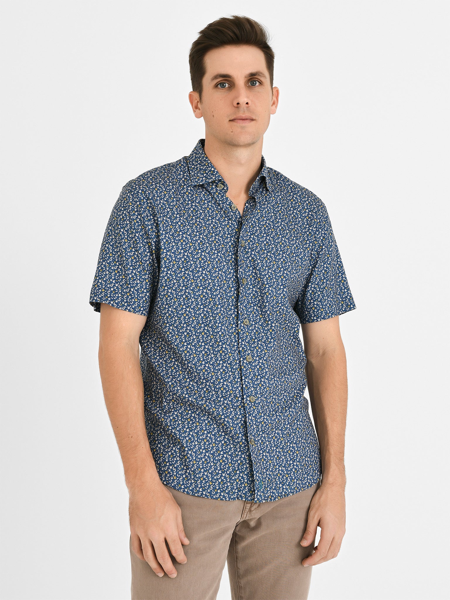 A lightweight cotton blend button-down shirt featuring a subtle floral print.