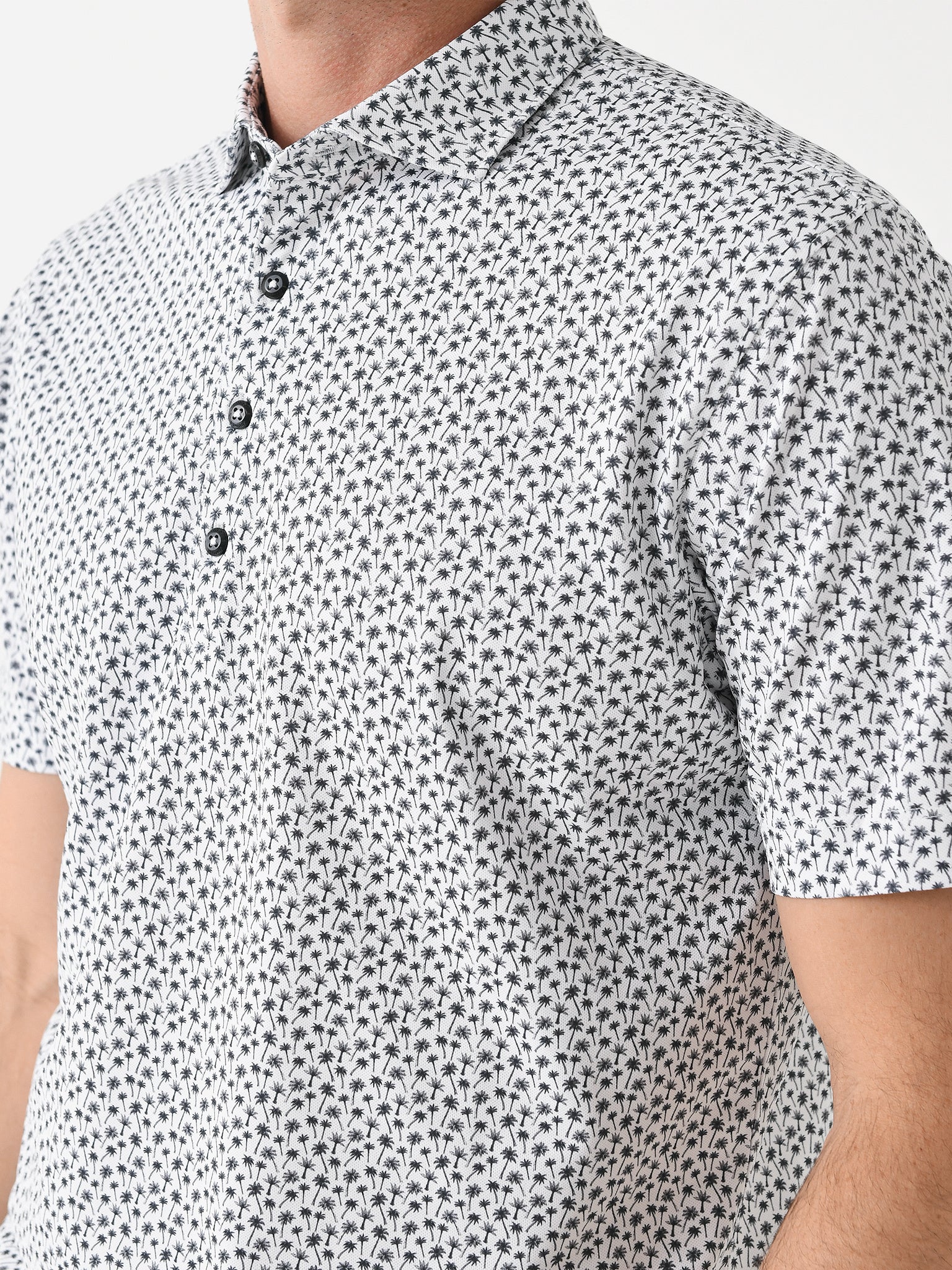 A lightweight polo constructed from breathable mesh fabric and designed with a custom palm tree print.