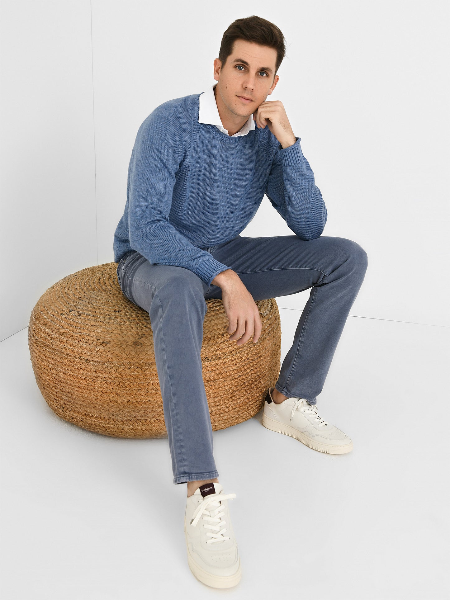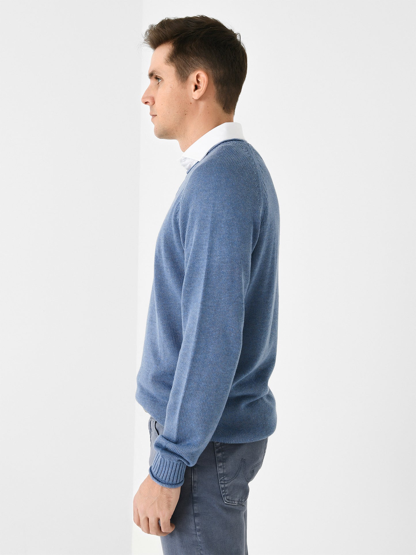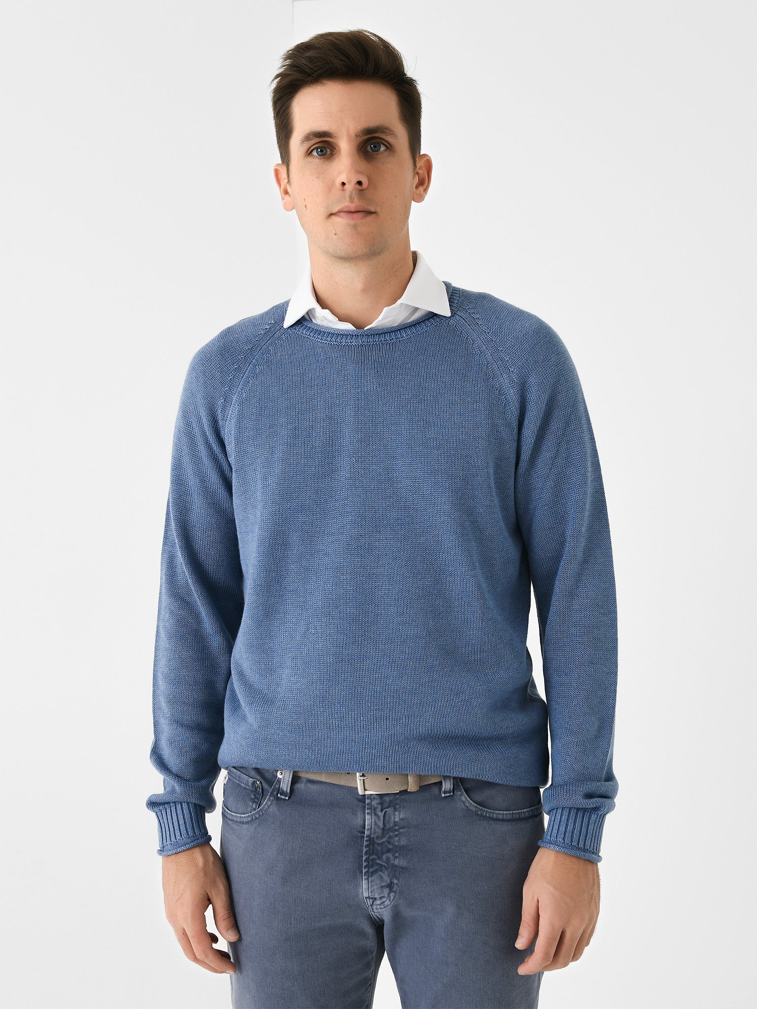 A timeless crewneck sweater with a heathered knit pattern made from premium Tencel and linen fabric.