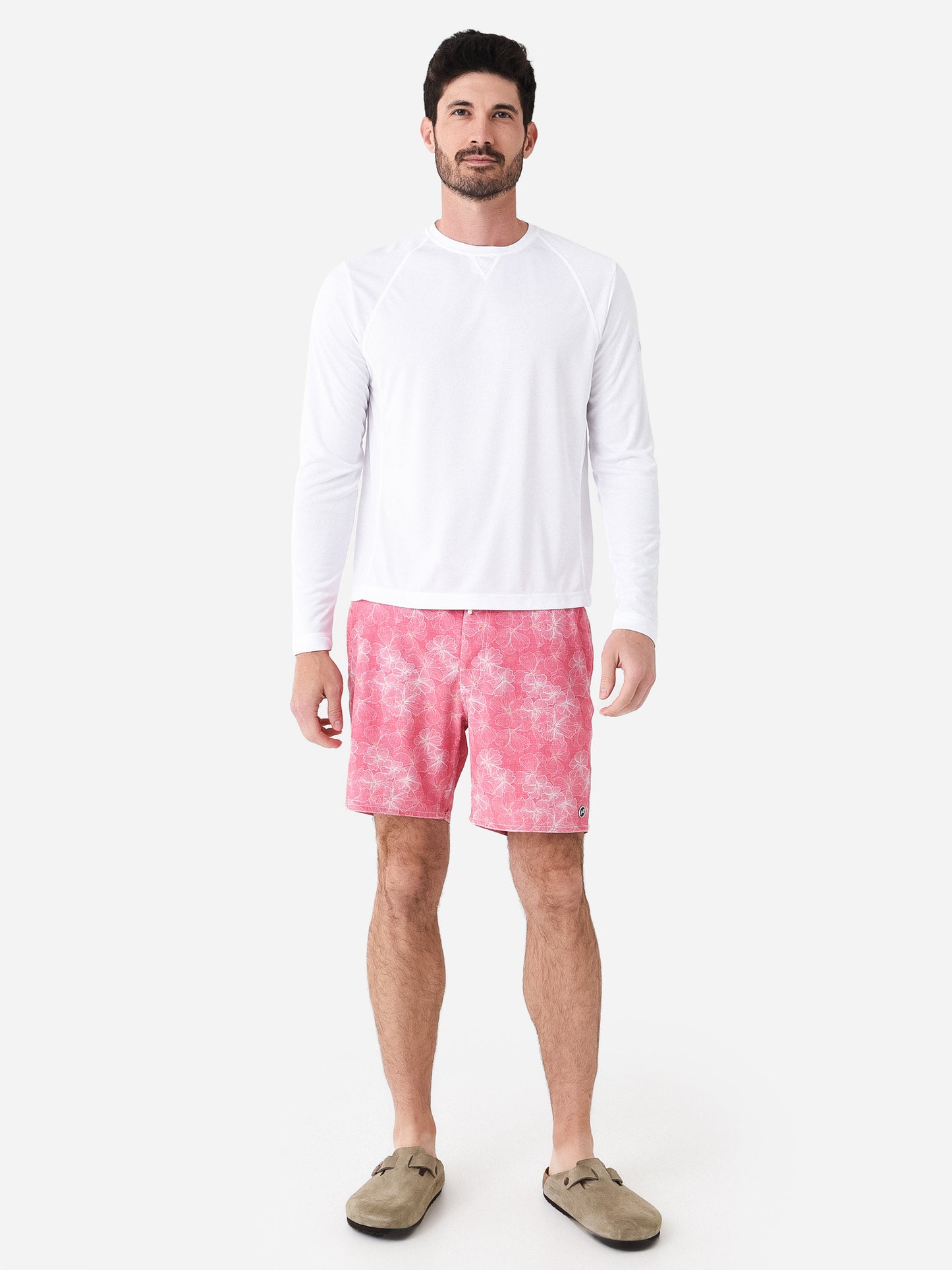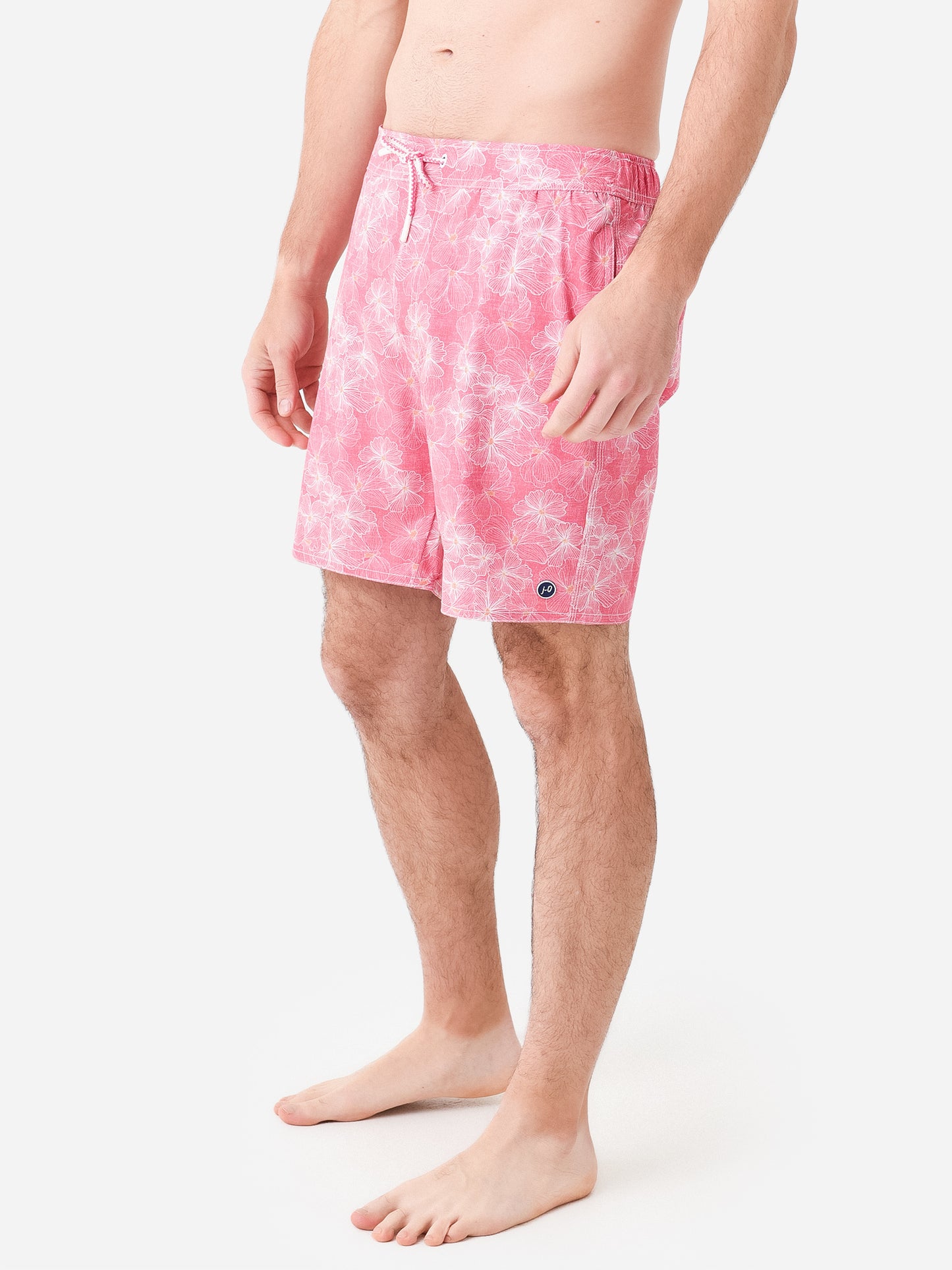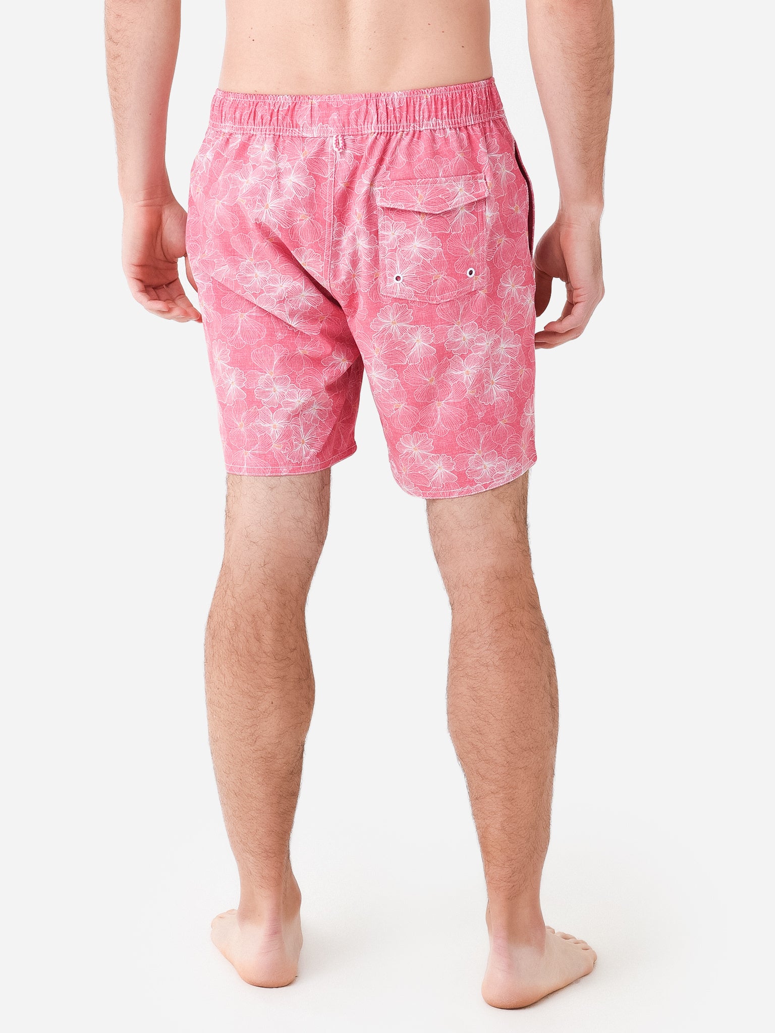 Floral-printed swim trunk with a comfortable half-elastic waistband and mesh lining.