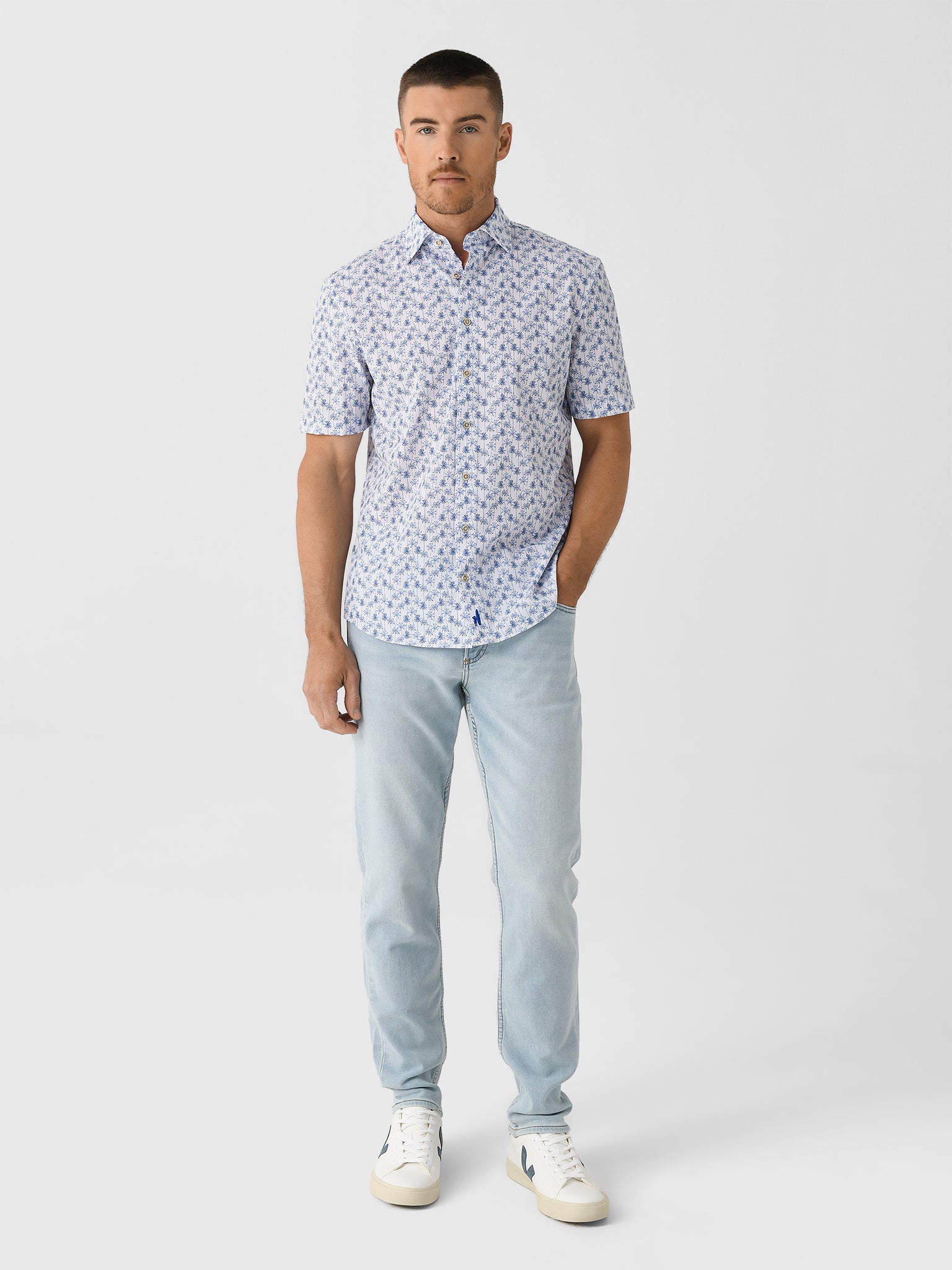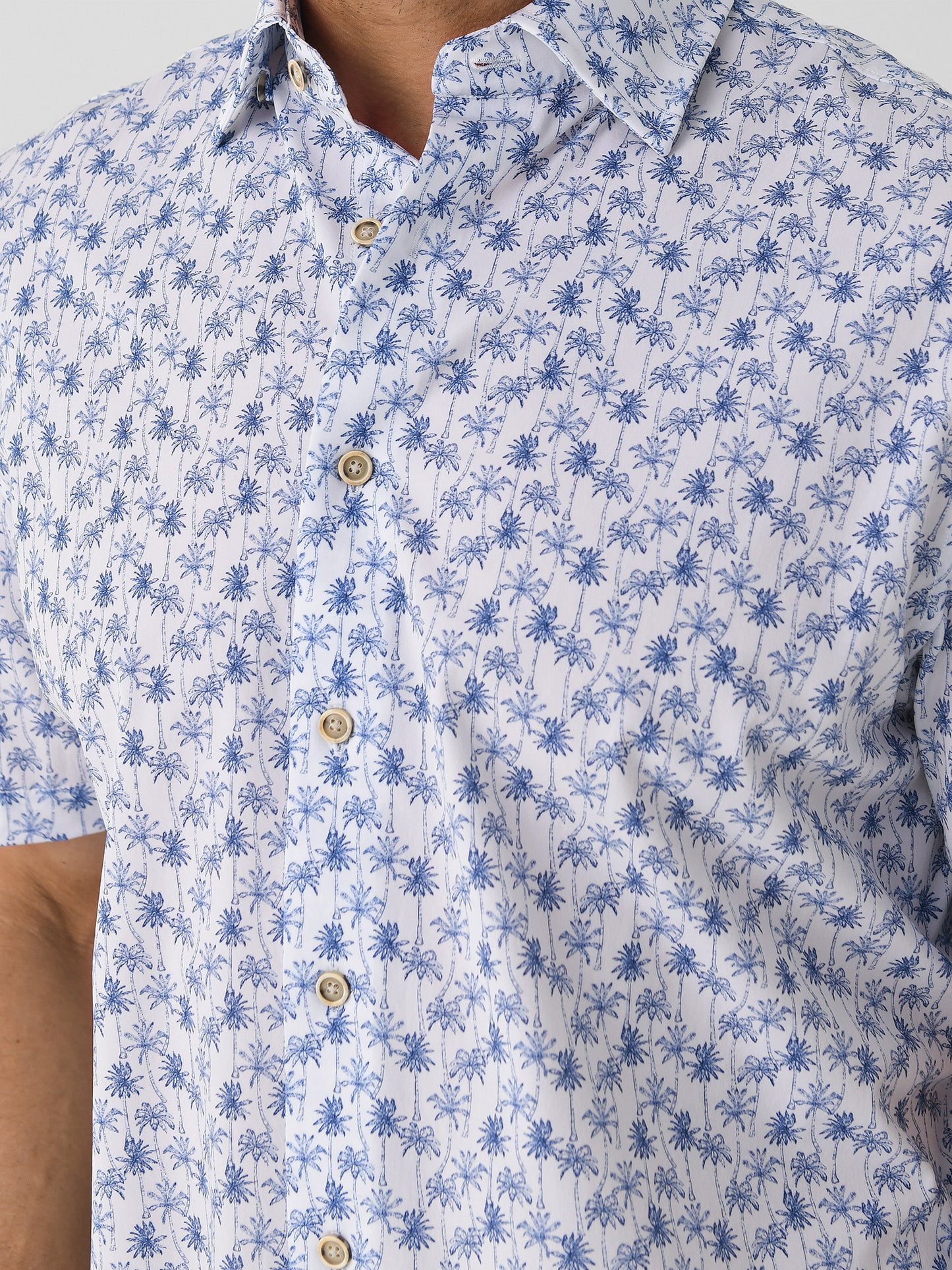 This casual button-down is made from soft and breathable knit fabric and features a custom palm tree print.