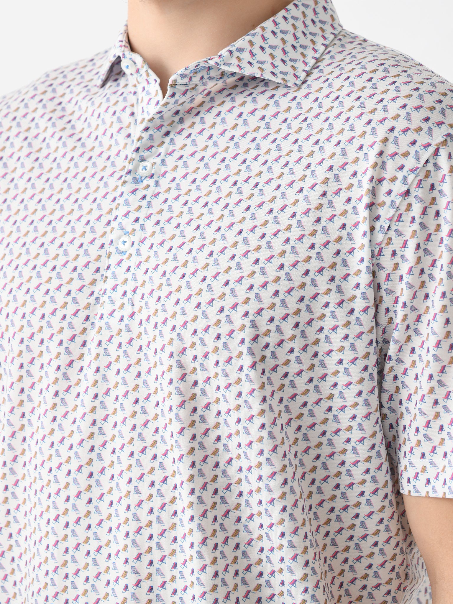Wrinkle-resistant polo made from ultra-soft performance fabric with a custom beach chair print.