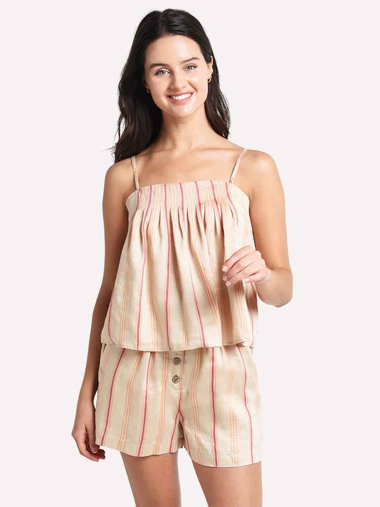 - Styled with Joie top # 19-1-004868-SH00693 and Valia Gabriel sandals style # VG-0046. Model is wearing size Small top and bottom.