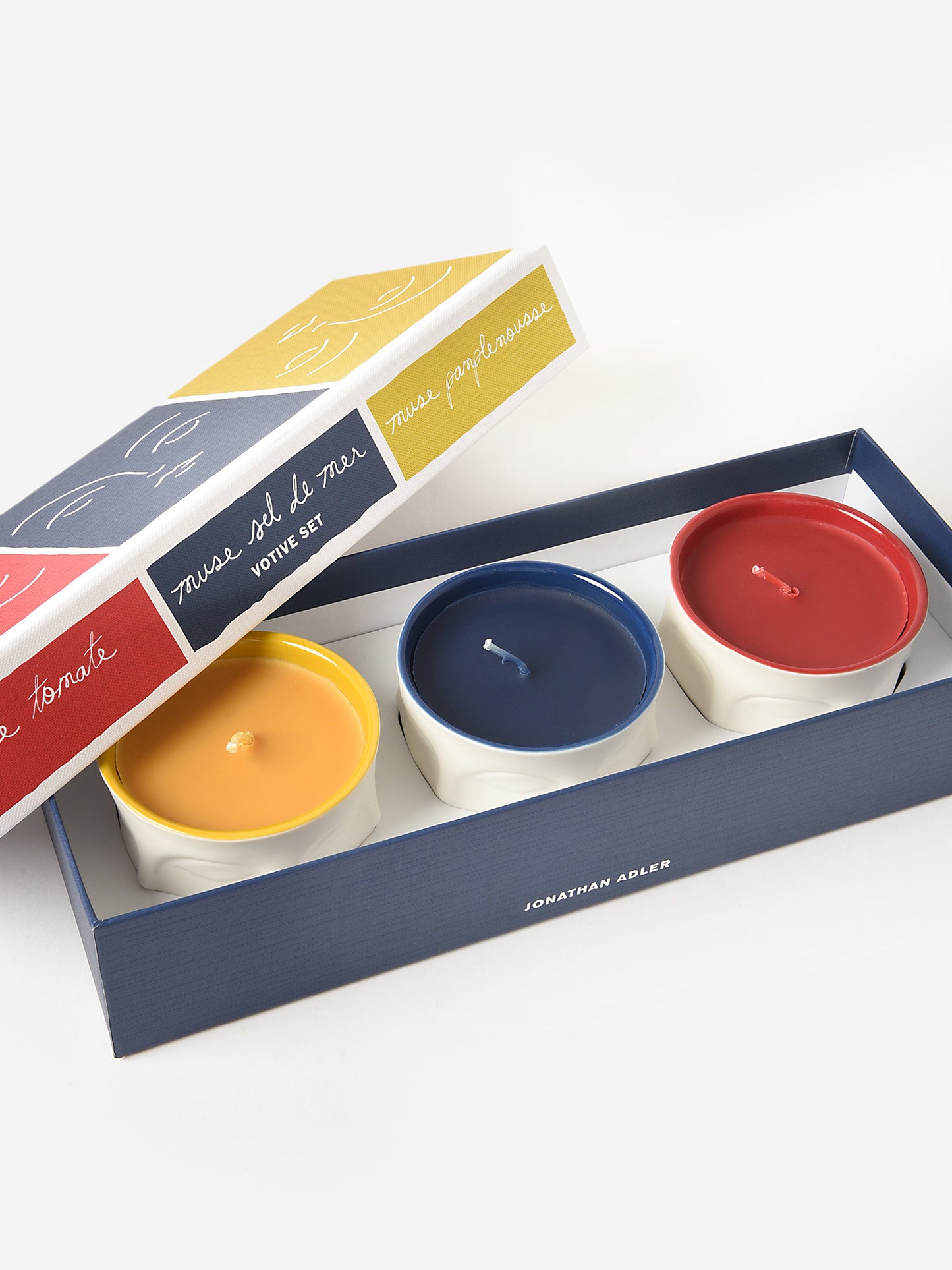 A set of three scented candles finished with a glossy, bold-colored wax.