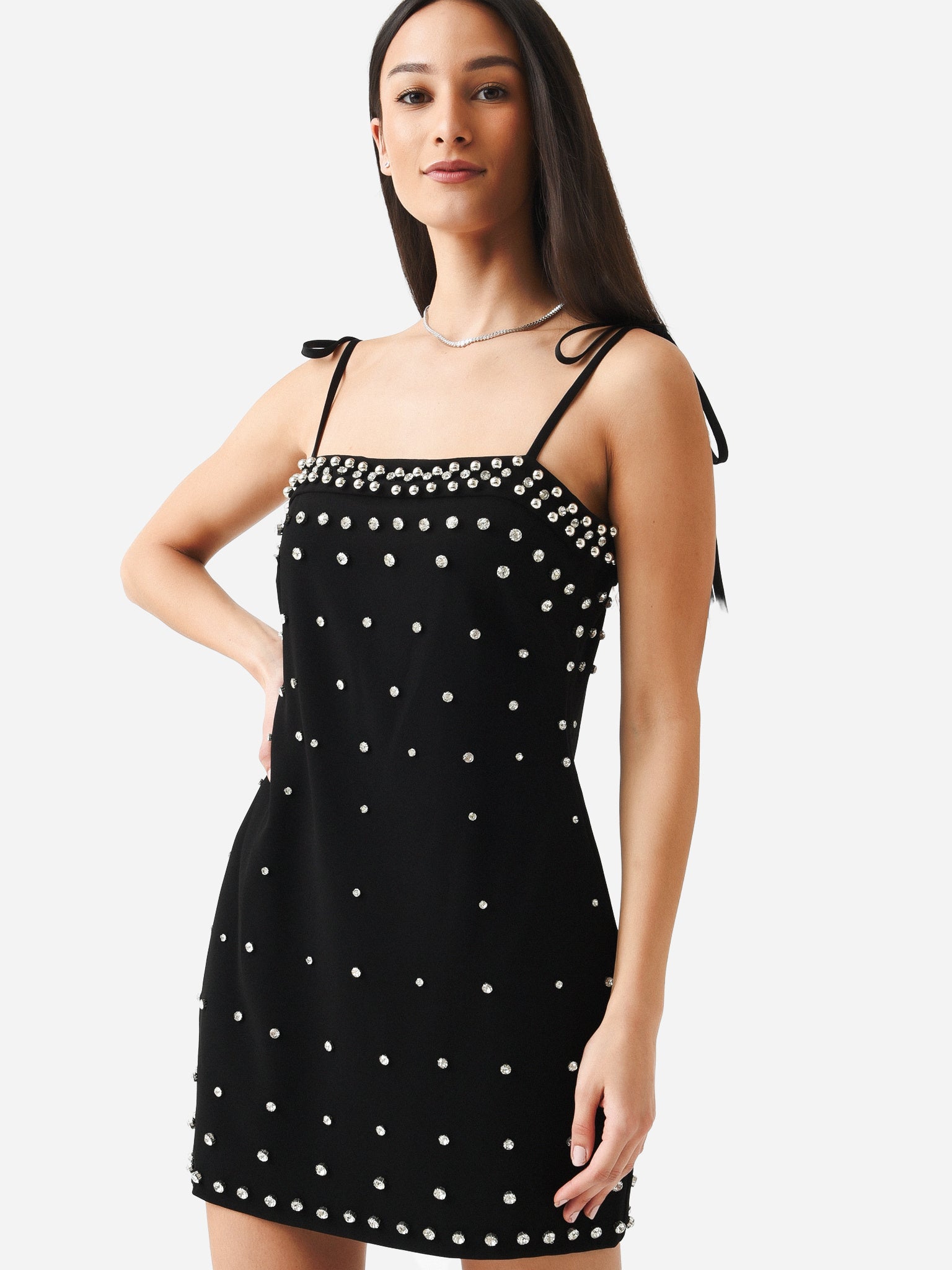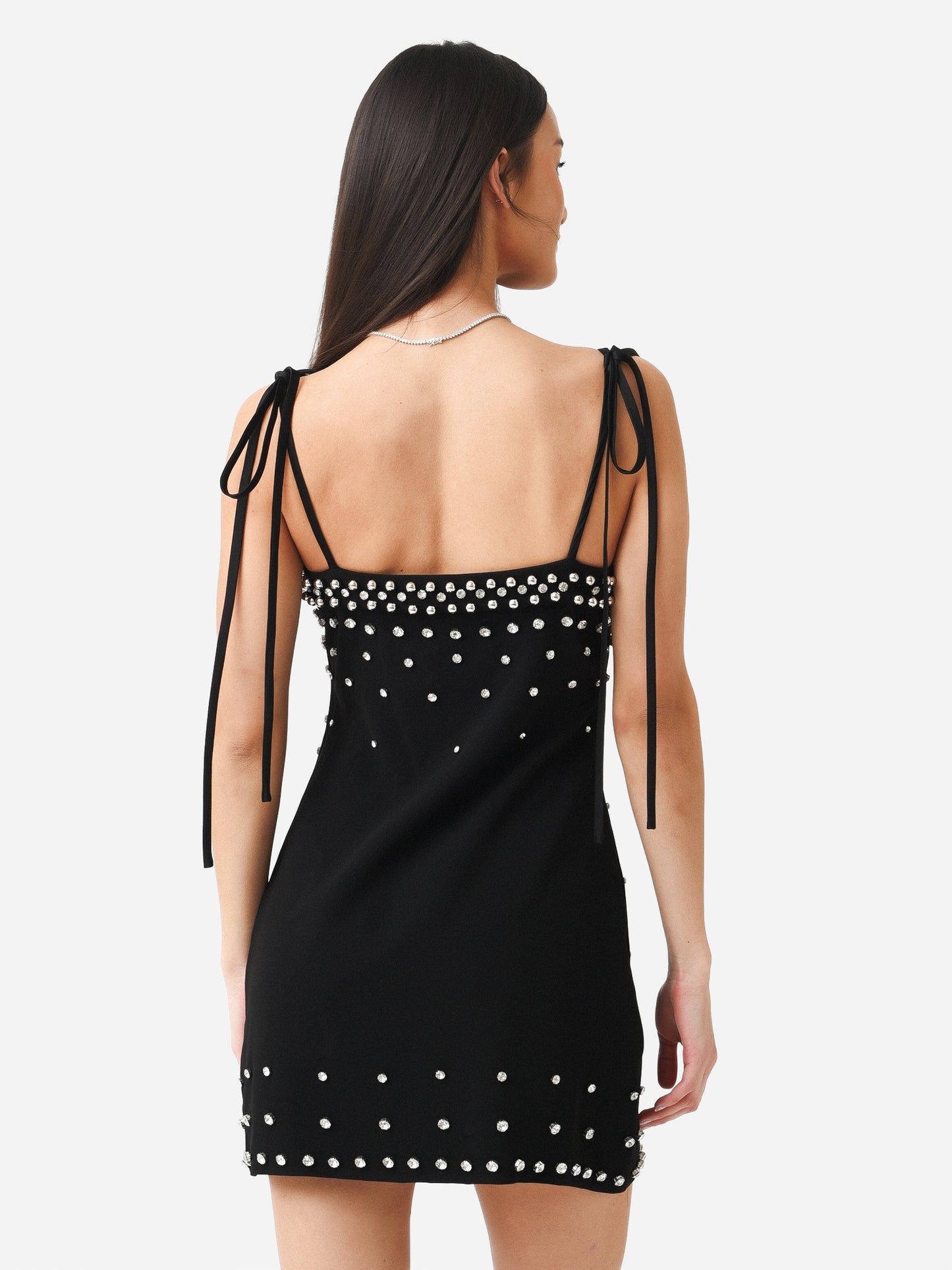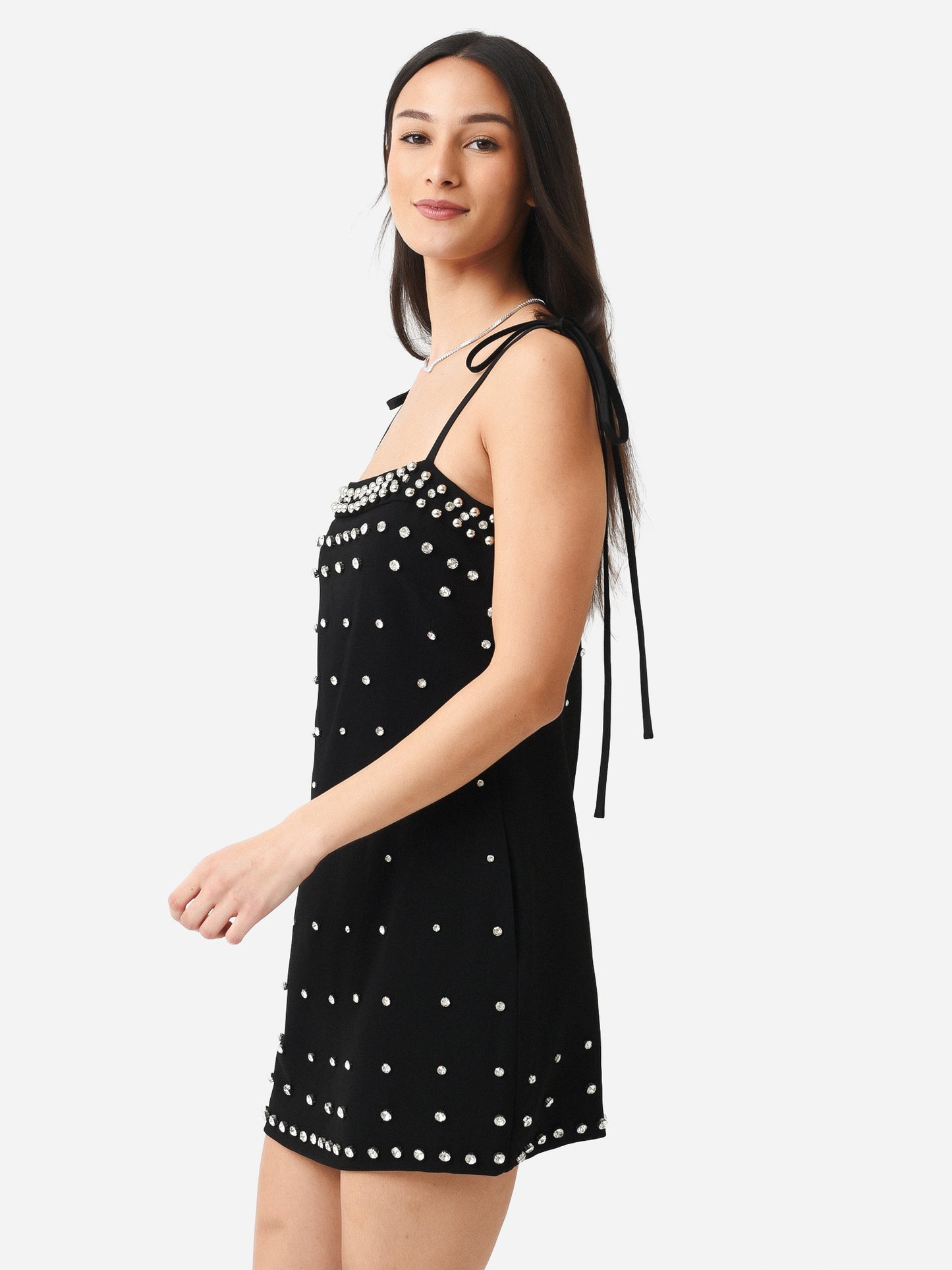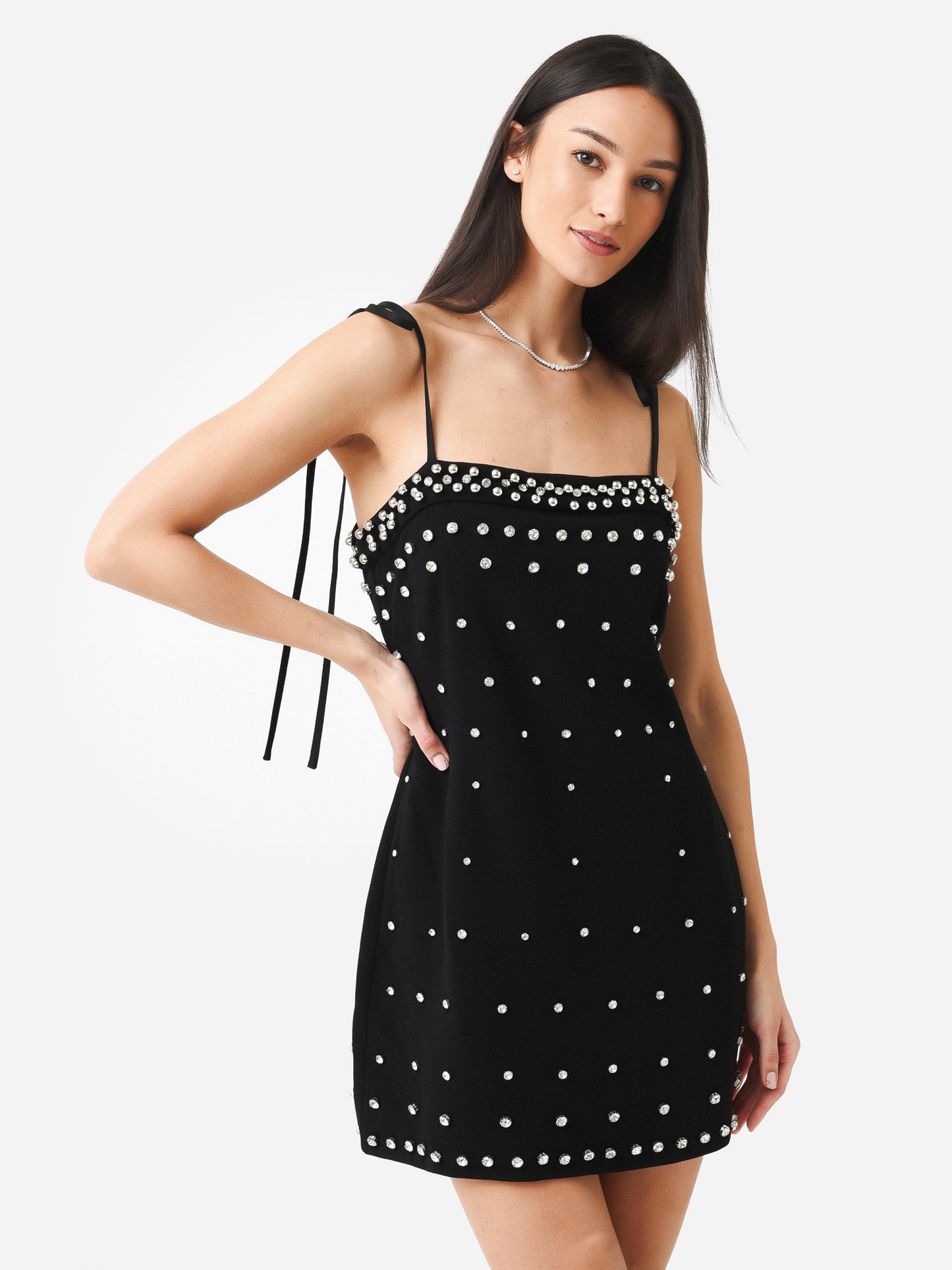 A jaunty mini dress with self-tie straps and crystal stud embellishments.