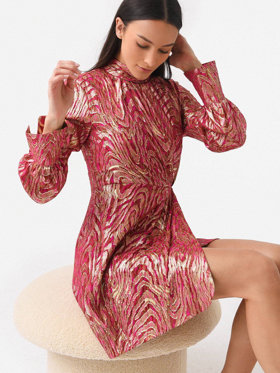 Stunning mini dress made from a silk blend fil coupé overlayed with a glittering metallic jacquard brocade fabric.