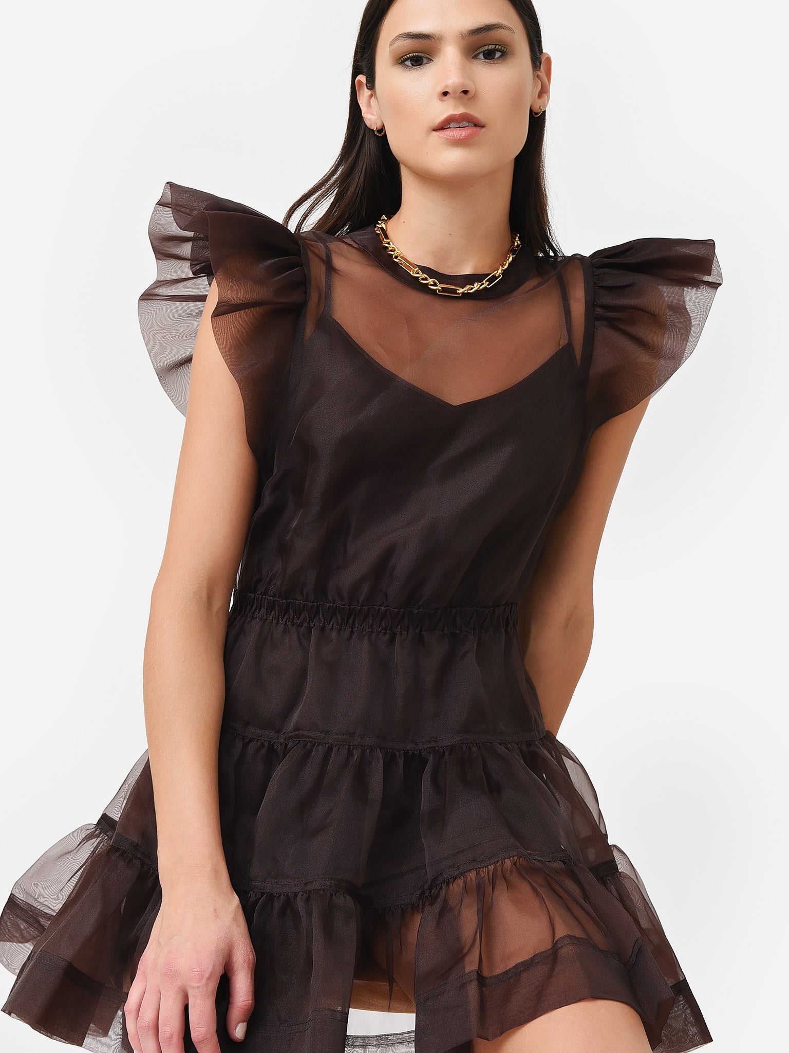 Sheer organza mini dress with exaggerated ruffle sleeves.