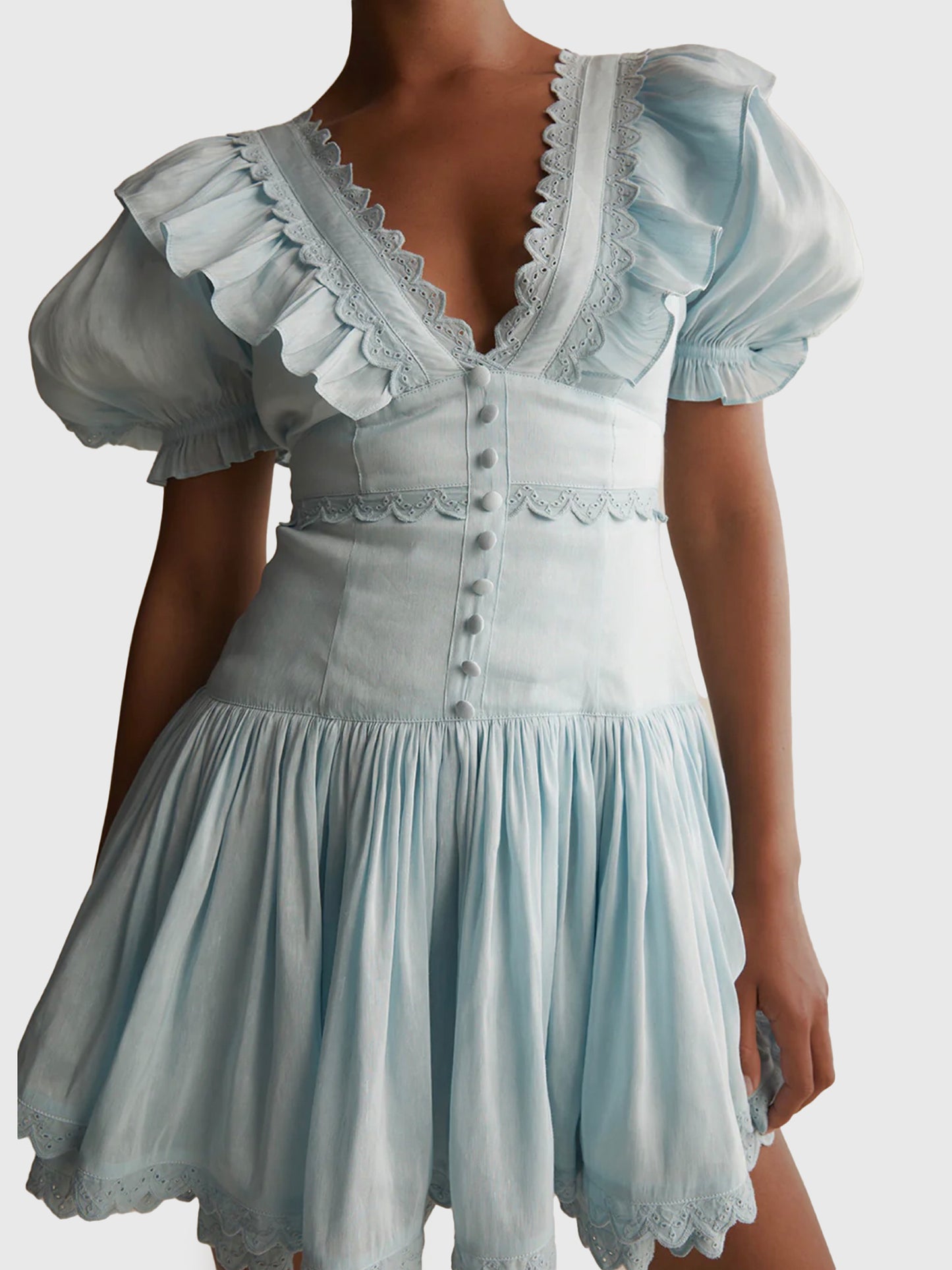 Crafted from a luxurious silk-linen blend slub organza fabric, this dress features a modest plunge neckline framed in scalloped embroidery and a contrasting cotton broderie underskirt. It has a softly fitted waist, voluminous sleeves with elasticated cuffs, and self-spaghetti ties at the back shoulder.