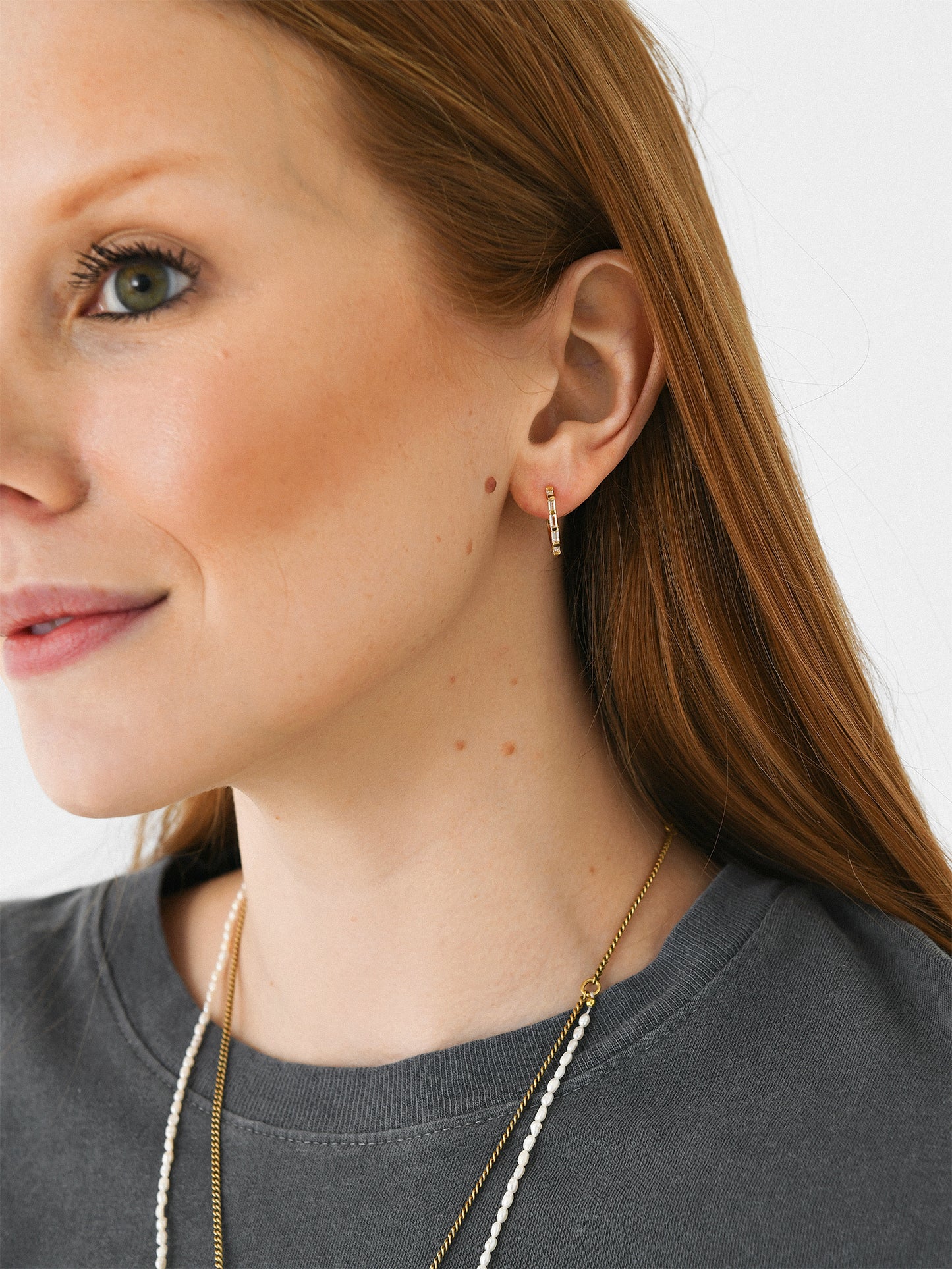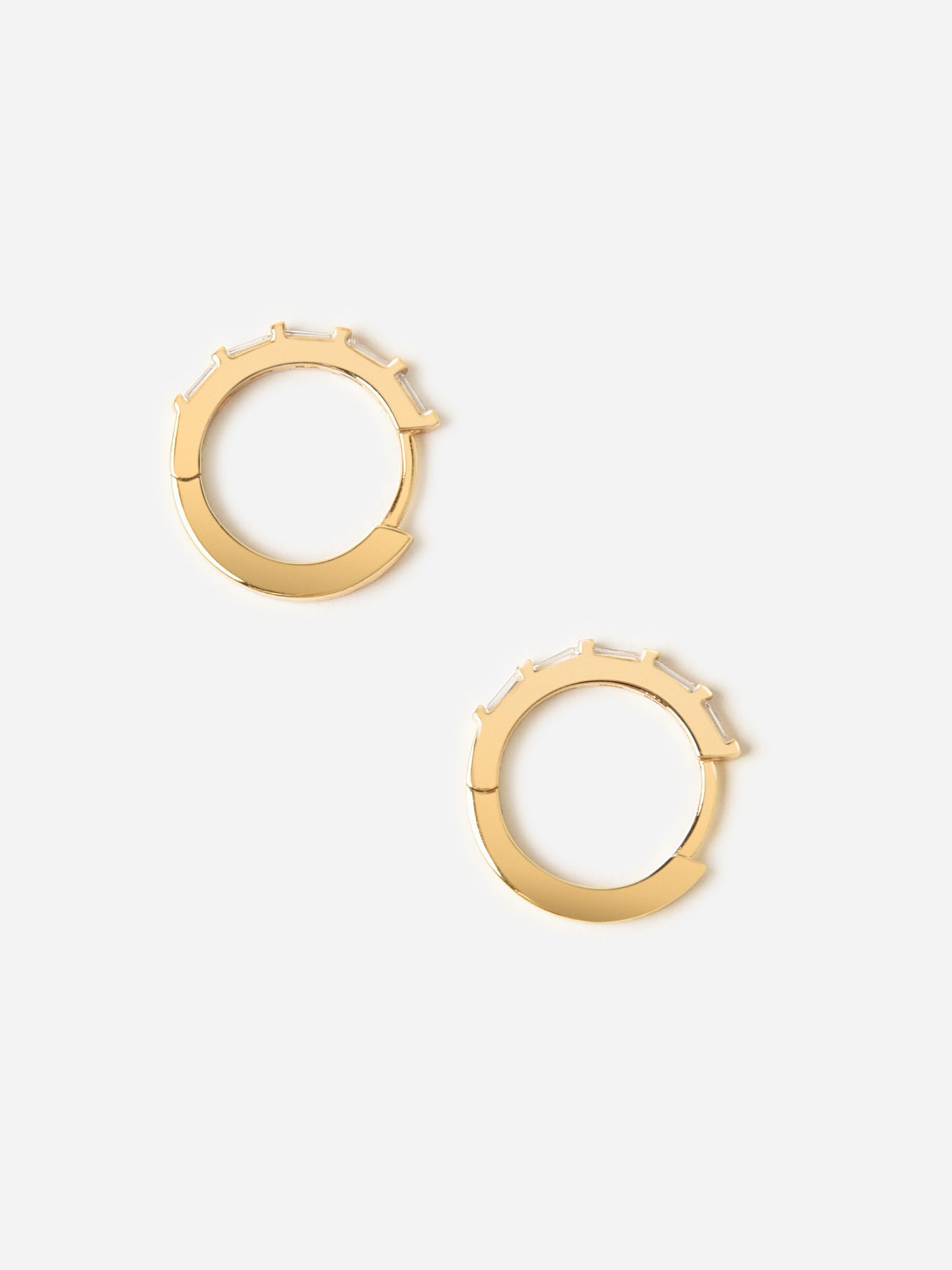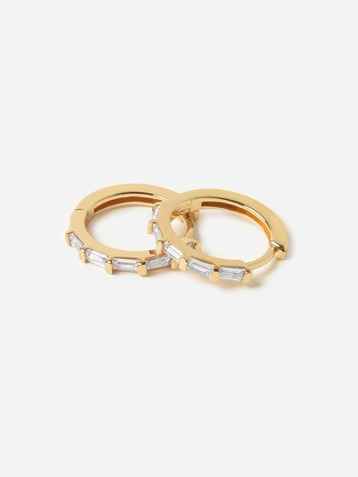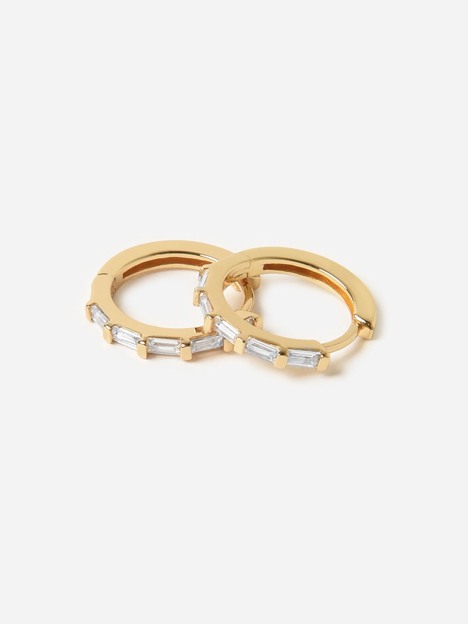 14-karat gold-plated hoop earrings with cubic zirconia baguette stones in a bezel setting.