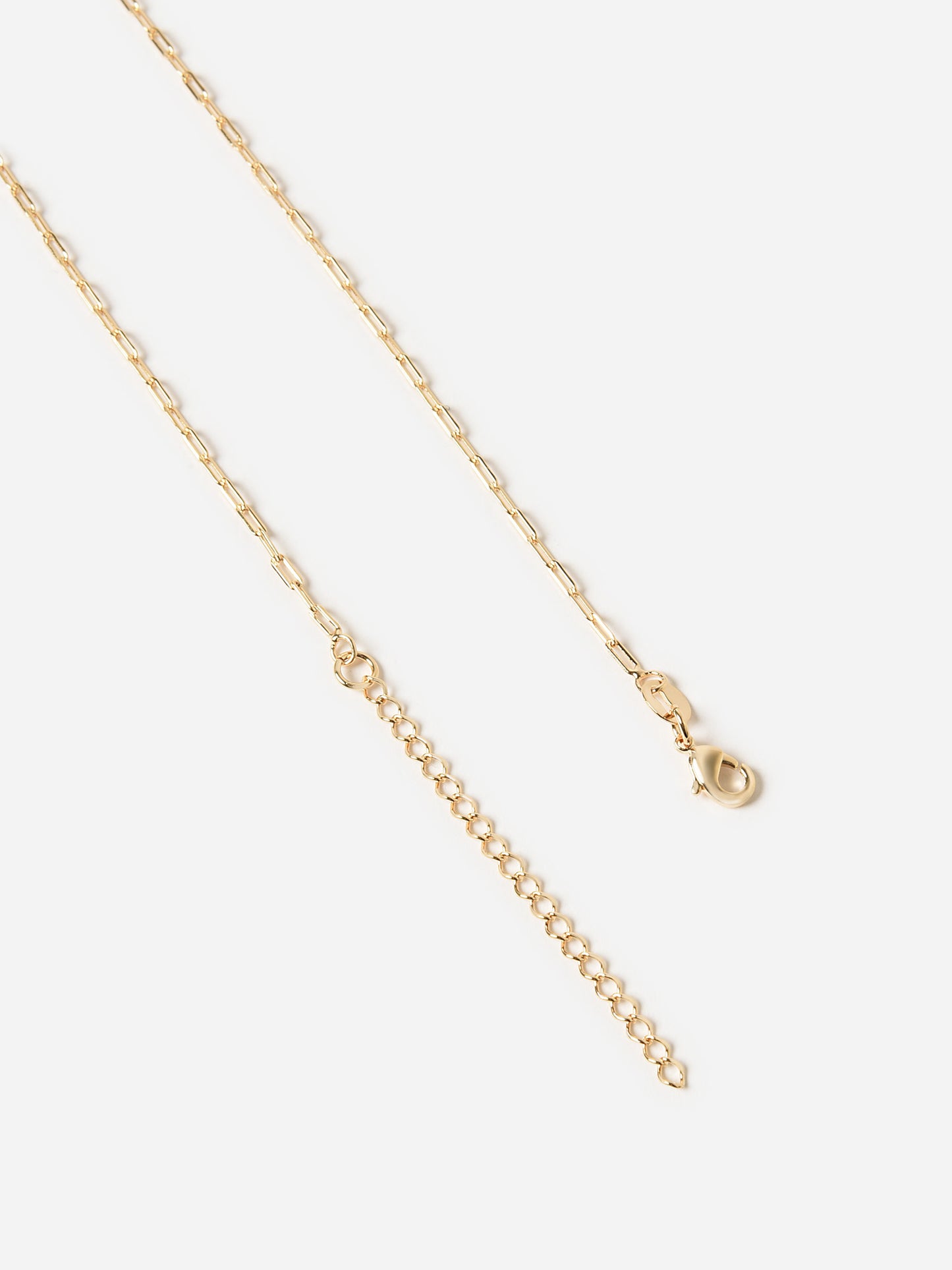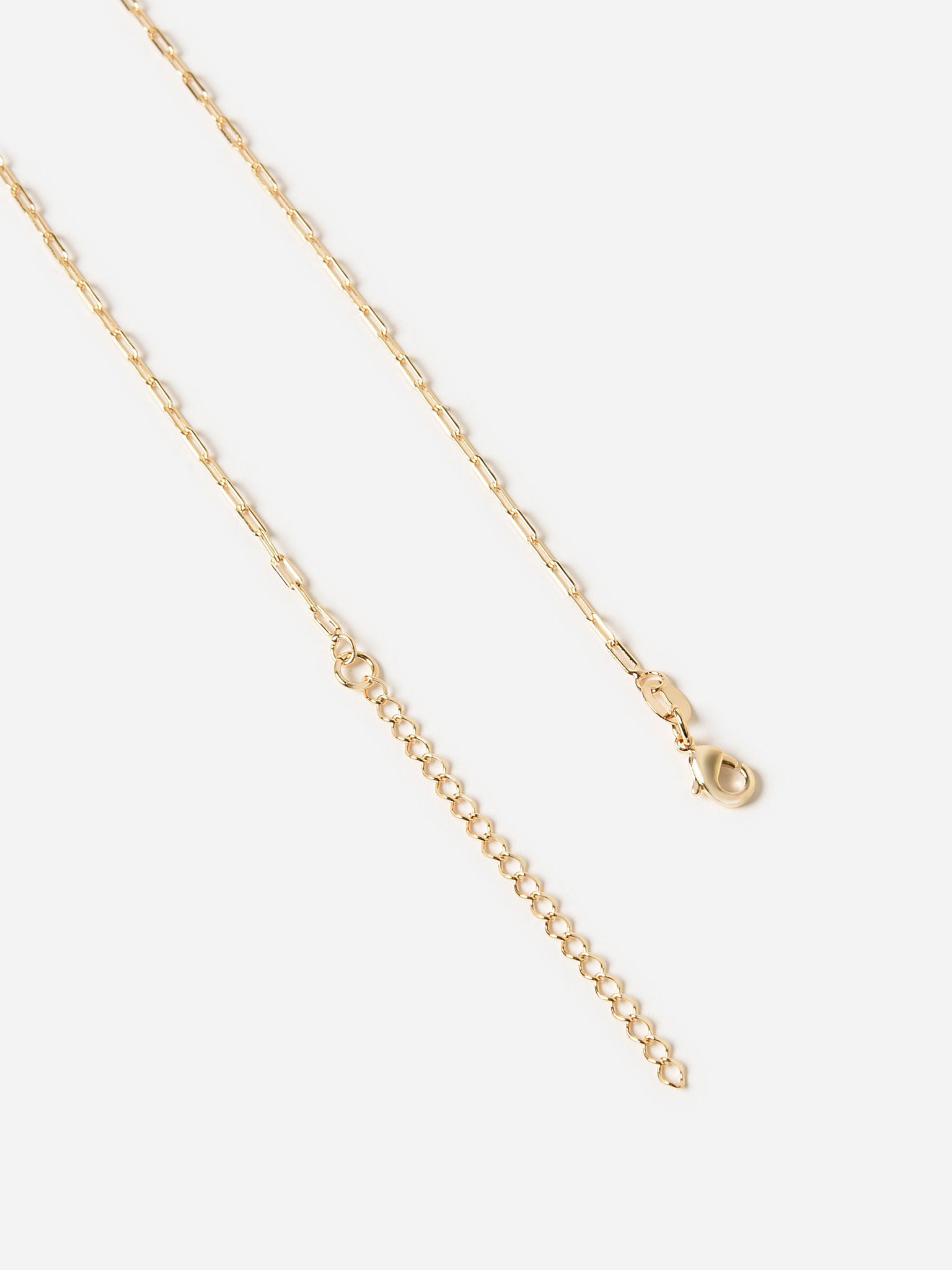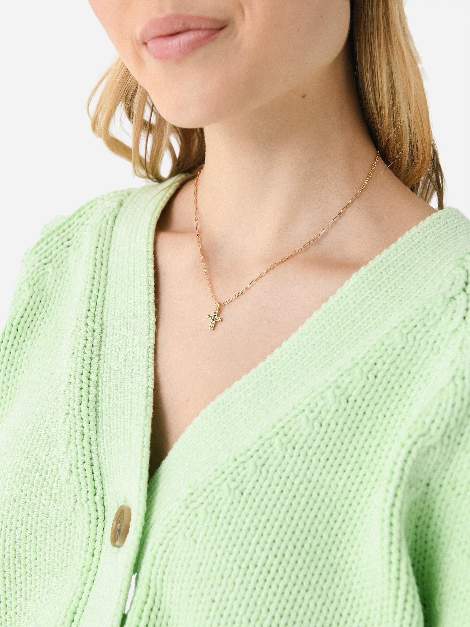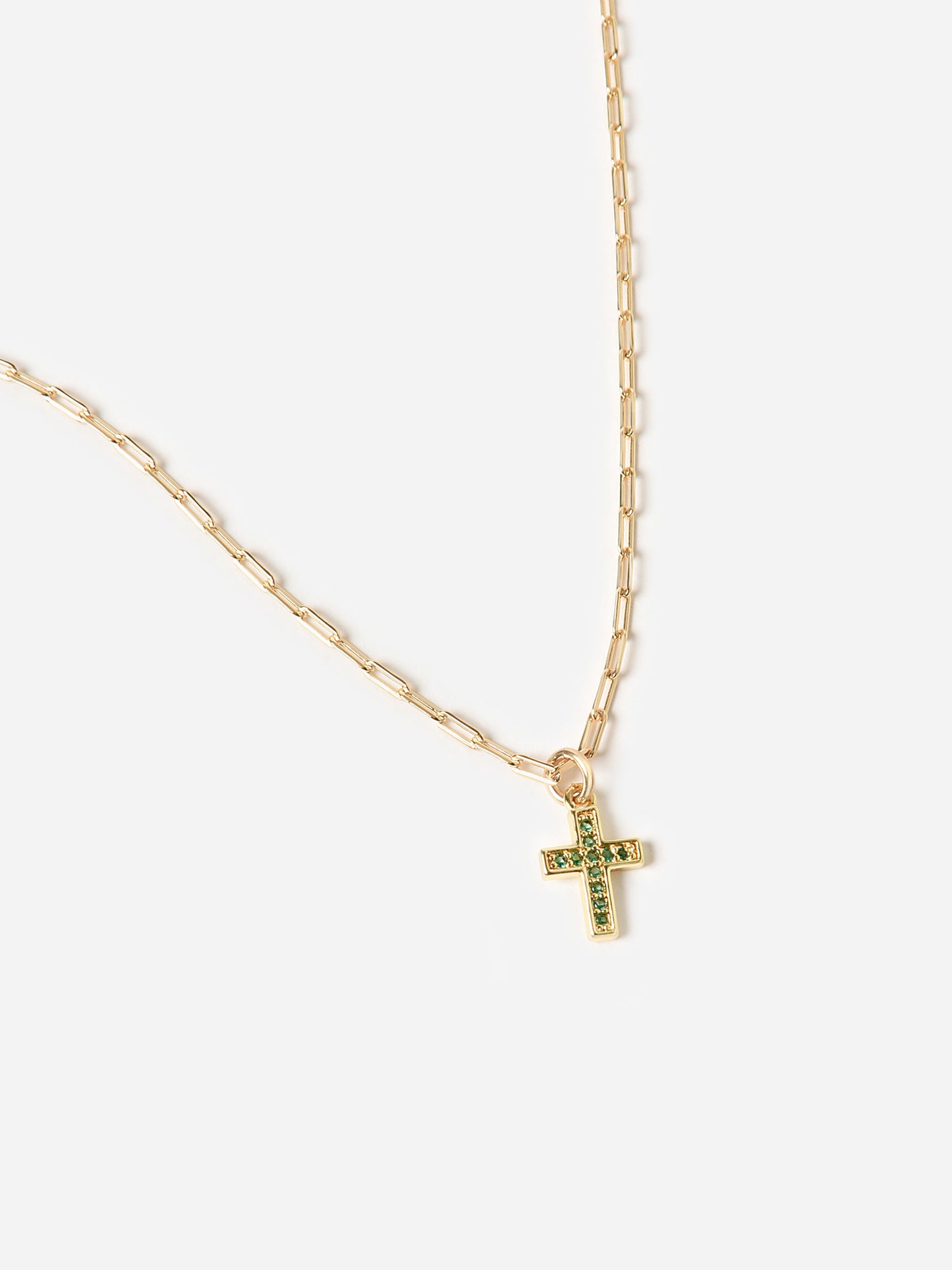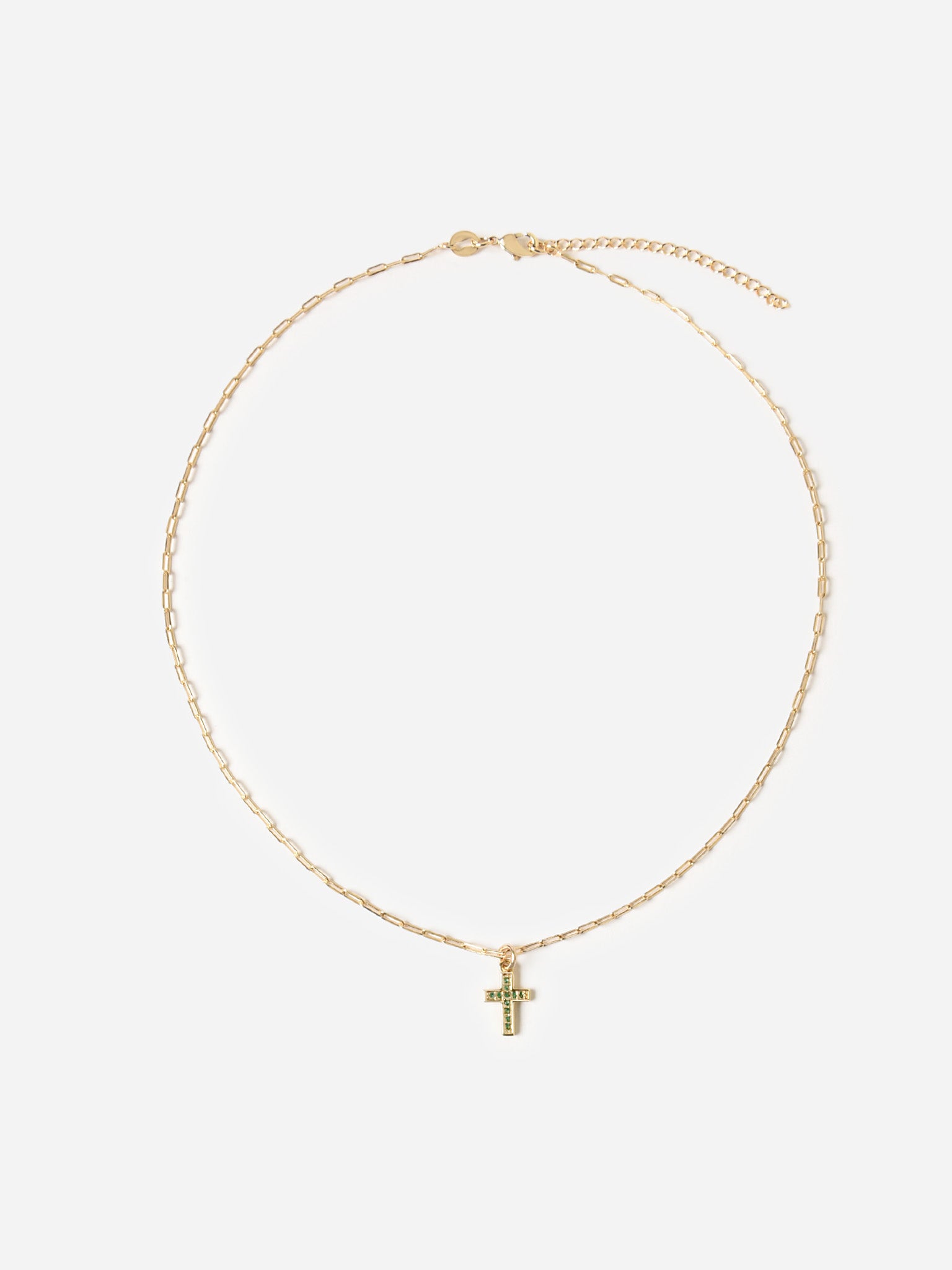 A 14-karat gold-plated brass chain necklace with a green cubic zirconia embellished cross pendant.