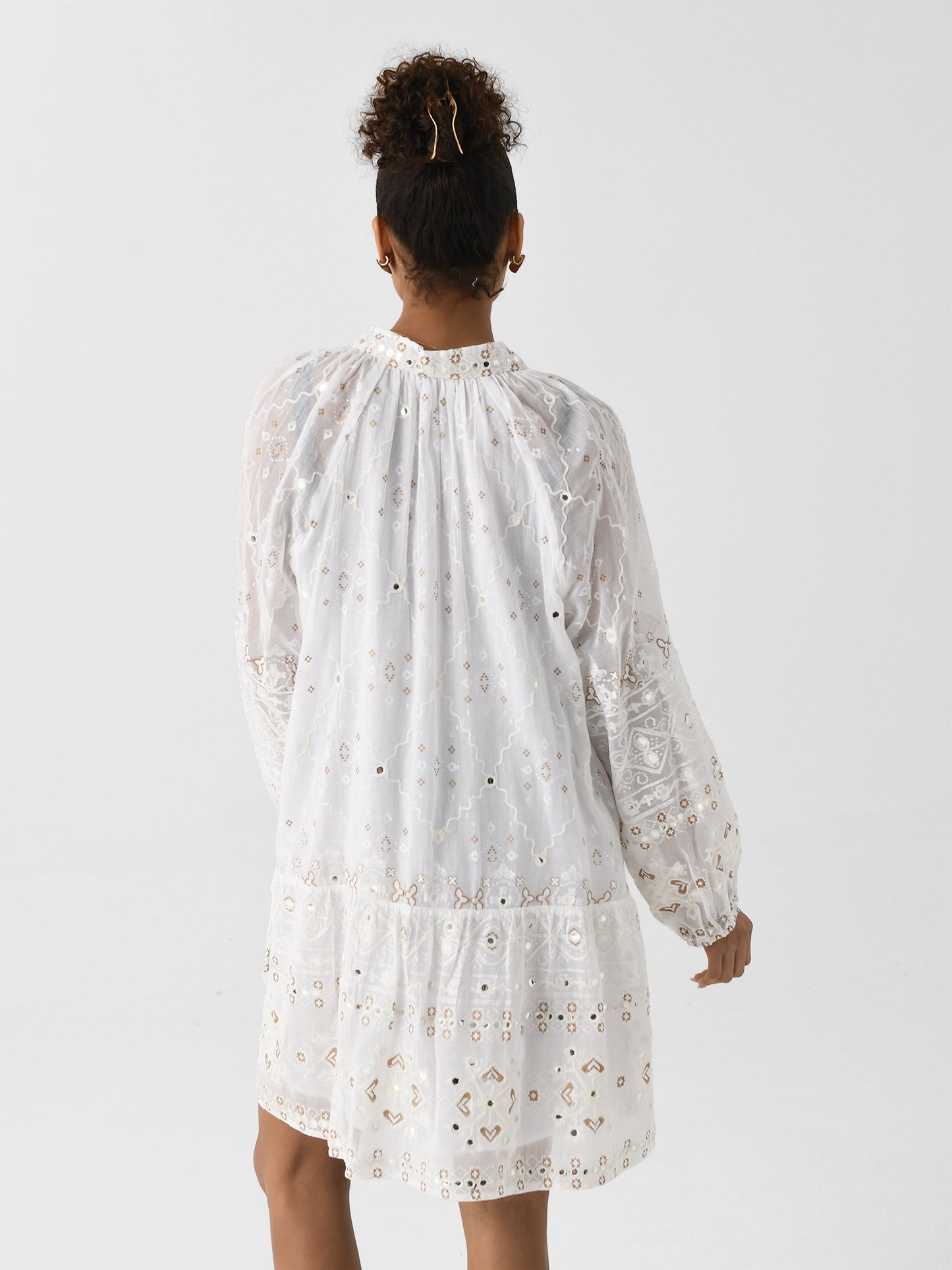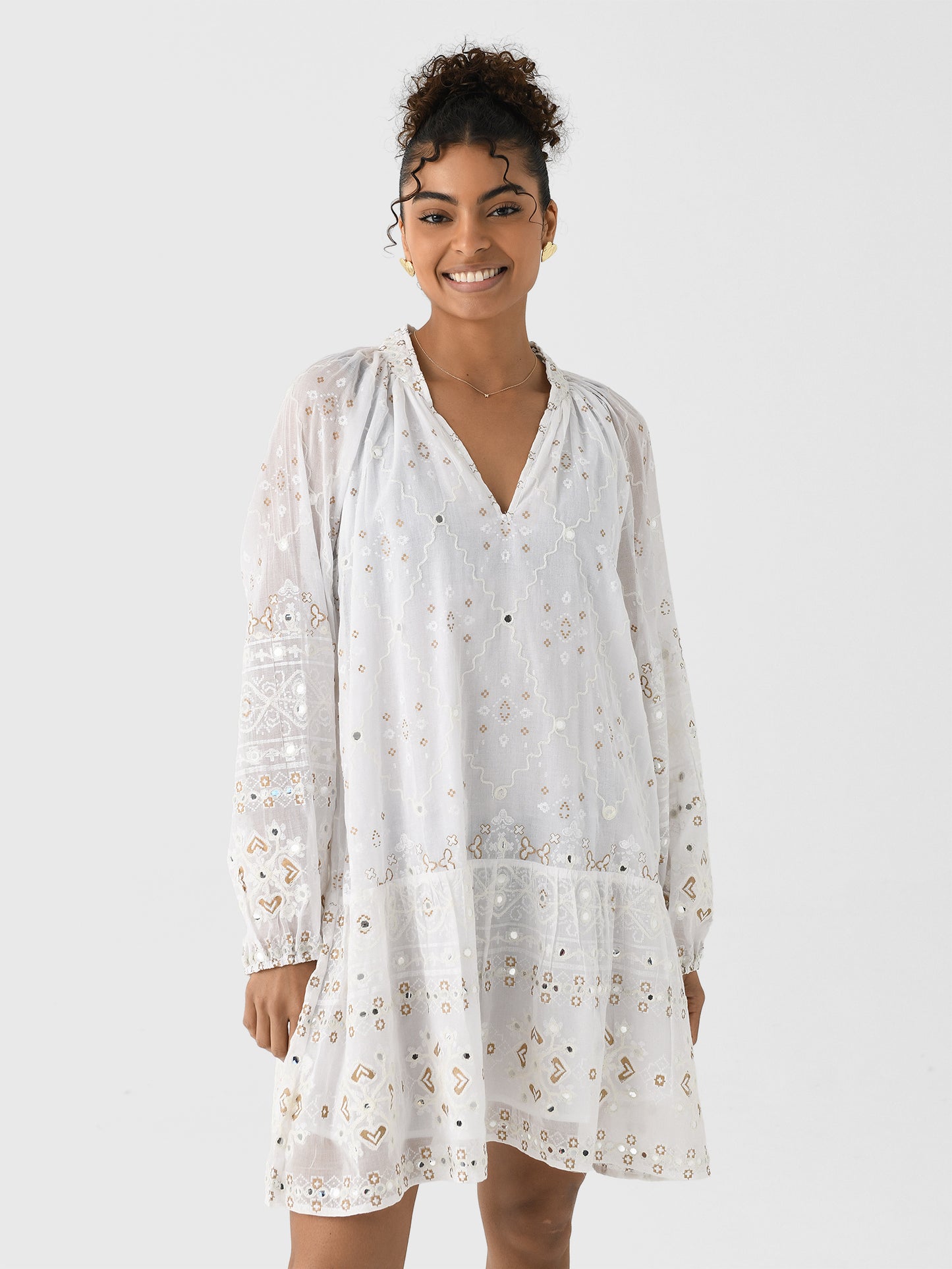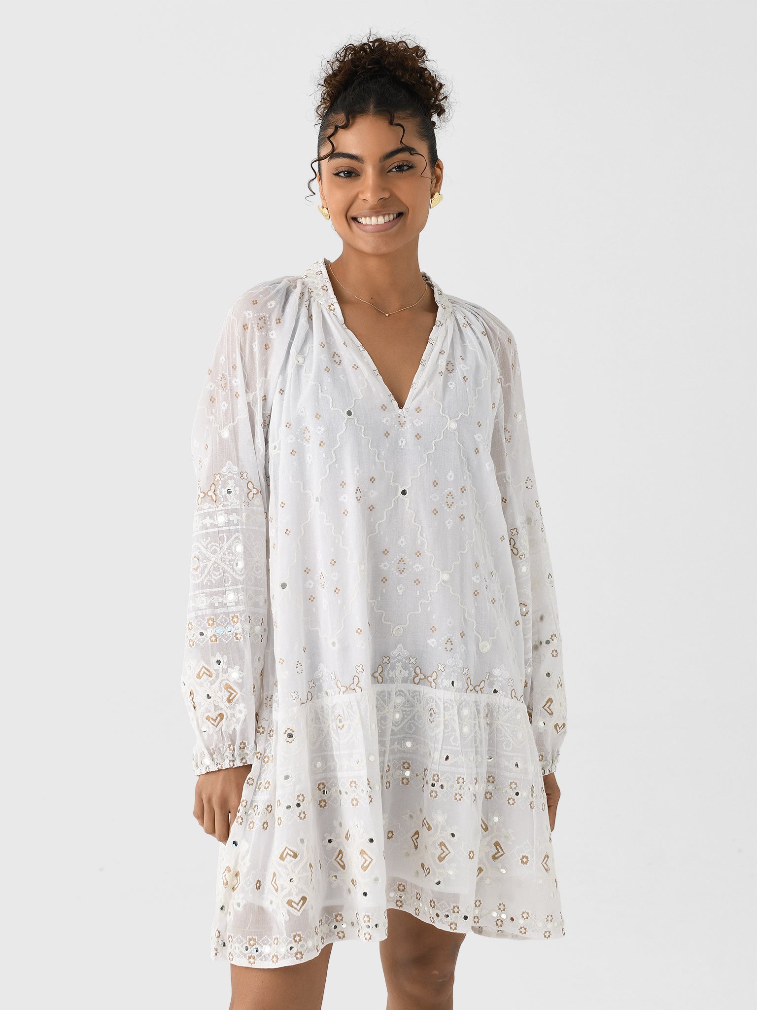 A tunic-style dress made from lightweight cotton and finished with an embroidered print and intricate mirror embellishments.