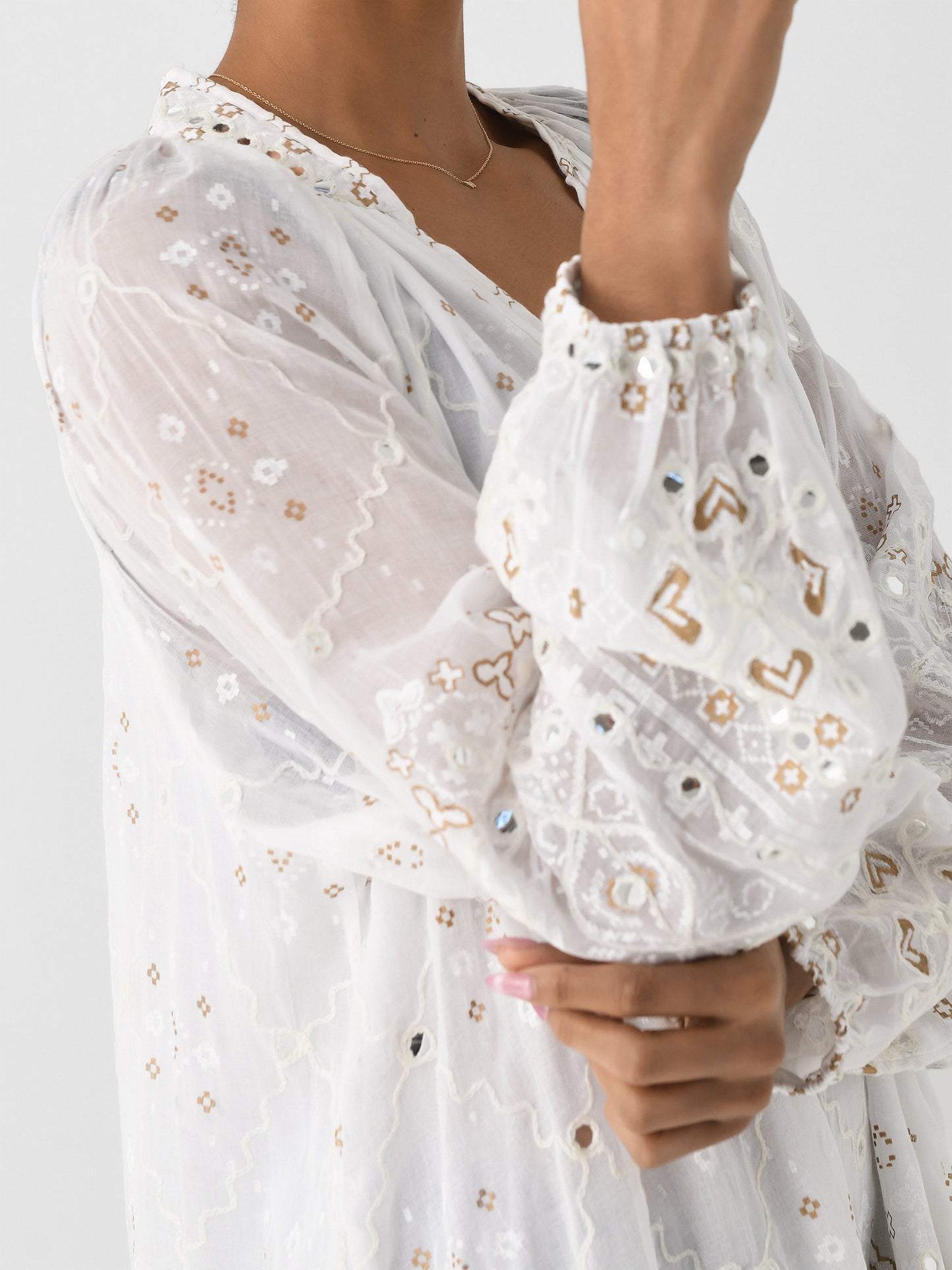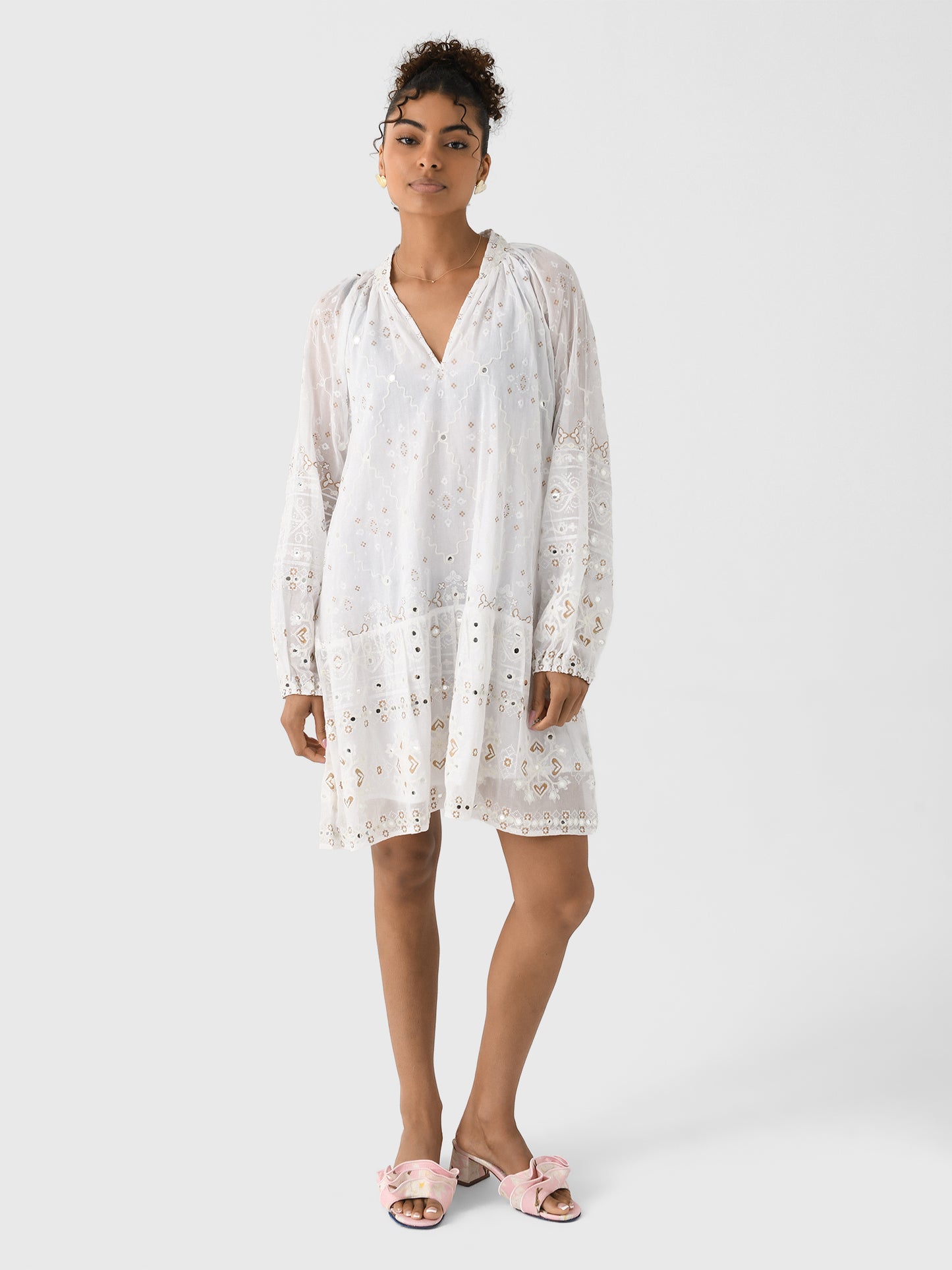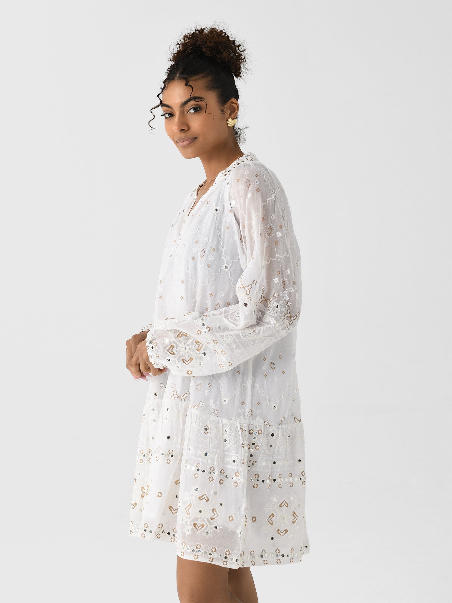 A tunic-style dress made from lightweight cotton and finished with an embroidered print and intricate mirror embellishments.