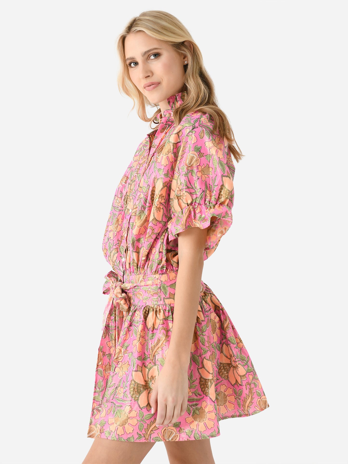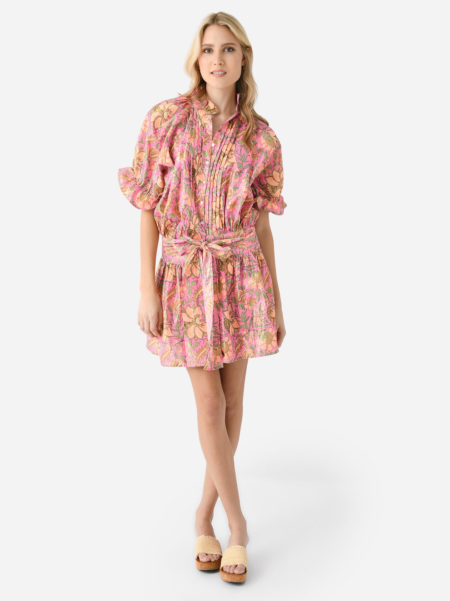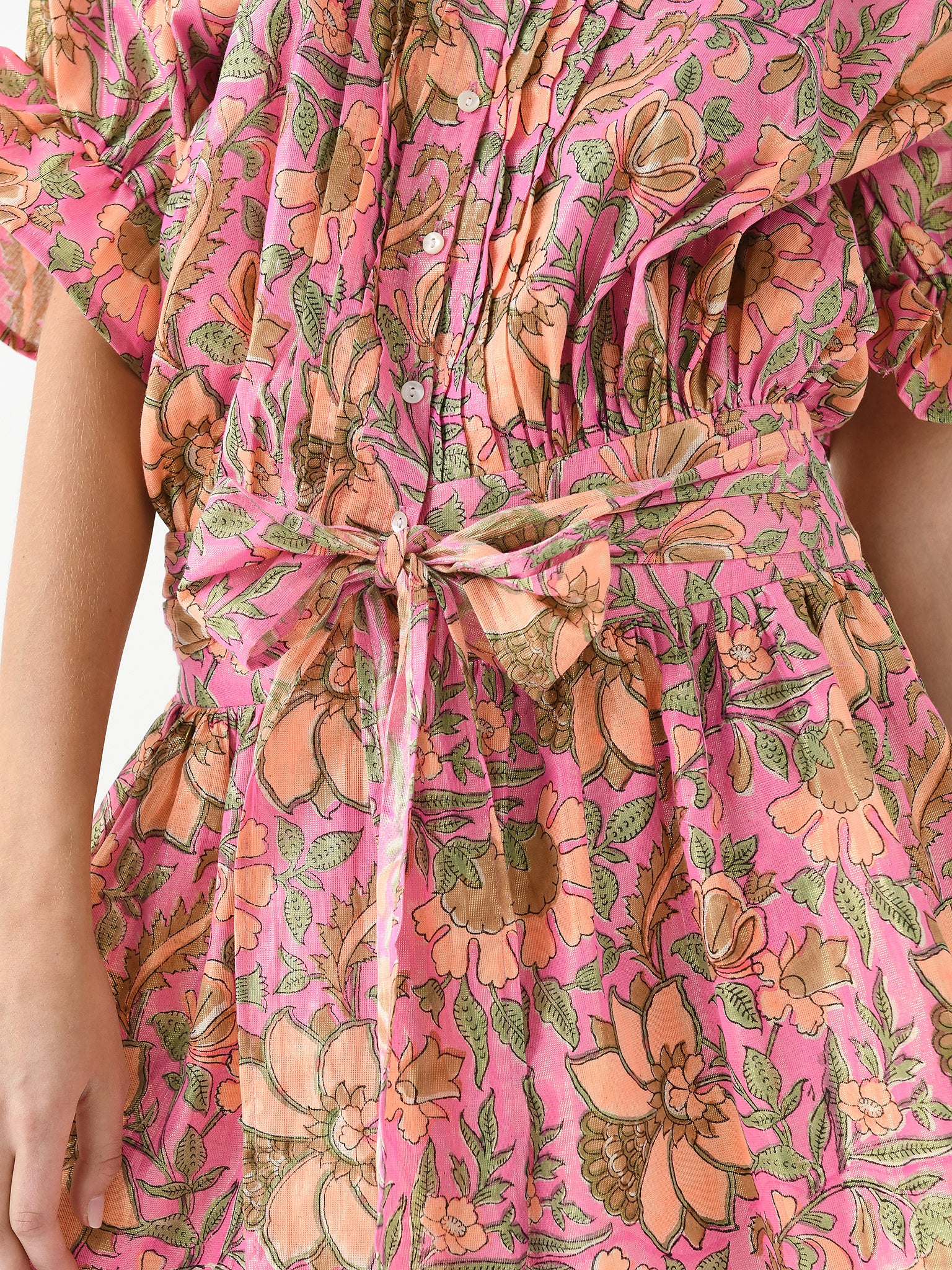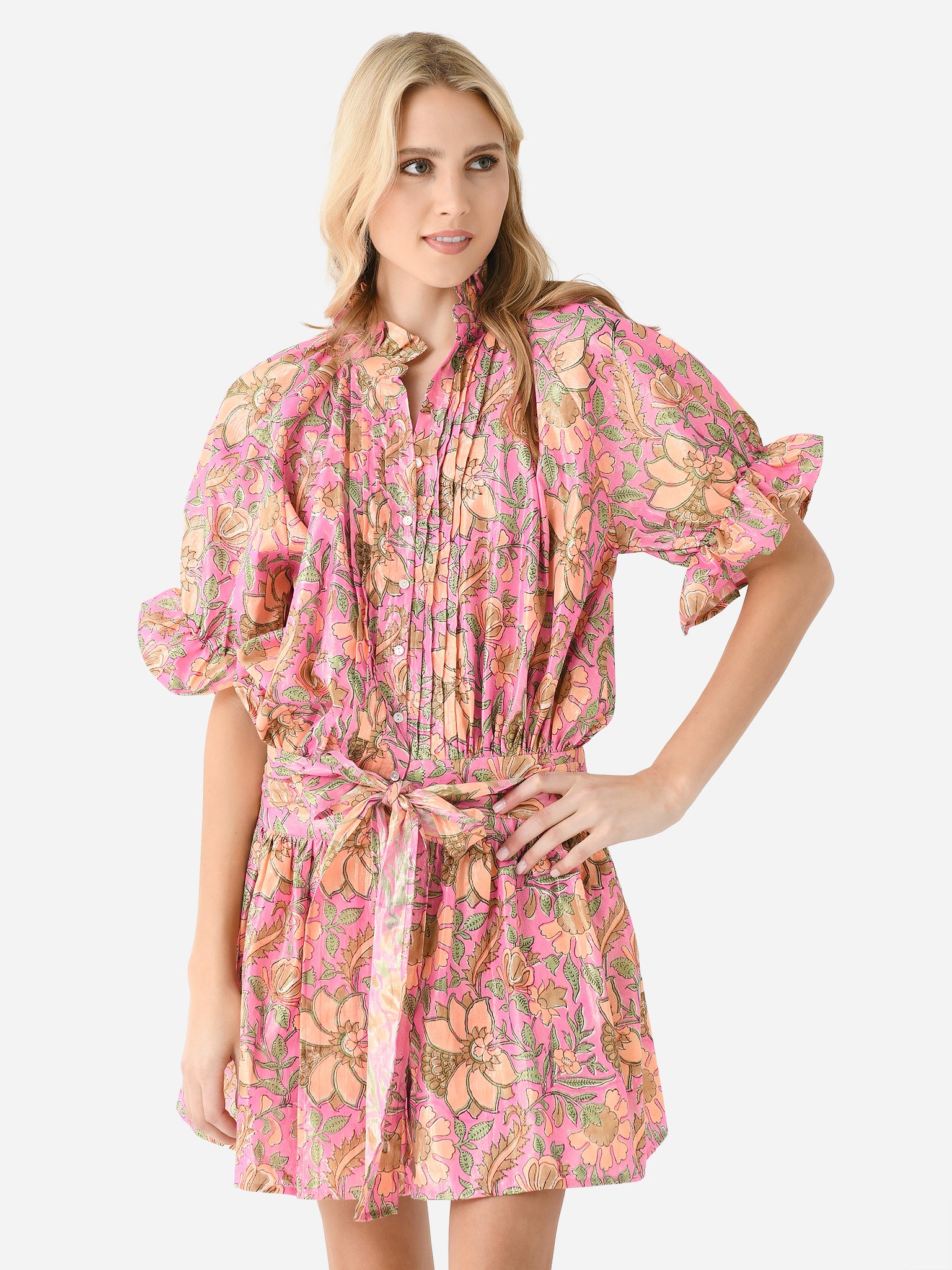 A blouson dress featuring pintuck detailing, a self-tie belt, and lamé thread throughout for a subtle shimmer.